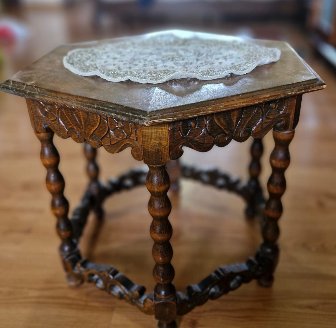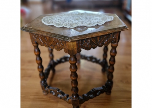 שולחן עץ מחומש עשוי בעבודת יד, עם עיטורי גילוף עשירים בדפוס עלים