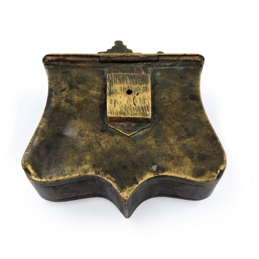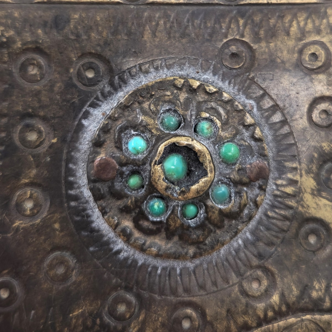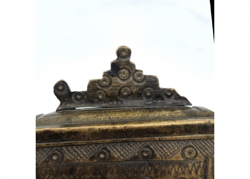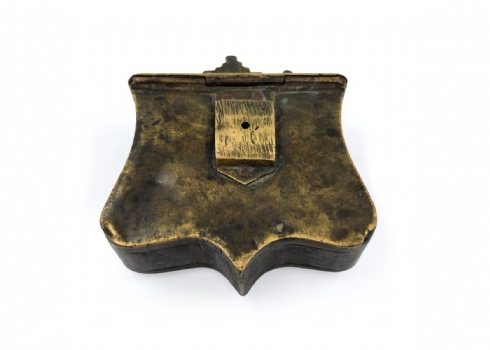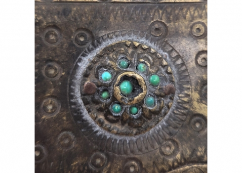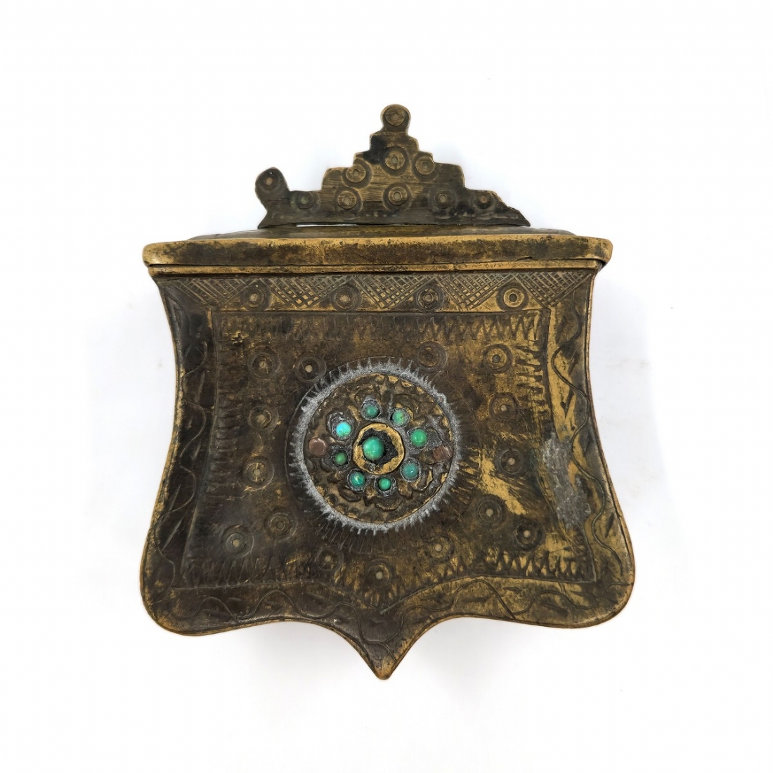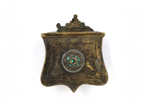 נרתיק אבק שריפה עותומאני מהמאה ה-19, עשוי פליז, מעוטר בחזיתו ומשובץ אבני טורקיז
