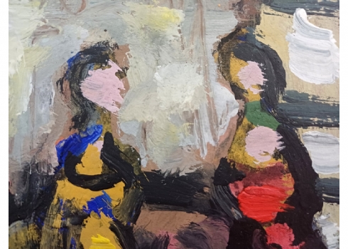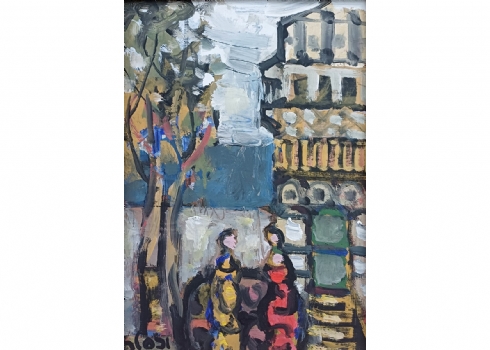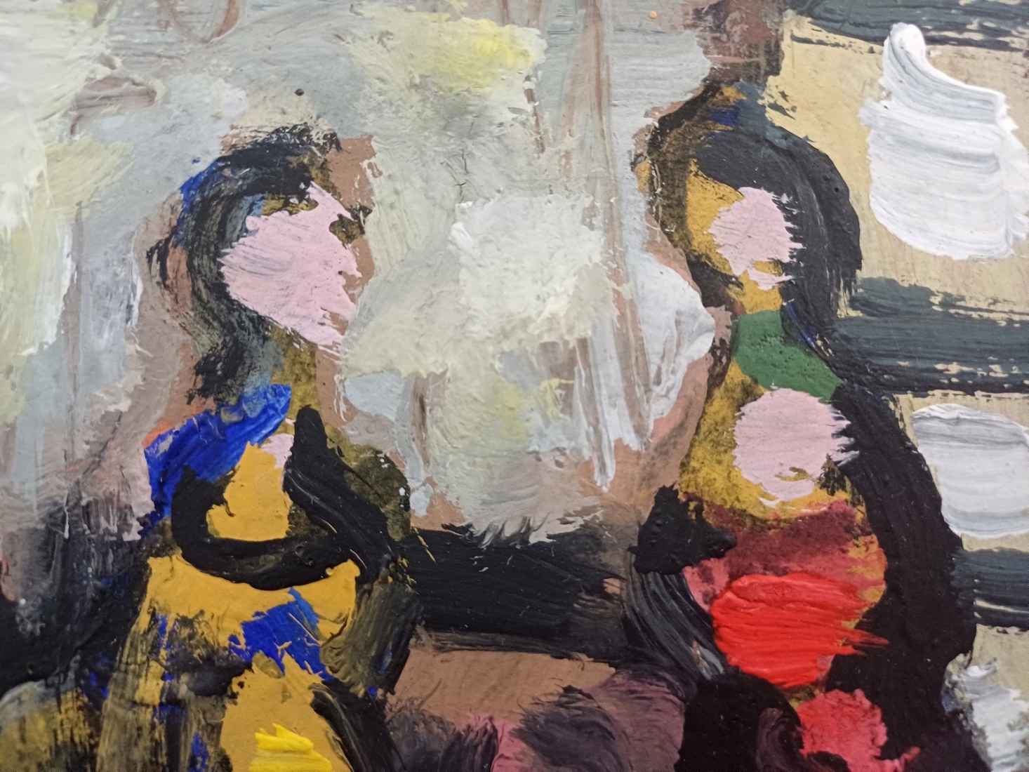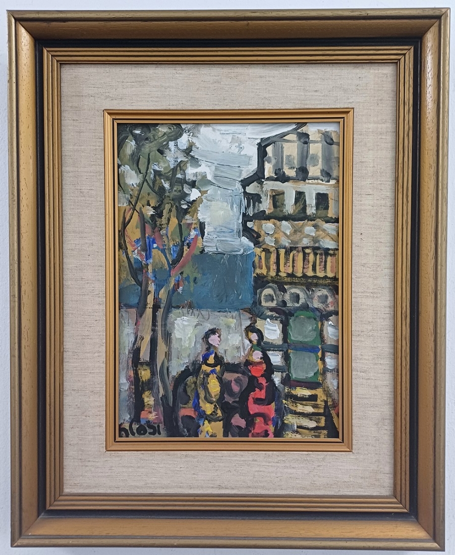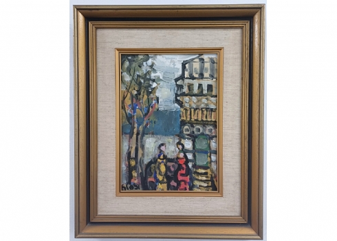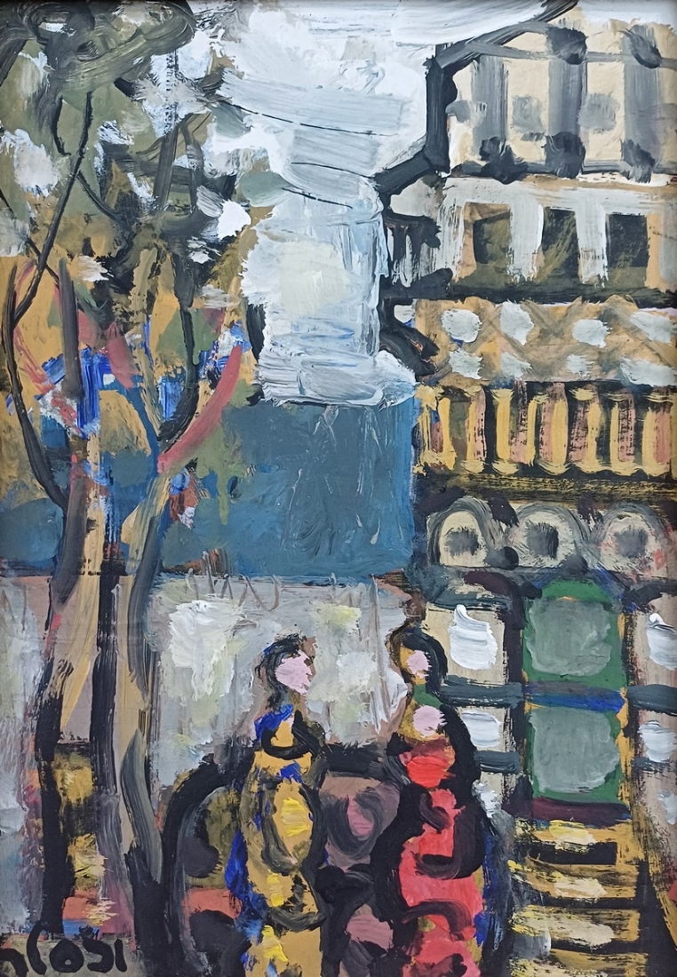 יעקב וכסלר (Jacob Wexler) - 'שתי נשים על ספסל בחיפה' - שמן על לוח, חתום