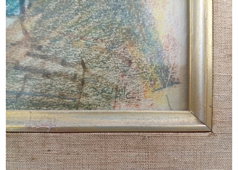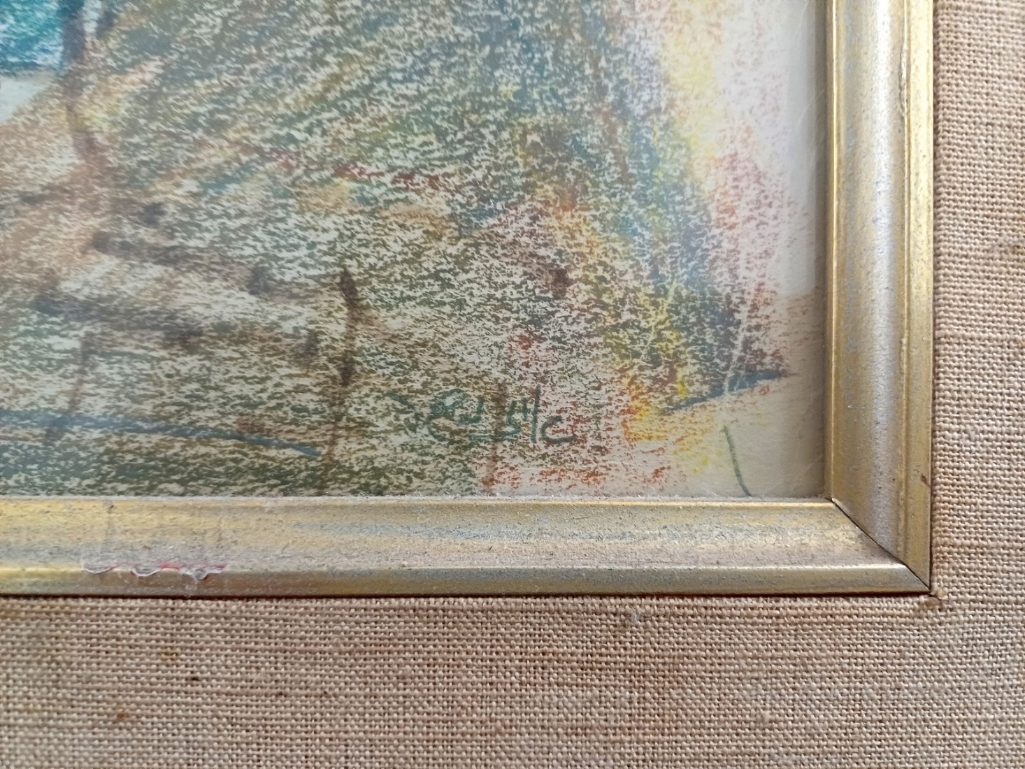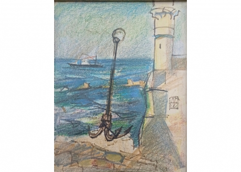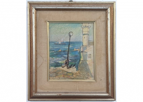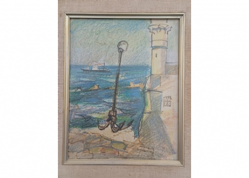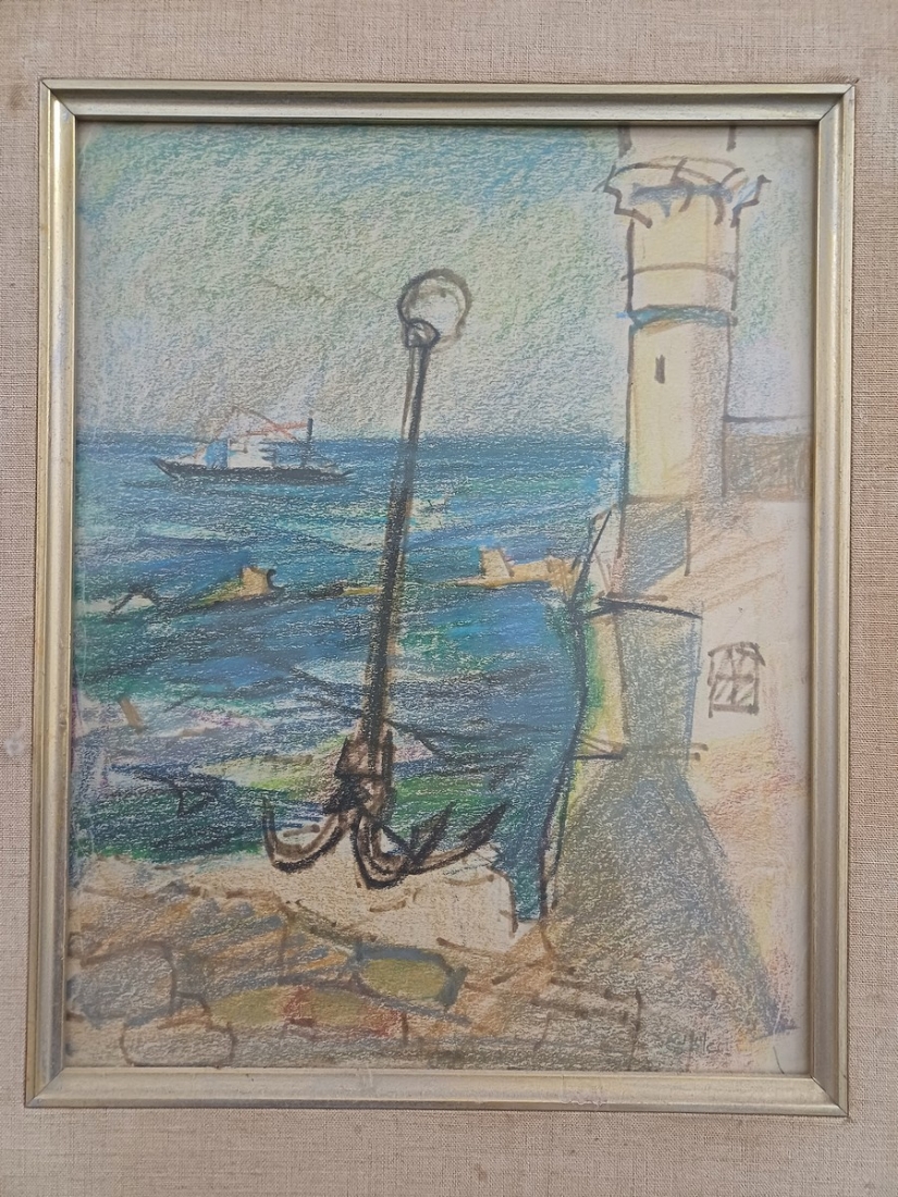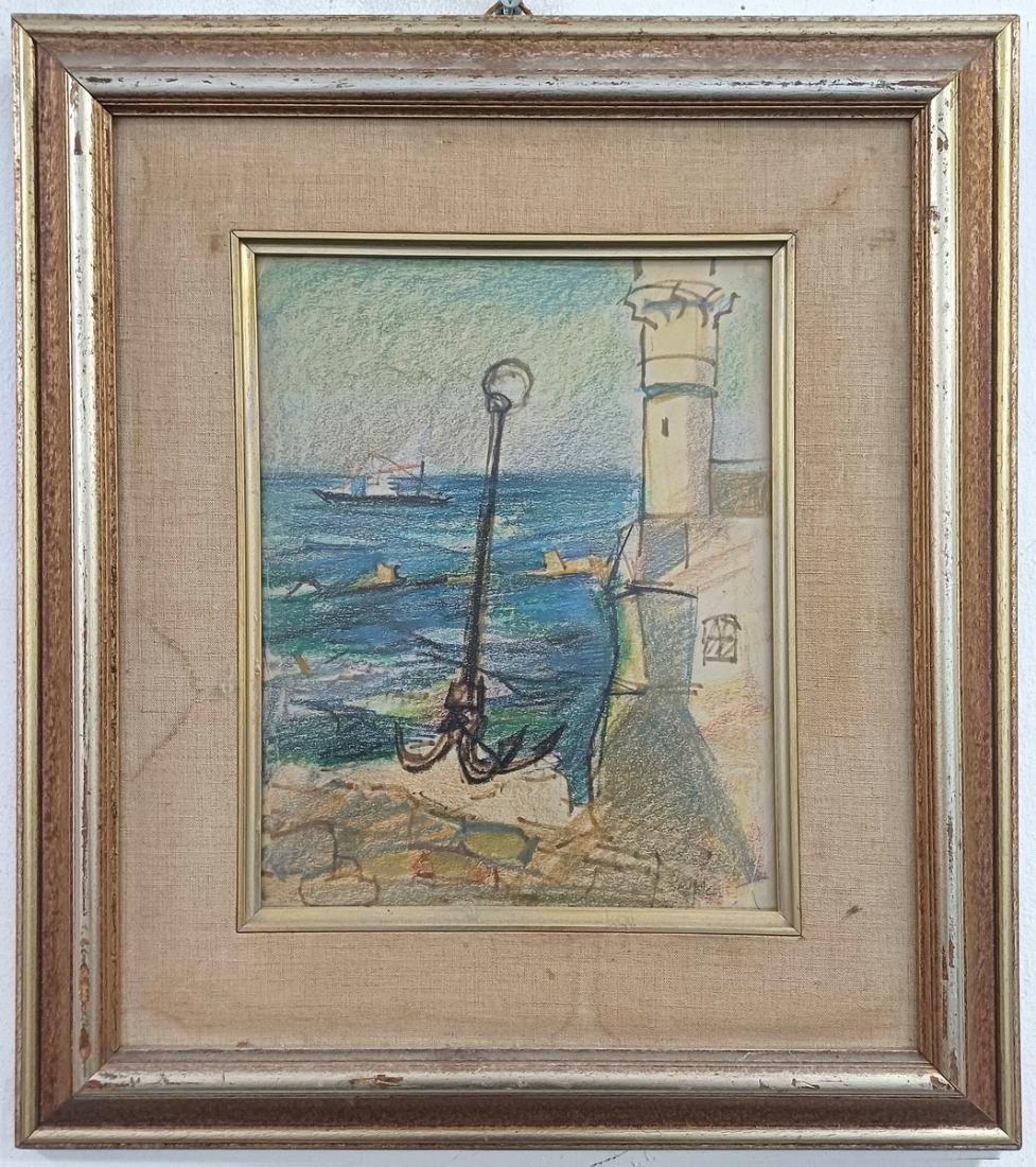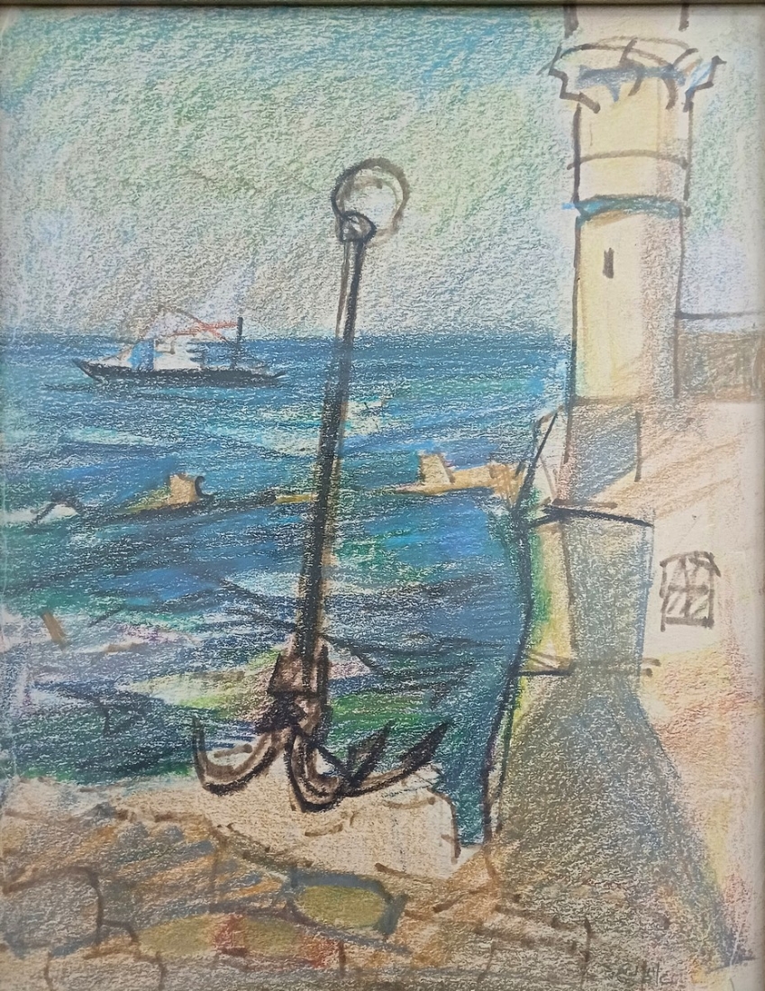 יעקב איזנשר (Jacob Eisensher) - 'עוגן בנמל יפו' - רישום טוש וגירי פנדה על נייר