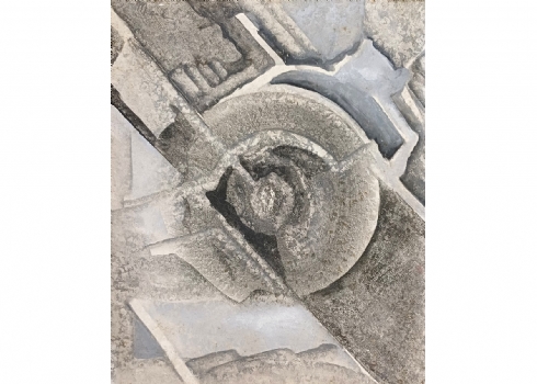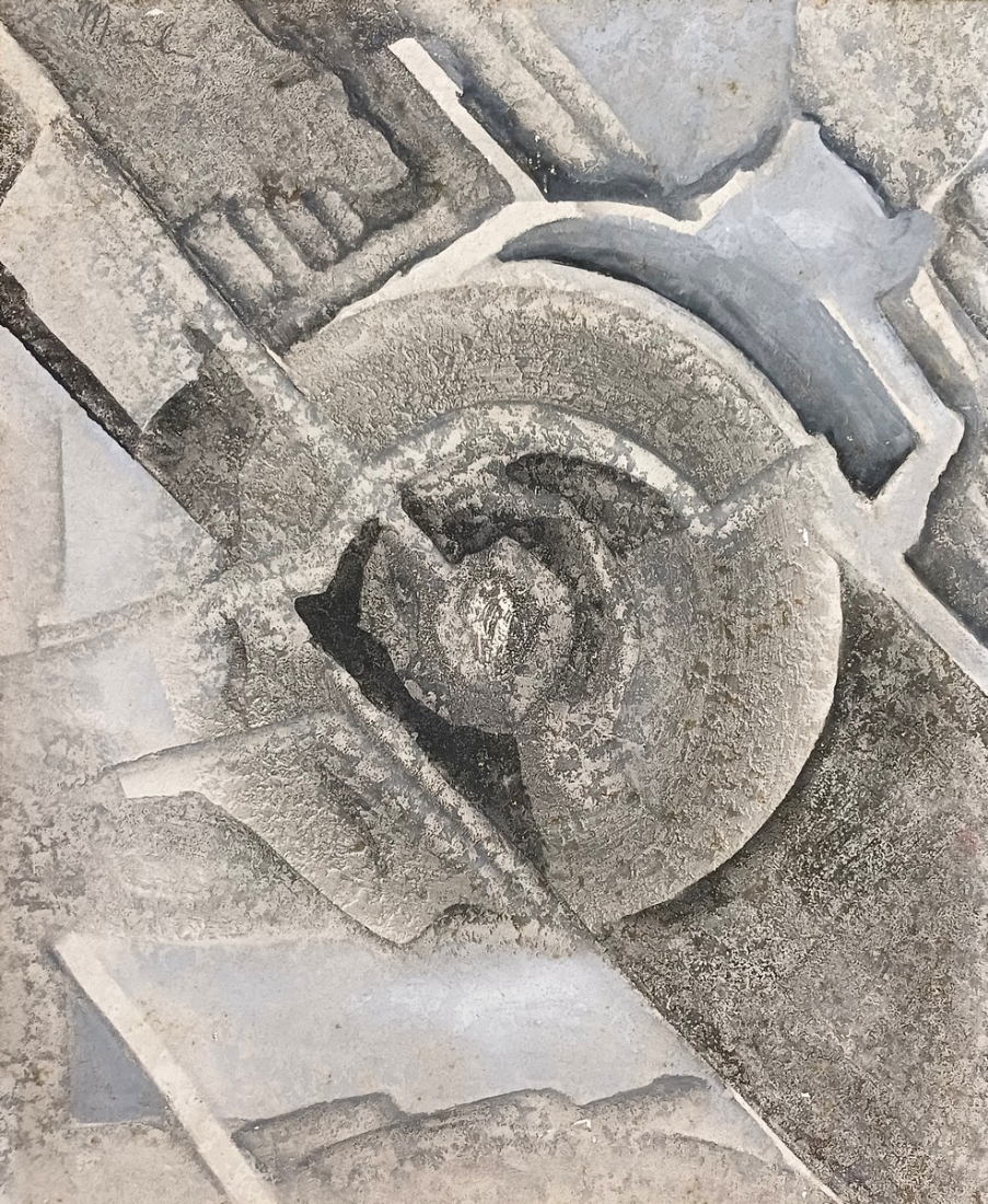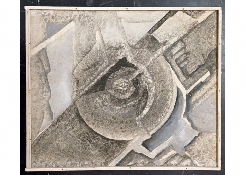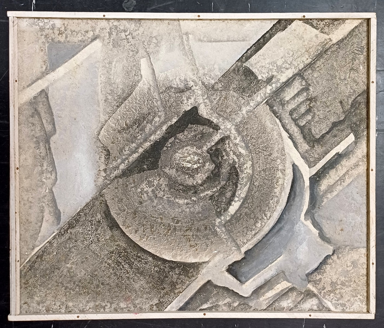 'אוונגרד של אגרוף אפור' - ציור שמן על לוח, חתום ונושא כיתוב בגב הציור, אמן לא מזוהה