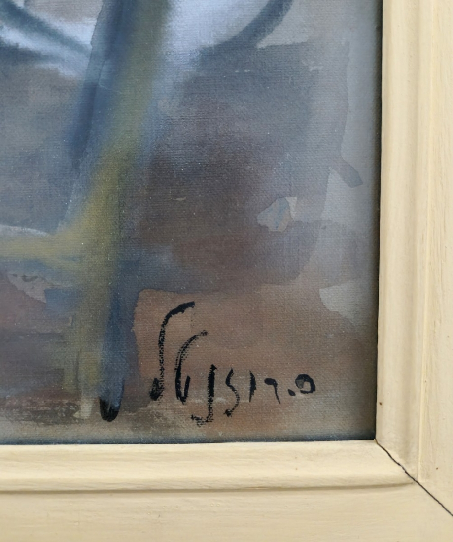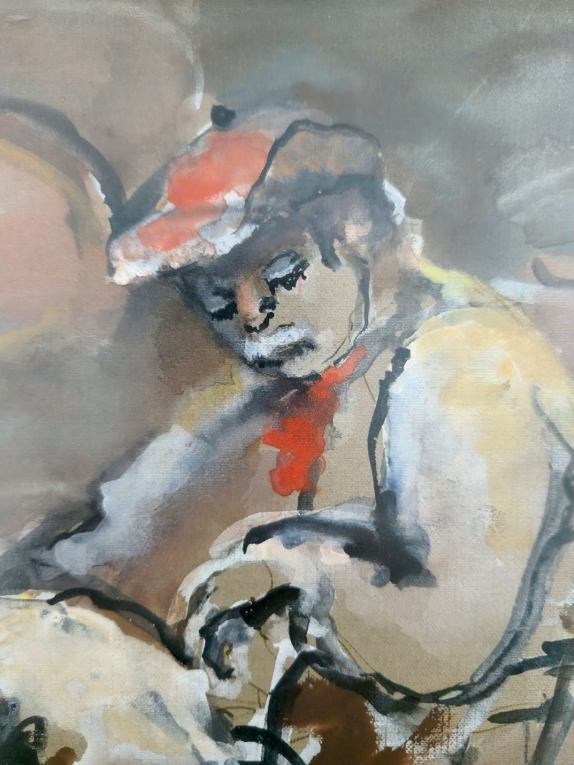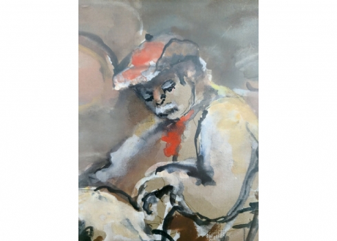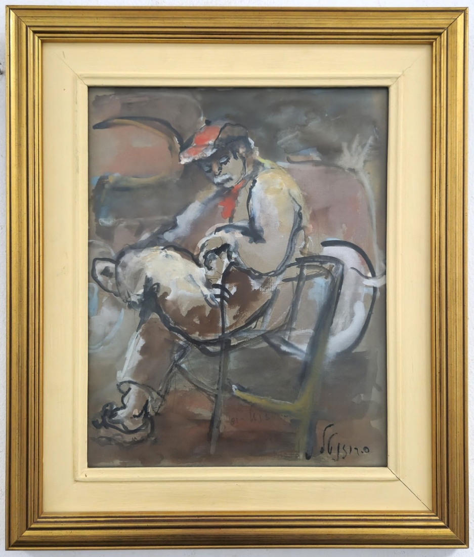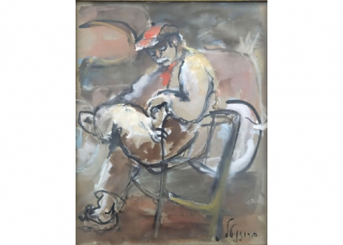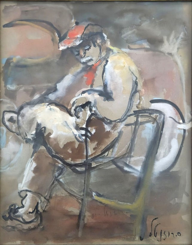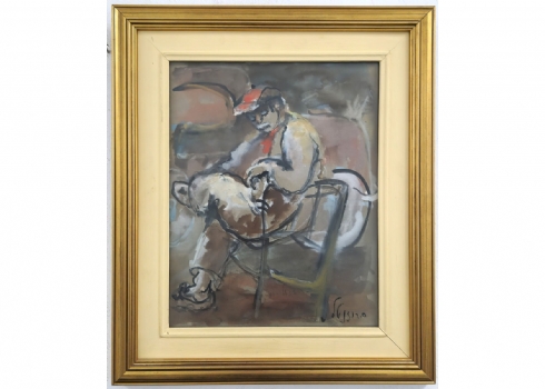 'גבר עם כובע אדום יושב על כיסא' - אקוורל על נייר, חתום רוזנטל