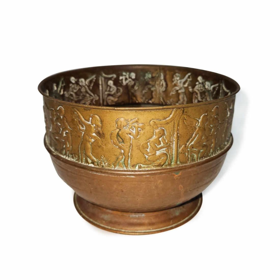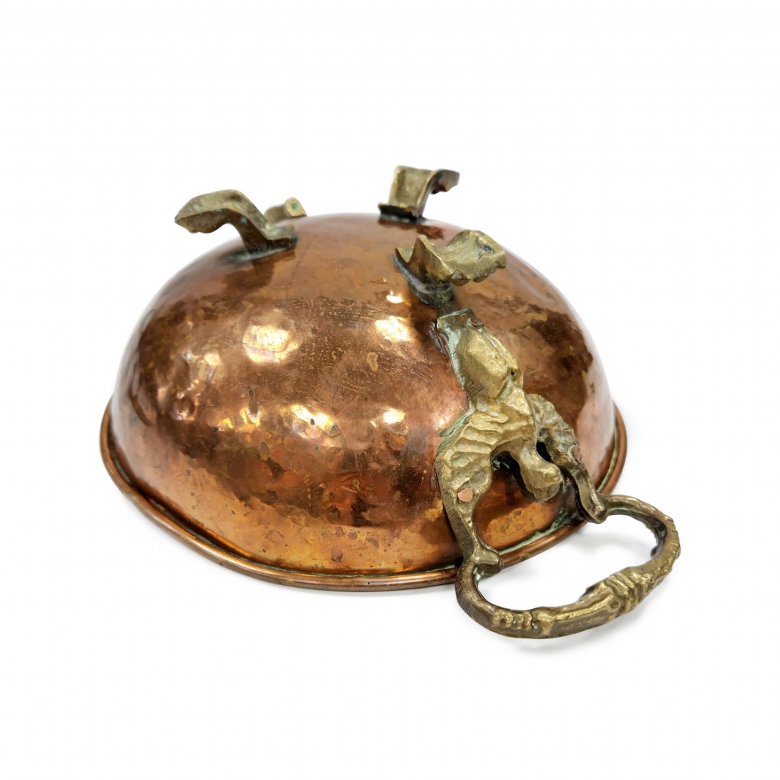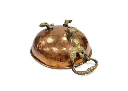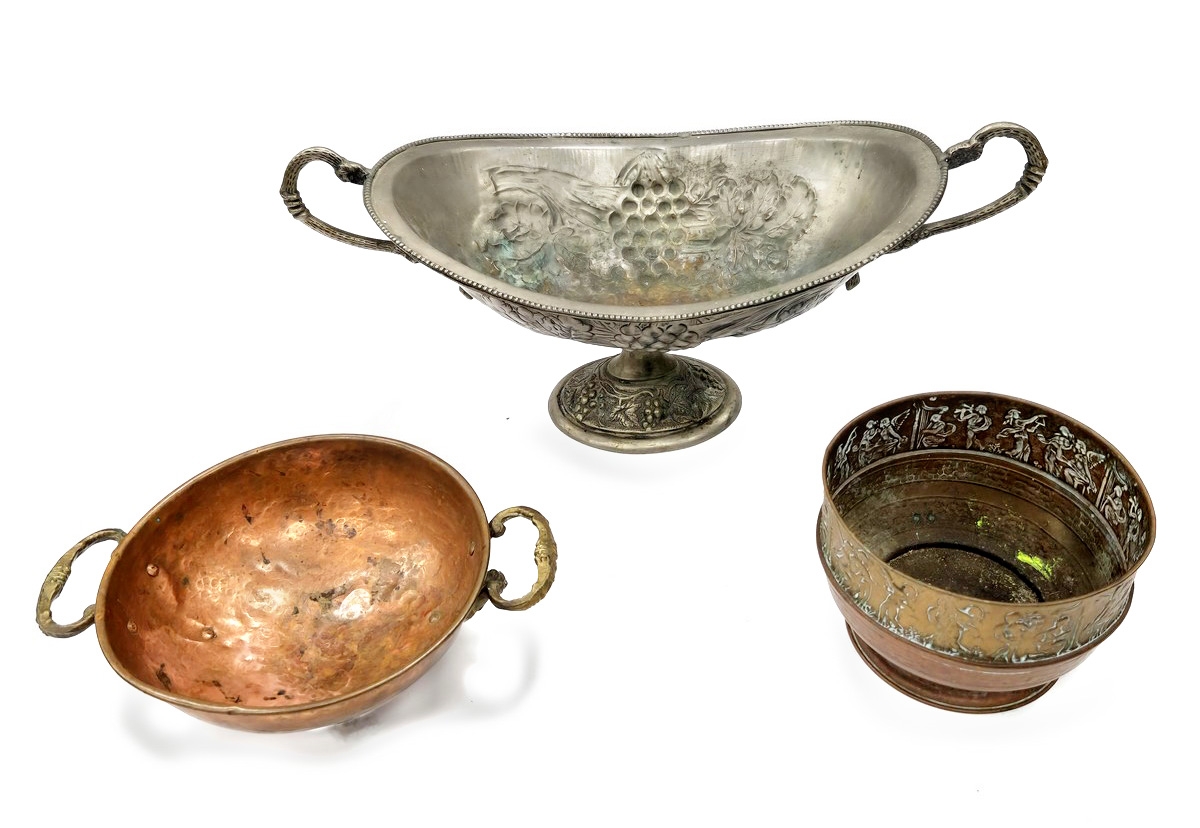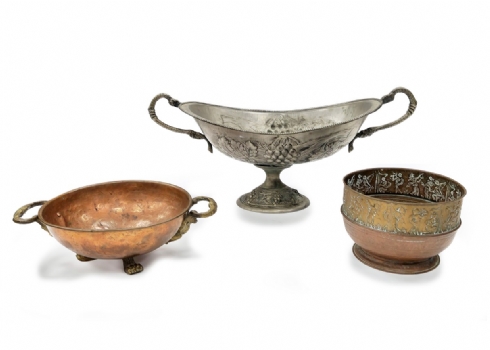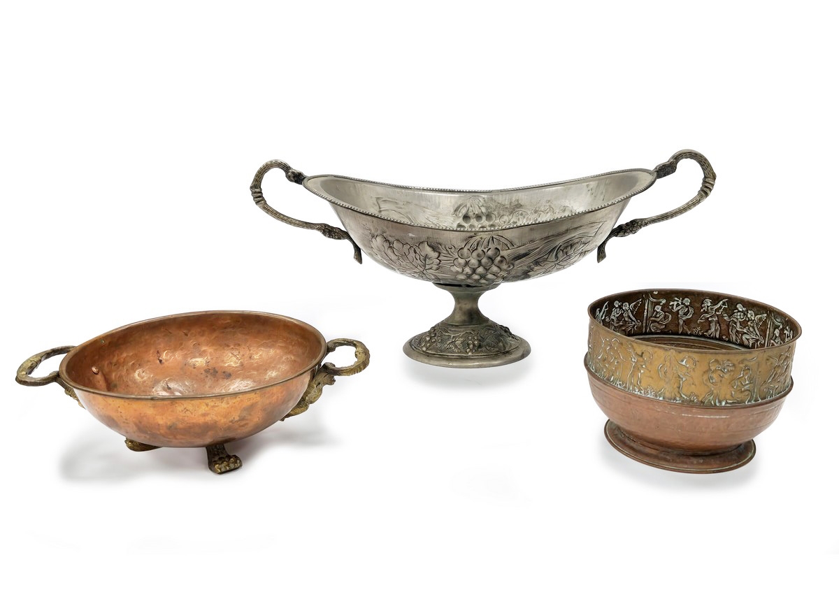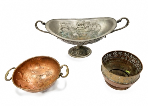 שלושה כלי נוי עשויים מתכת (נחושת ופליז) אחד מצופה בדיל