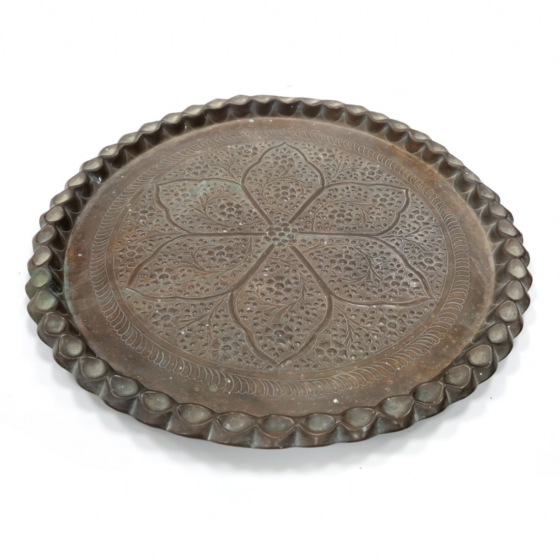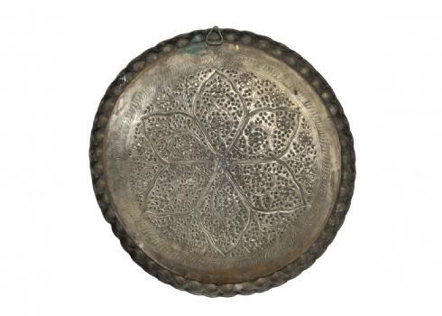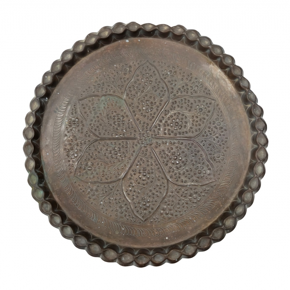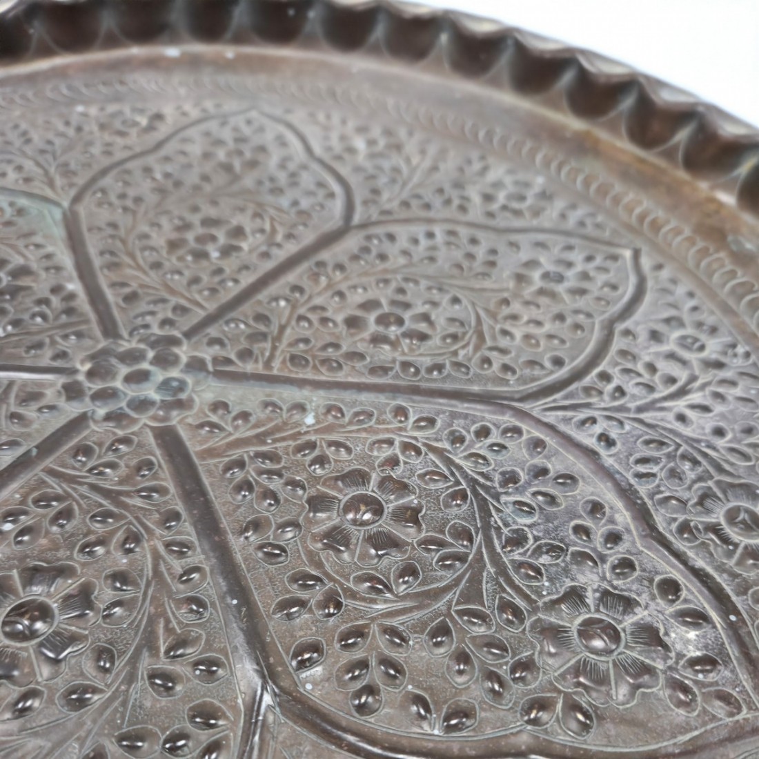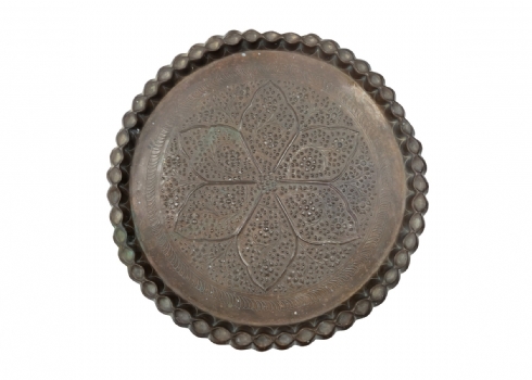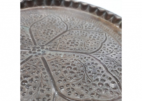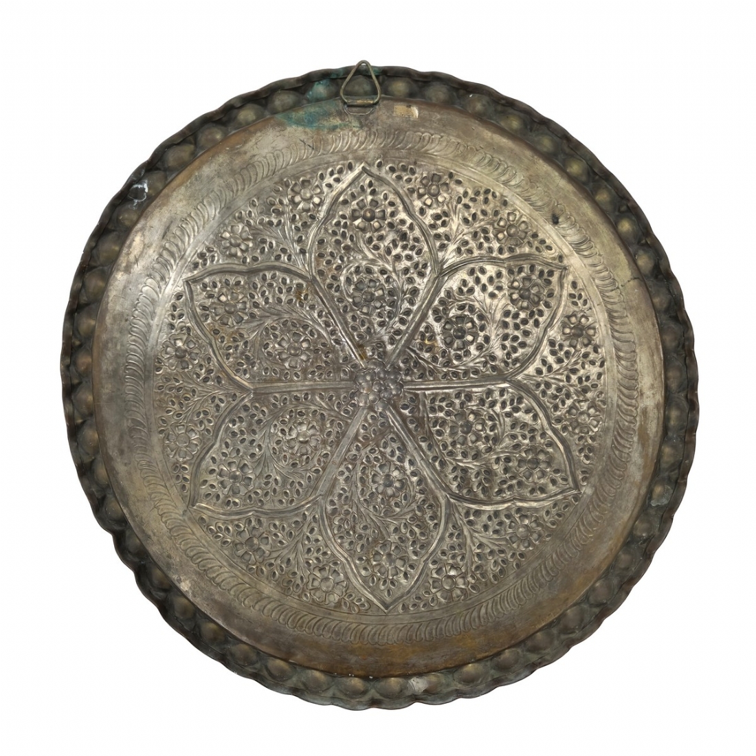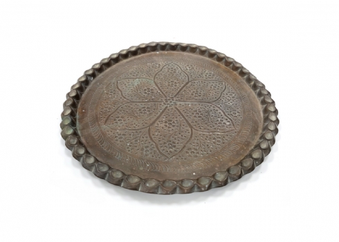 מגש נחושת לתלייה על הקיר מעוטר בעבודת ריקוע ידנית בדגם פרח