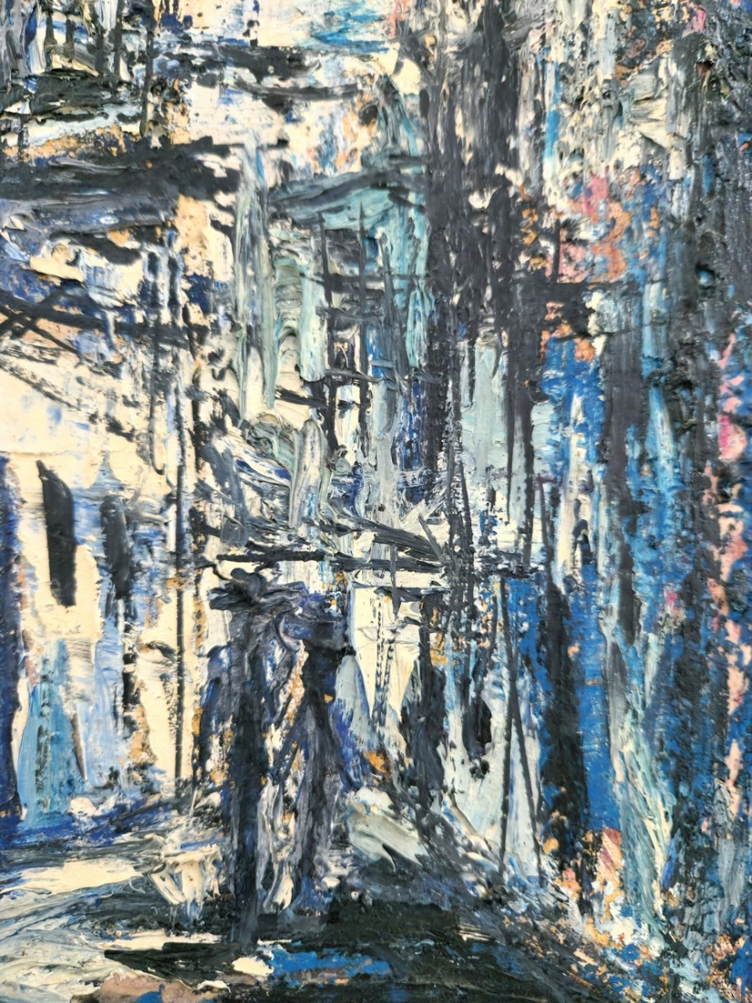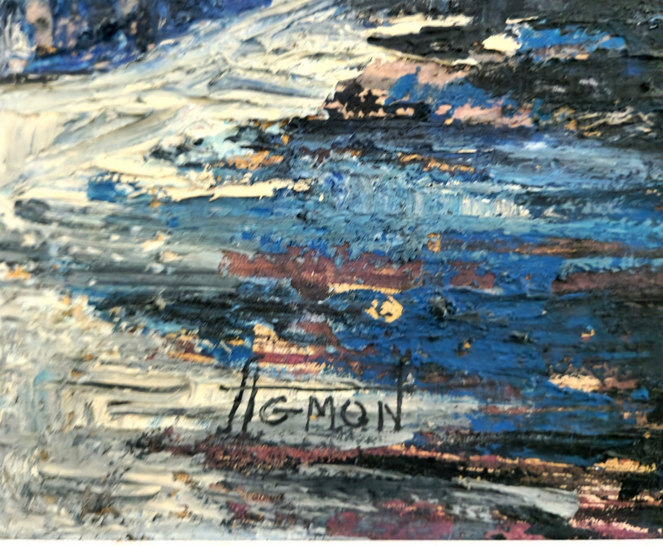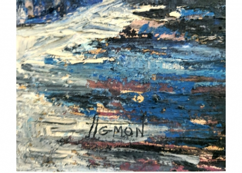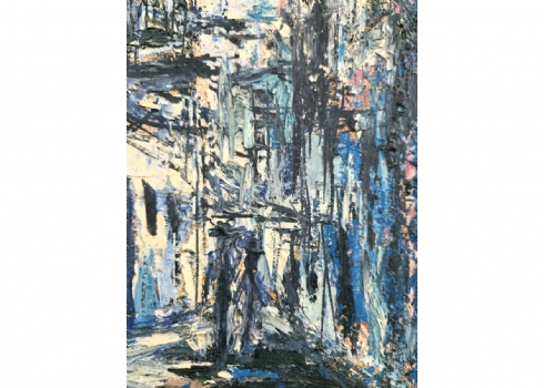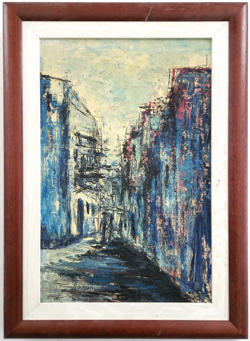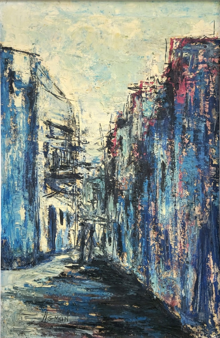 משה אגמון (ישראל-הולנד, נ. 1934) - 'רחוב בכחול', ציור שמן על בד, חתום
