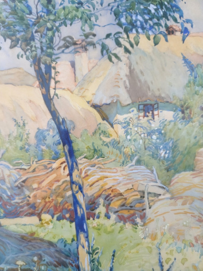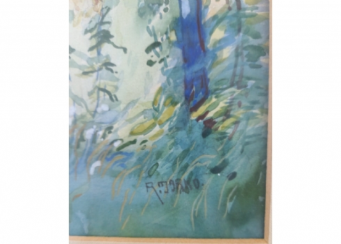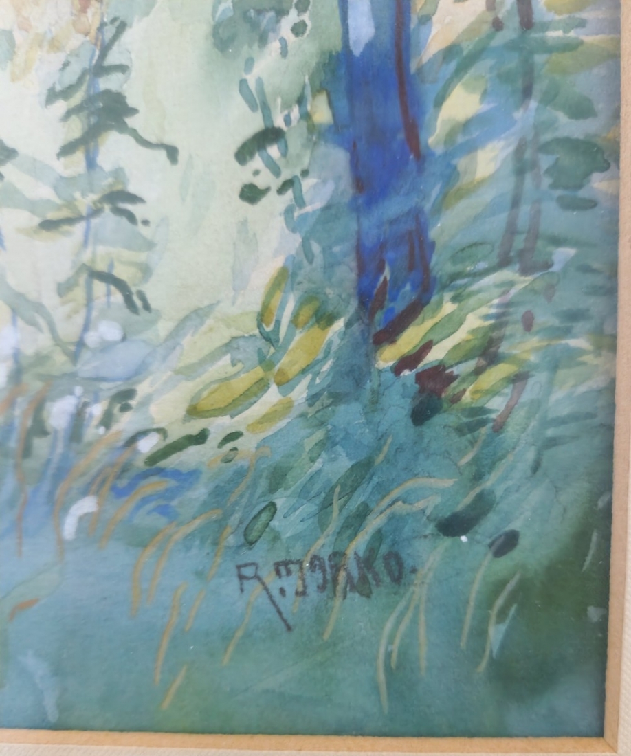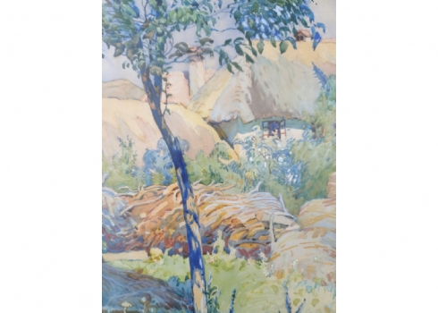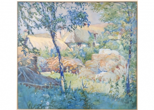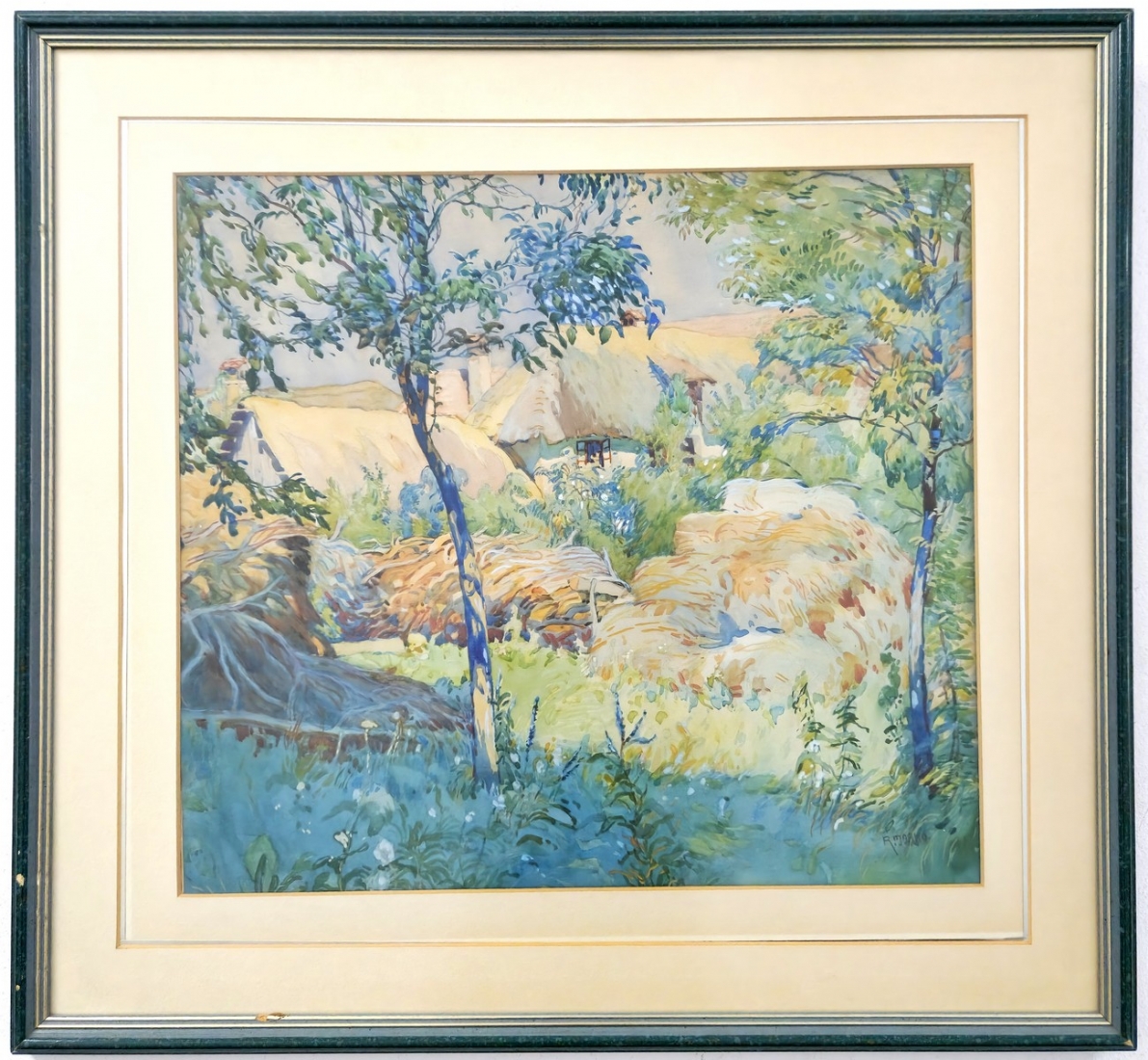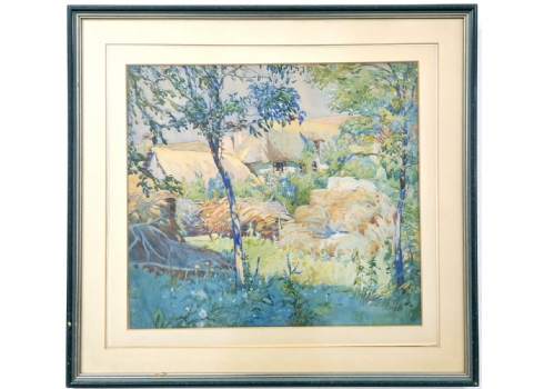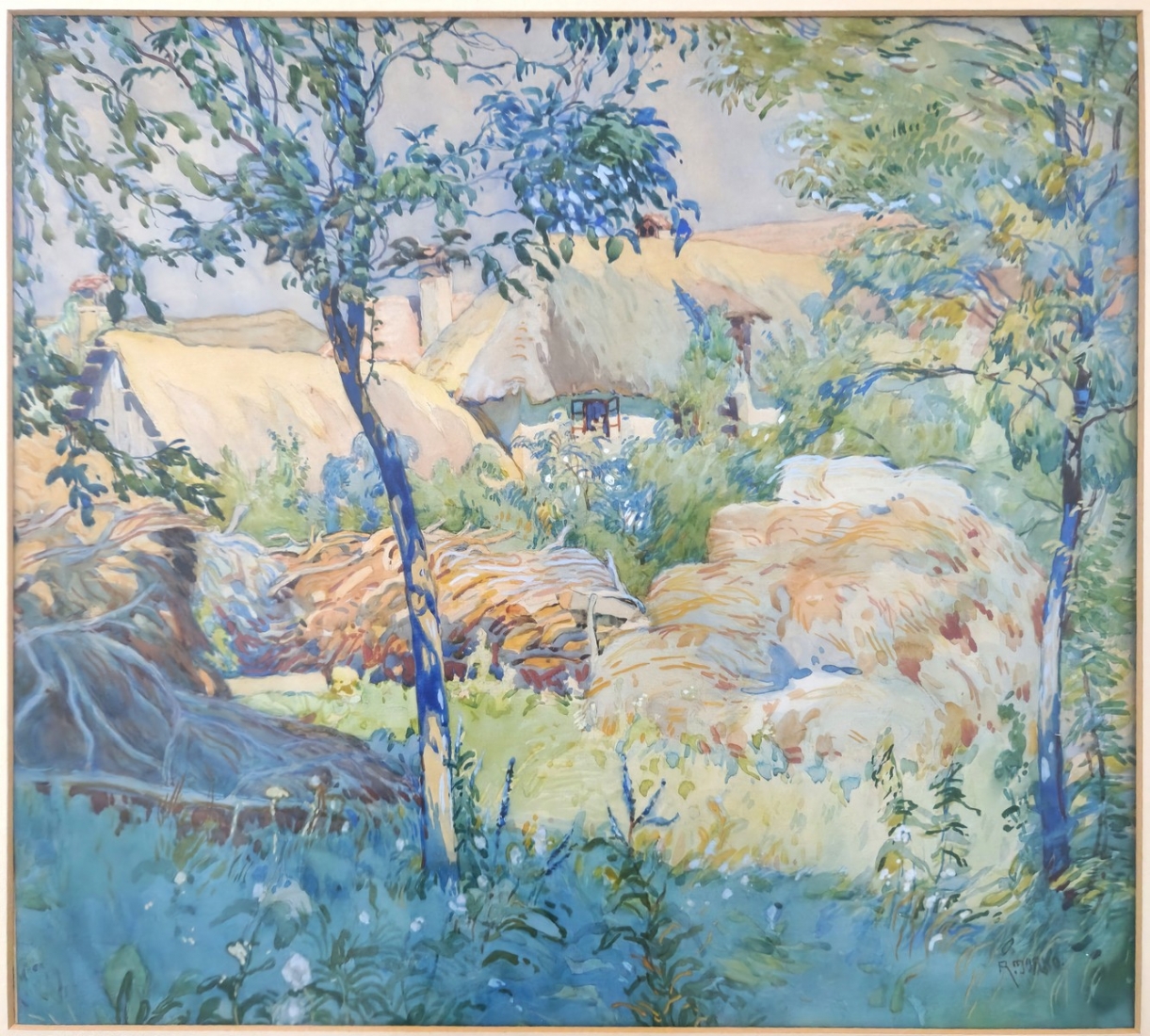 ר. מרקו (R. Marko, צ'כי) 'ערמות חציר בפאתי כפר' – אקוורל על נייר, חתום