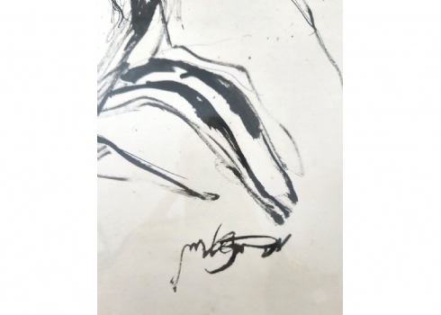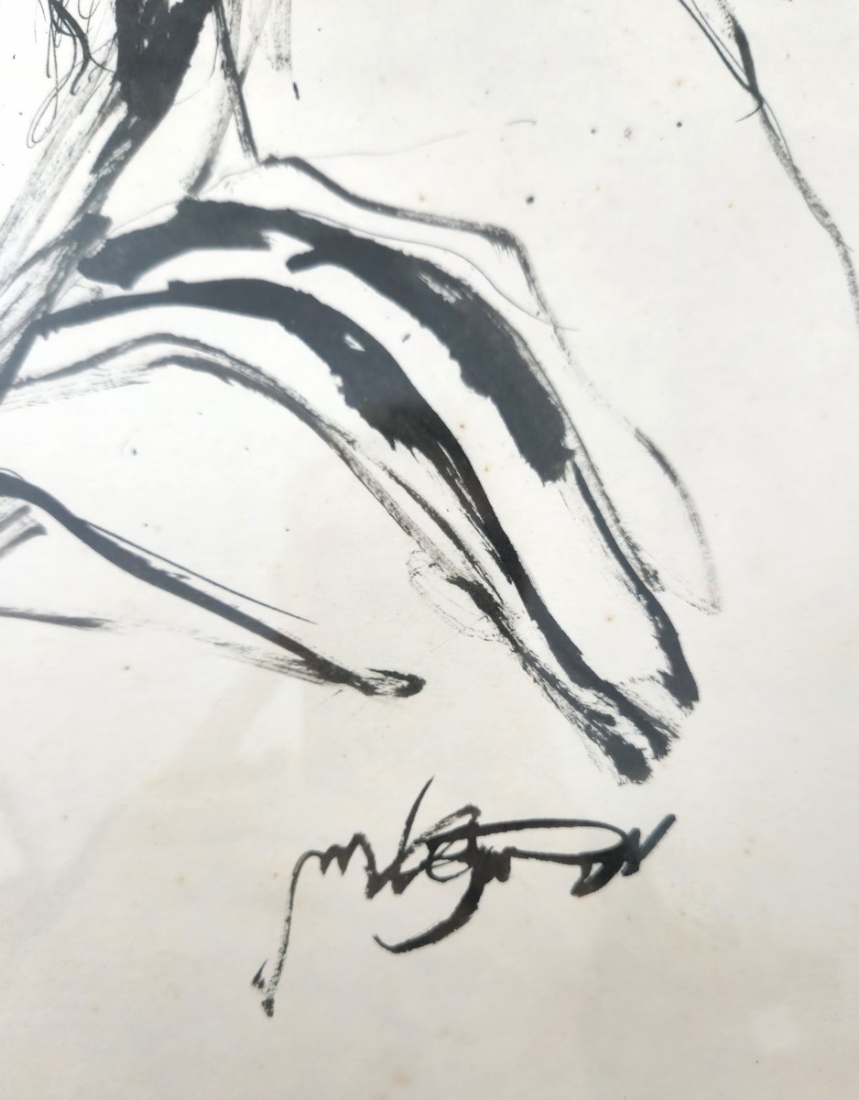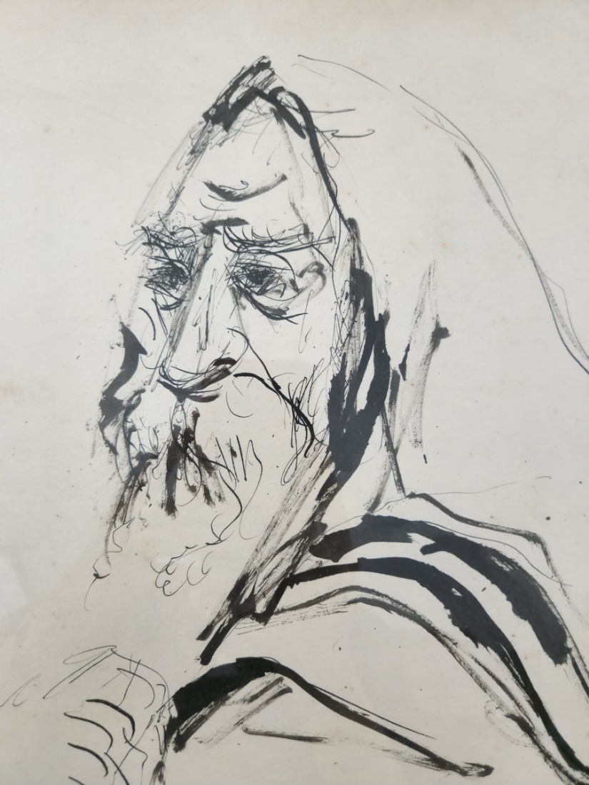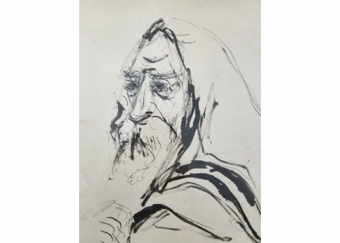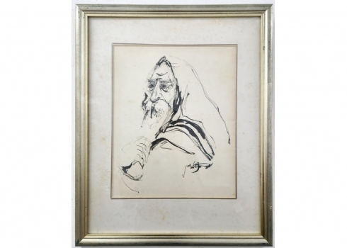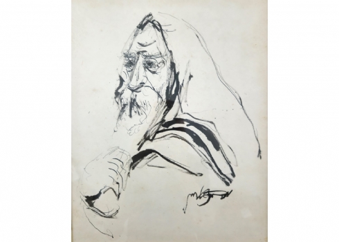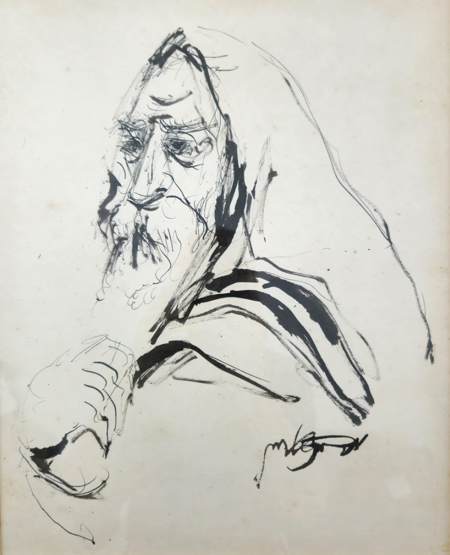 משה ברנשטיין (1920-2006) - 'דמות רב עטוף בטלית', רישום דיו וגואש על נייר, חתום
