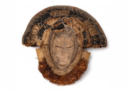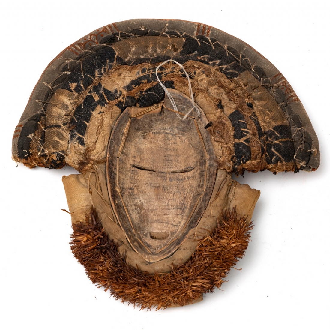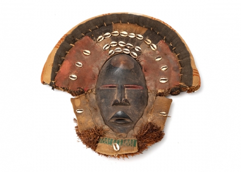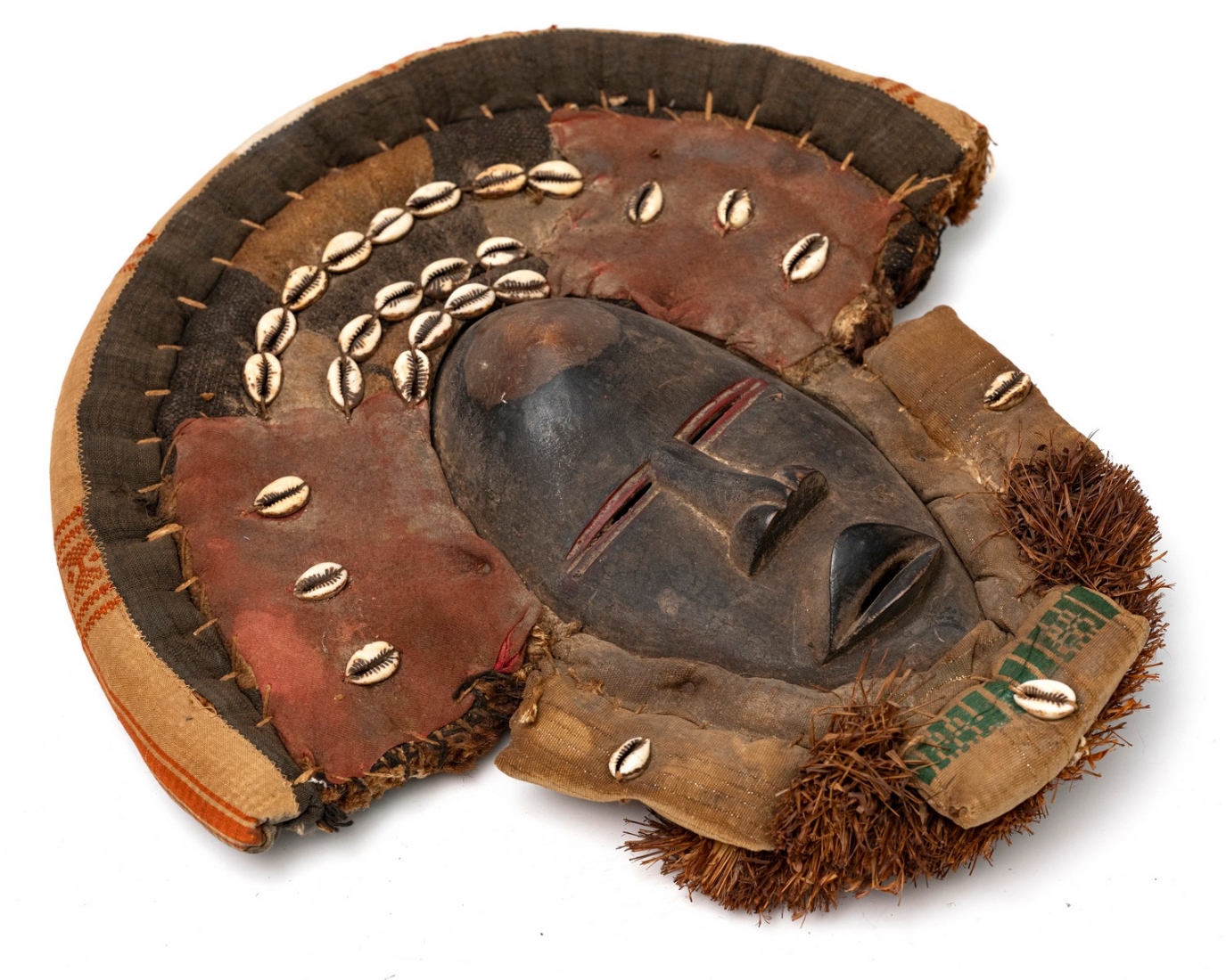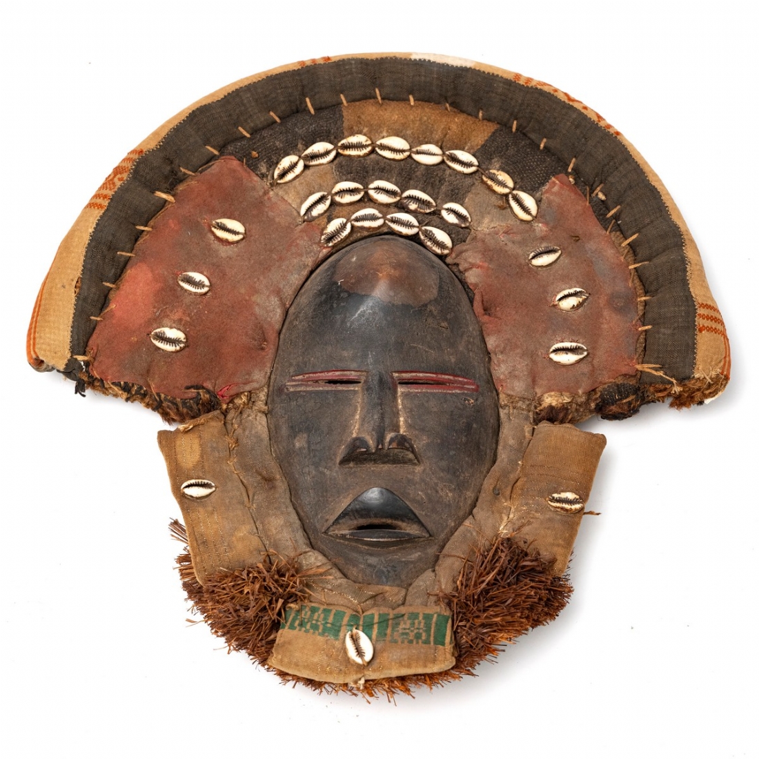 מסכה אפריקאית עתיקה של אנשי הדן (Dan People) עשויה עץ, בד, רפיה וקונכיות