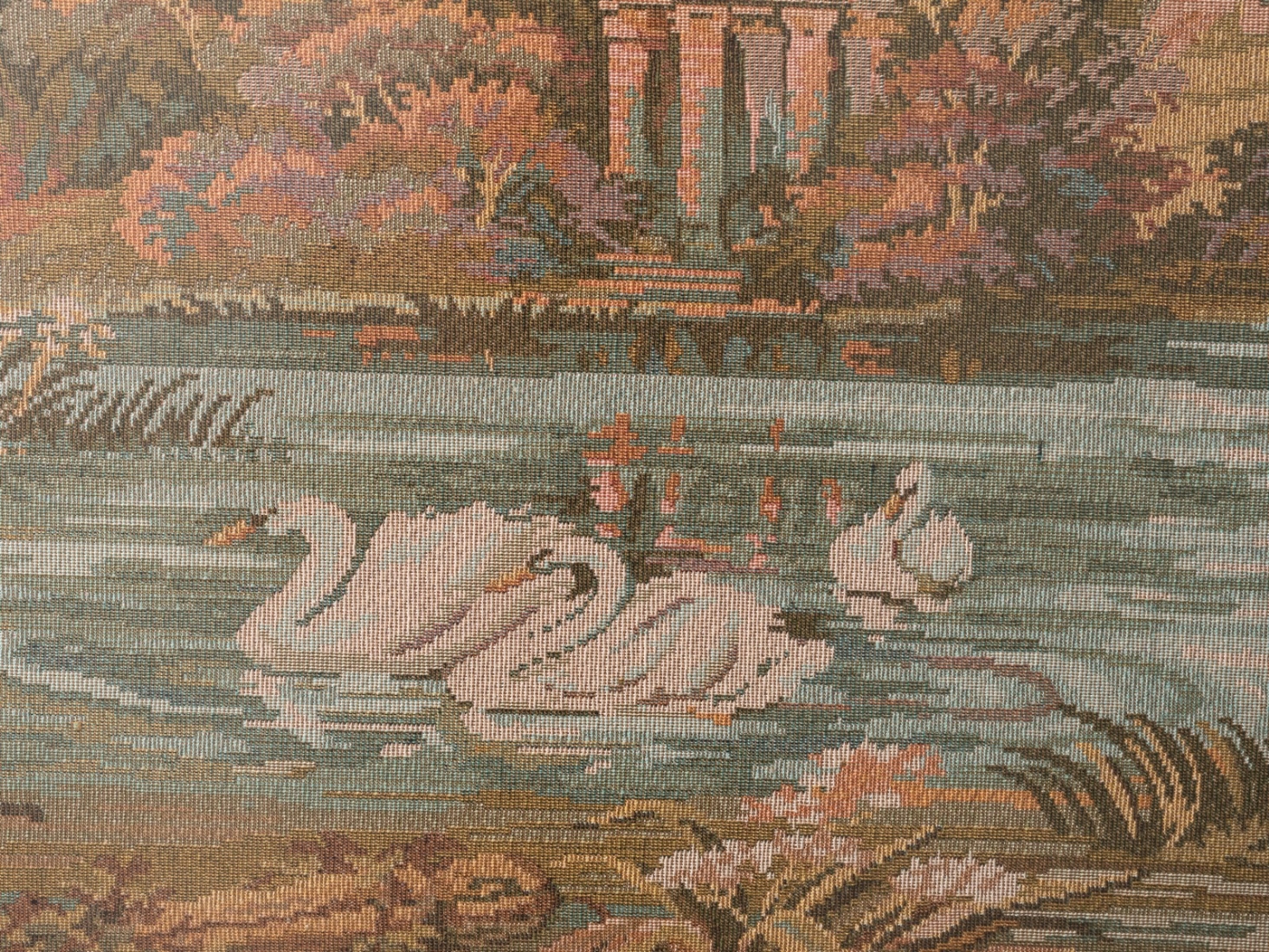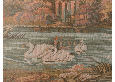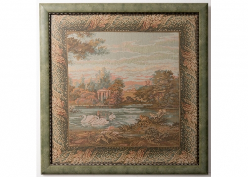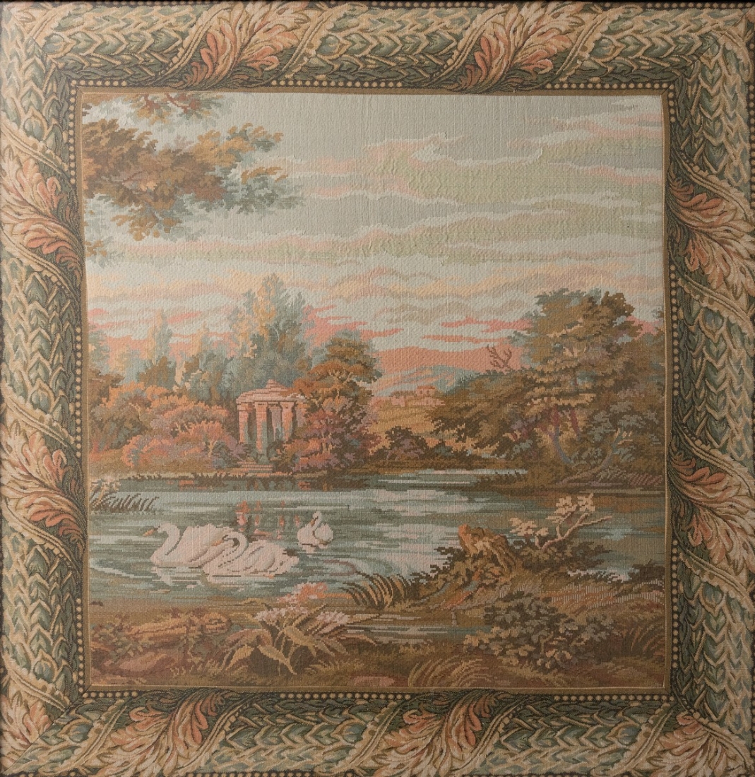 גובלן ממוסגר בעל דגם ברבורים , עשוי בעבודת מכונה, נתון במסגרת נאה