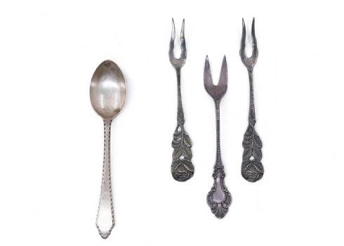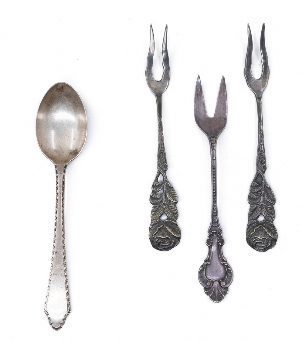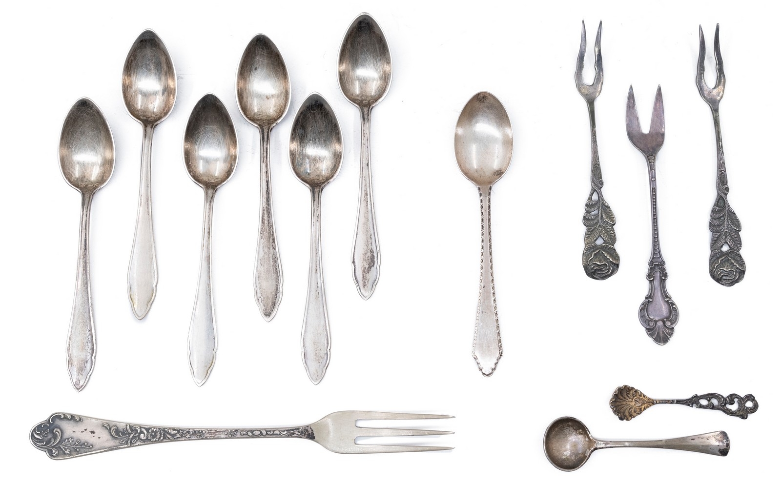 13 פרטי סכו"ם שונים עשויים כסף, חתומים, יצרנים ודגמים שונים