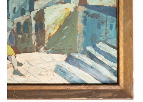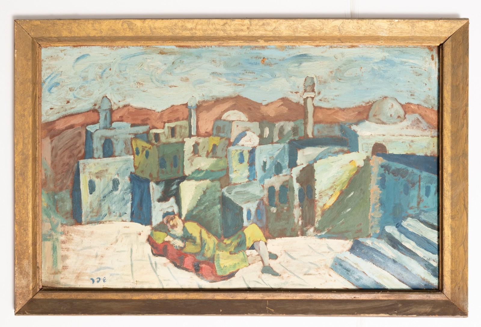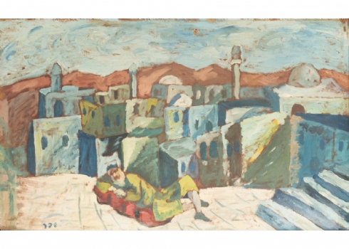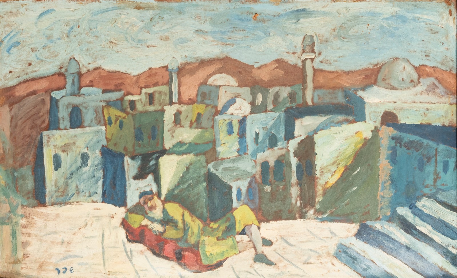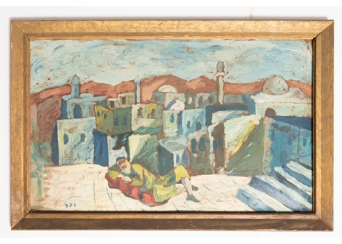 'גבר שוכב לפני עיר ערבית' - שמן על קרטון , חתום 'שפר'