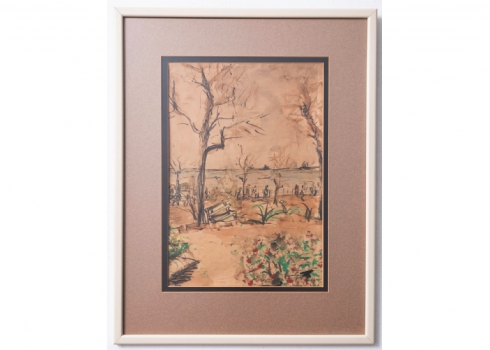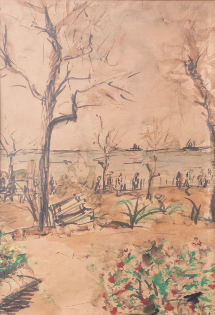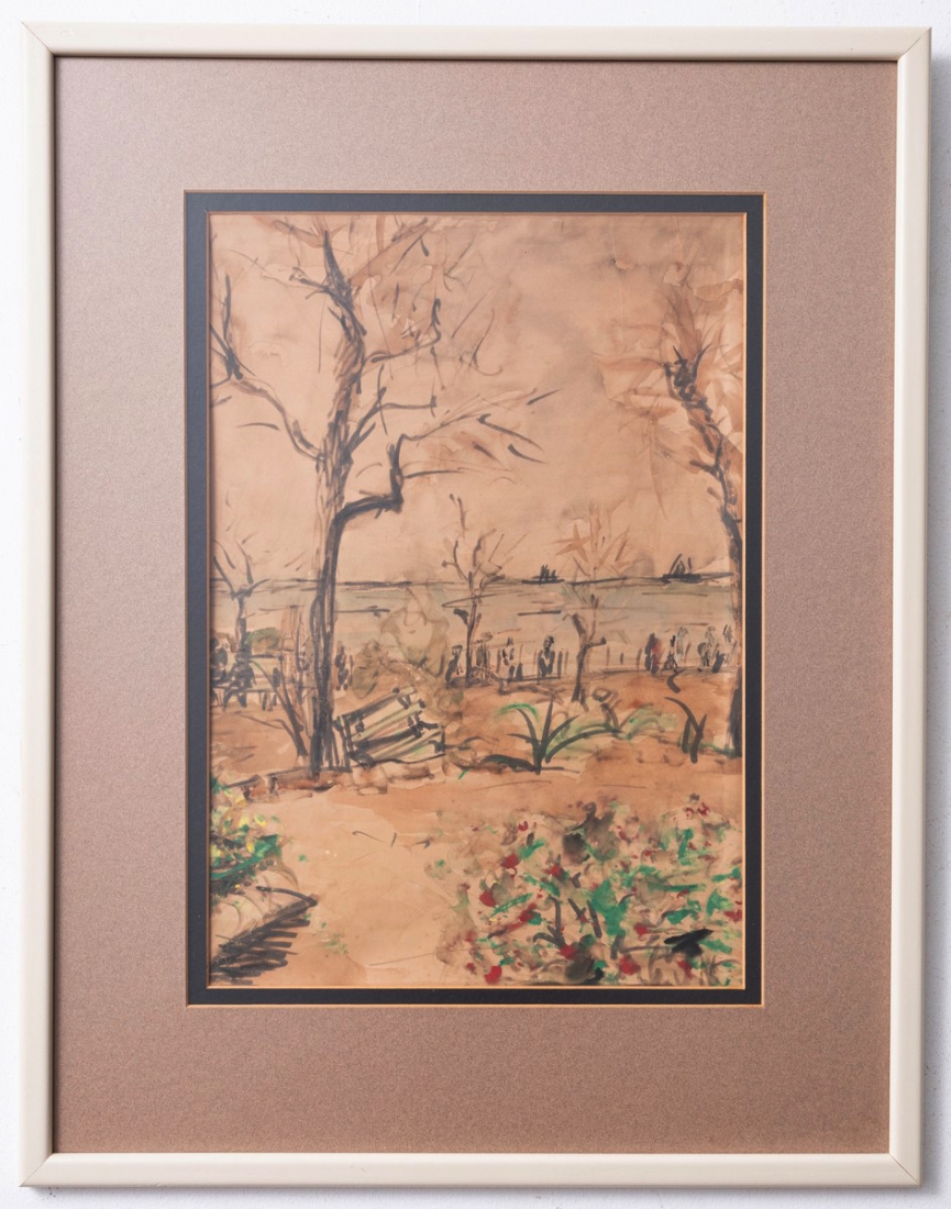 מליטה שיפר (1900-1991, Melita Schiffer) - 'ספסל תחת עץ' - רישום ואקוורל על נייר