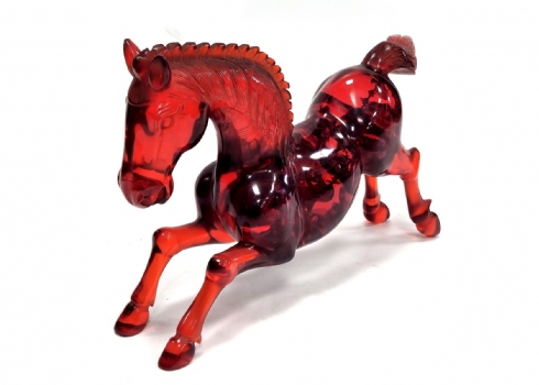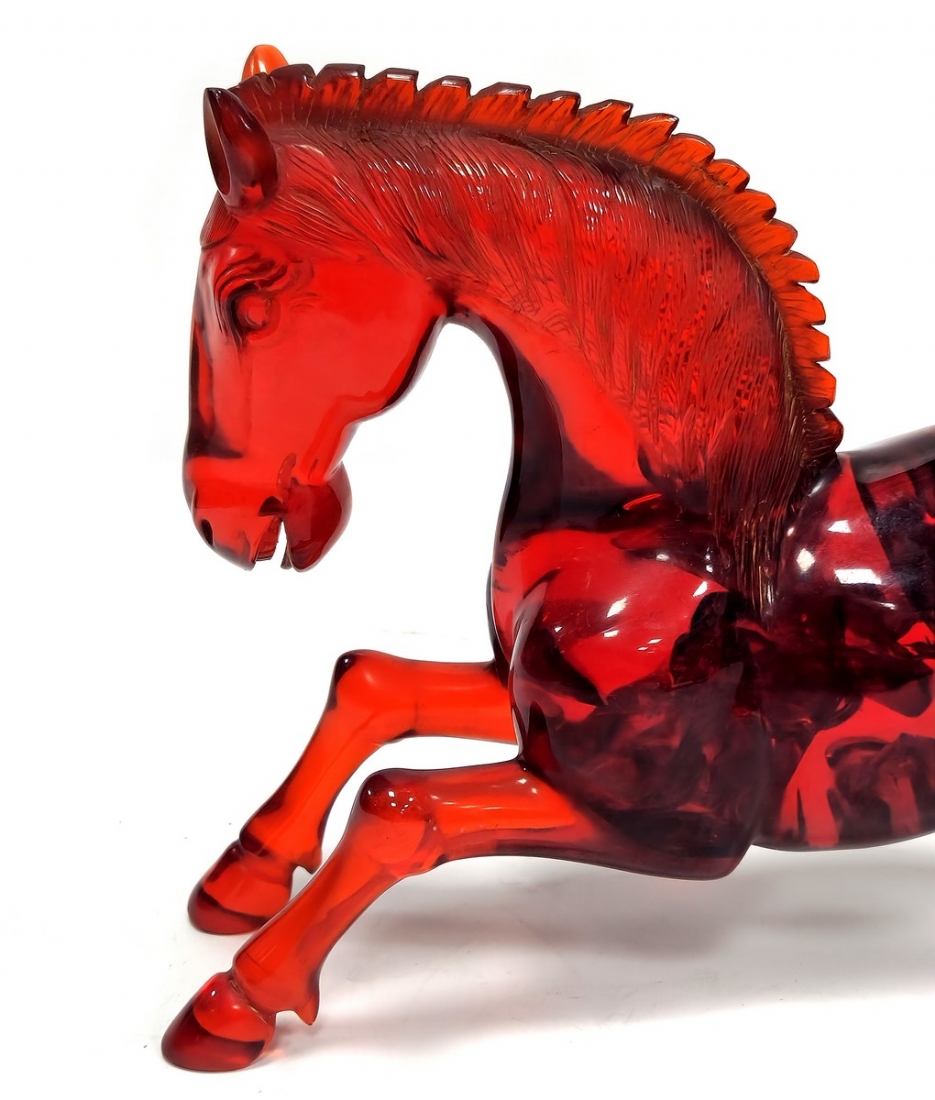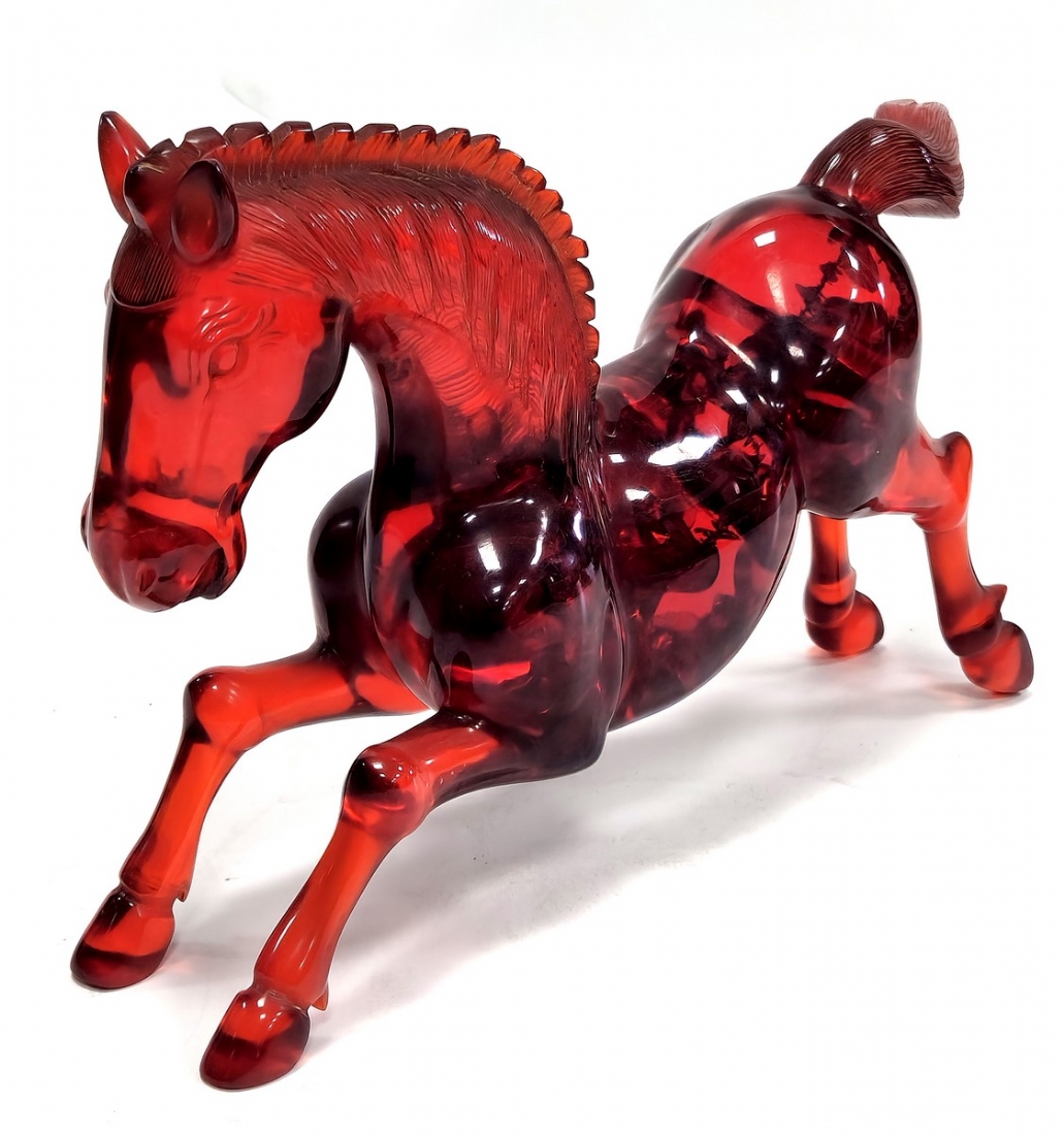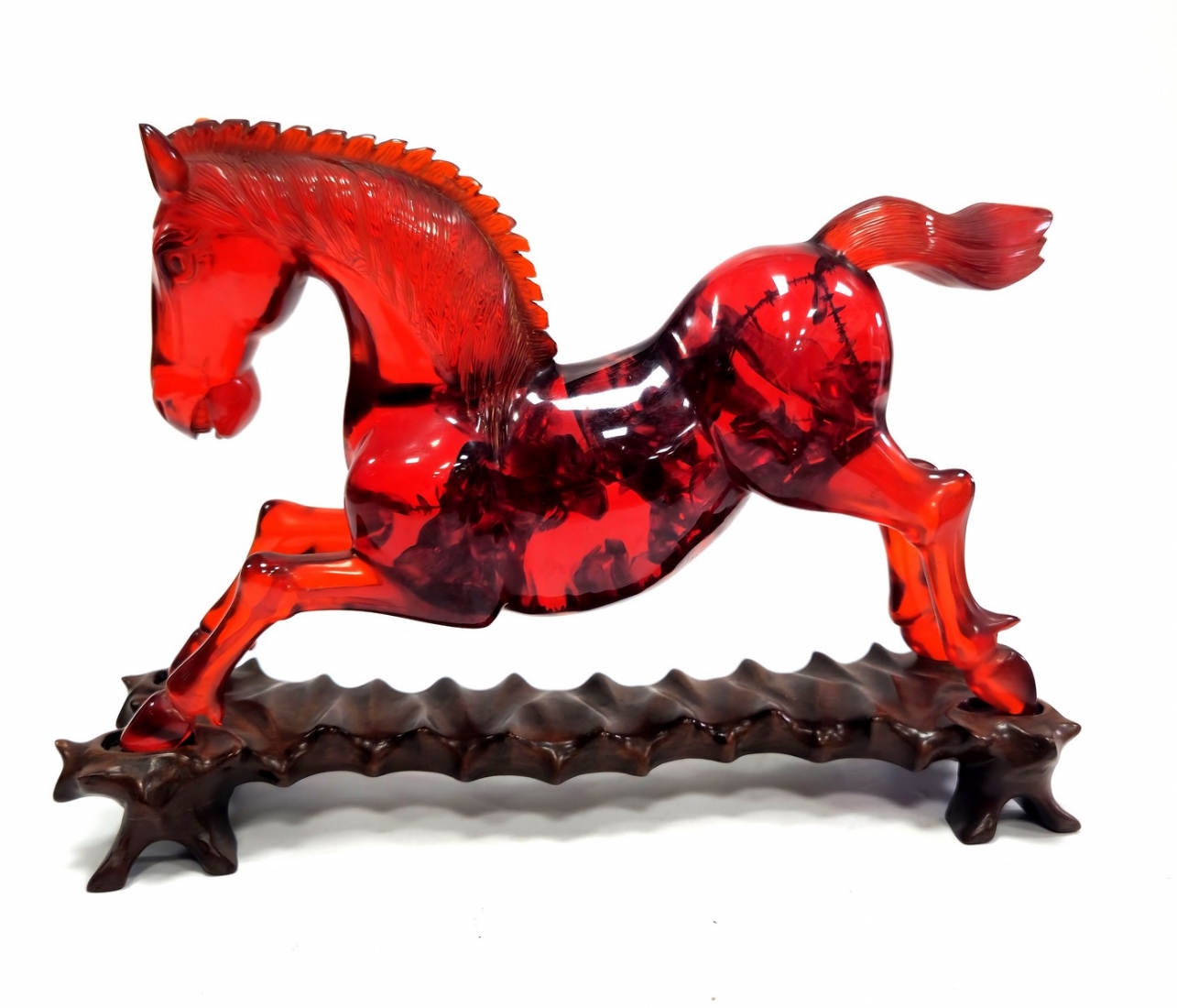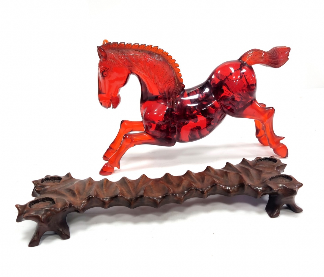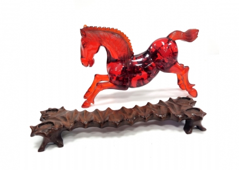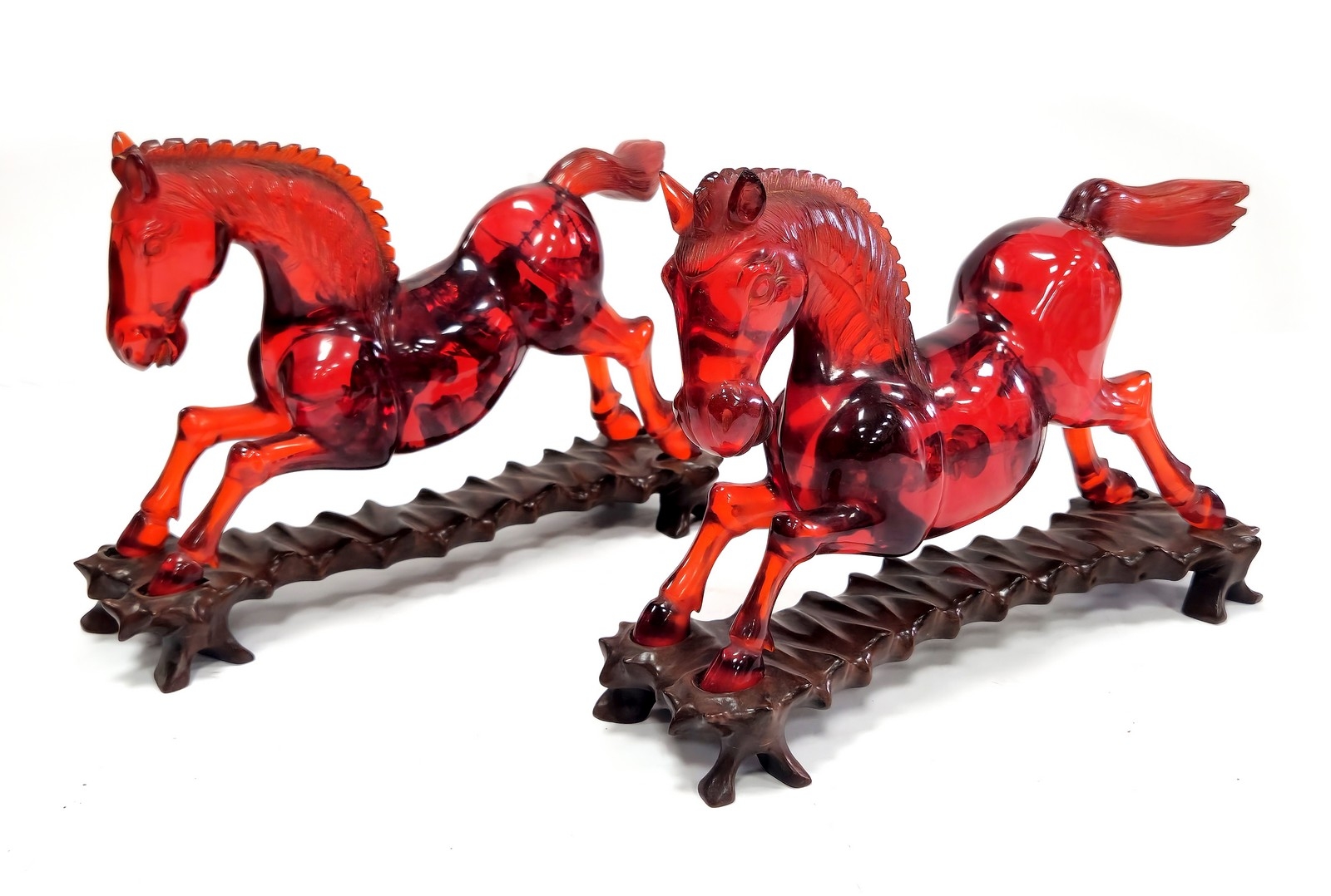 זוג קישוטים סיניים שולחניים עשויים חומר דמוי ענבר בדמות סוסים