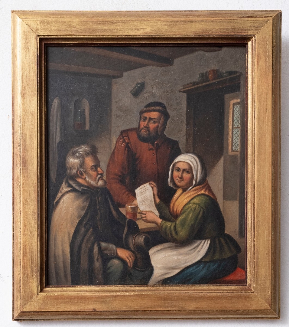 ציור עתיק מהמאה ה-18 בסגנון עבודתו של הצייר ההולנדי אדריאן ואן אוסטדה (Adriaen van Ostade)\ שמן על לוח, לא חתום, סוף המאה ה-18 או תחילת המאה ה-19