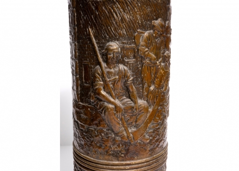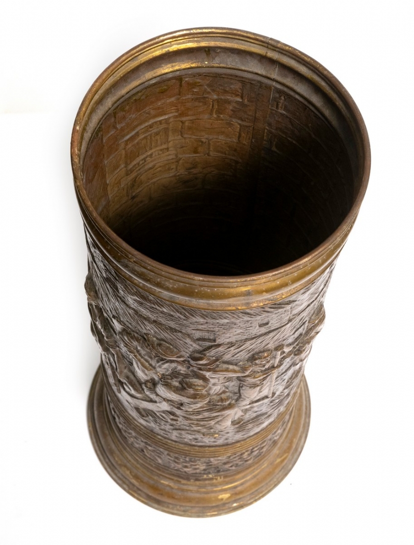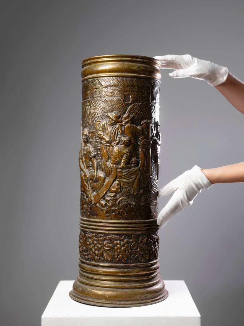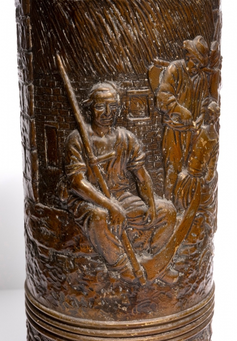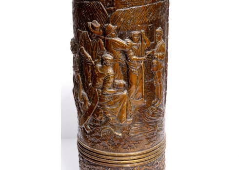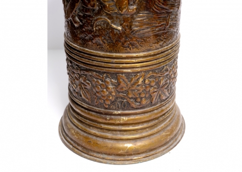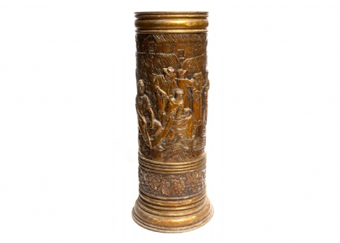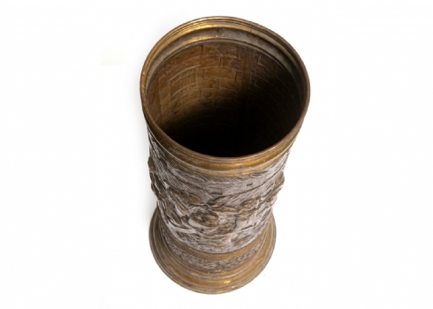 מעמד רצפה עתיק למטריות עשוי נחושת מעוצב בצורת גליל ומעוטר עיטורי בלט
