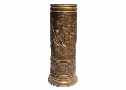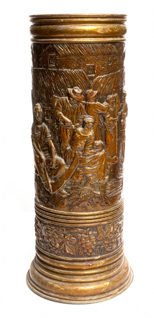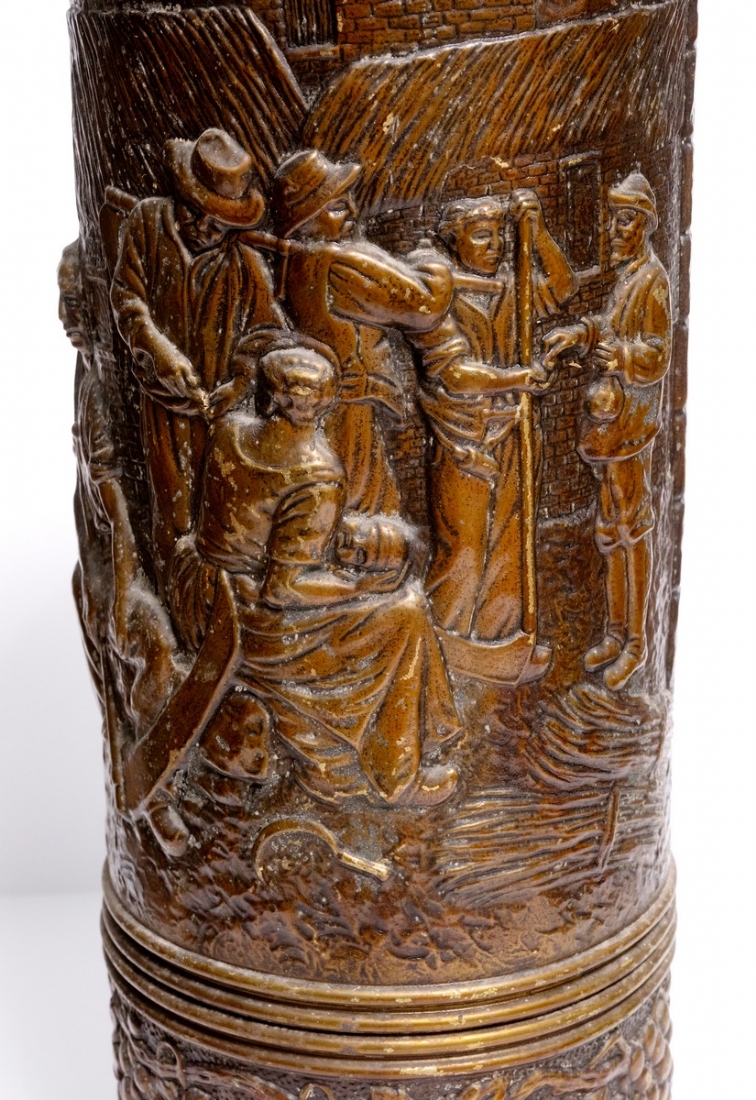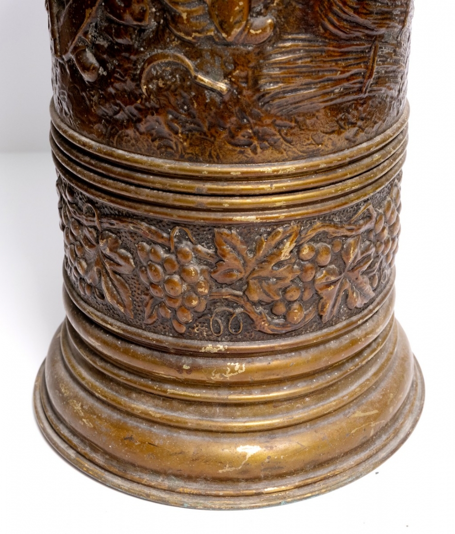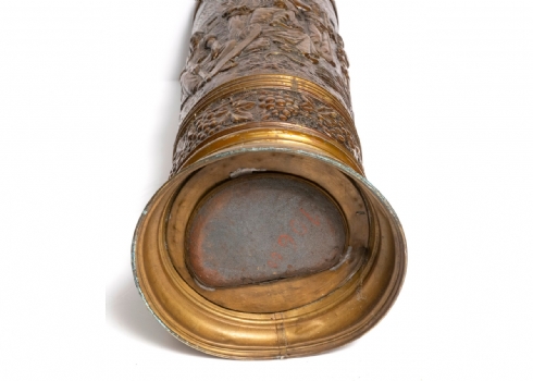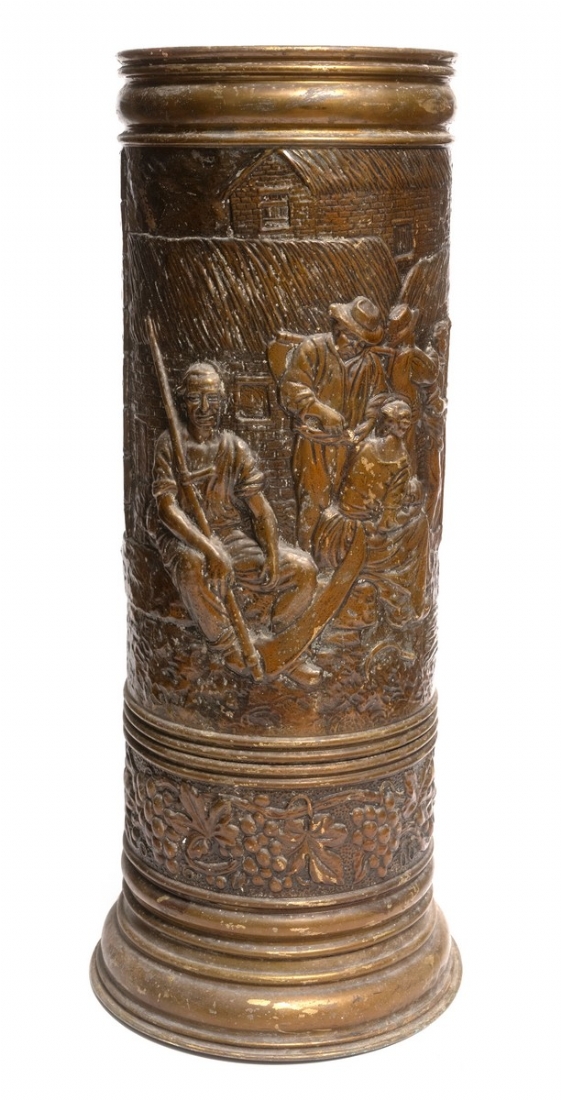 מעמד רצפה עתיק למטריות עשוי נחושת מעוצב בצורת גליל ומעוטר עיטורי בלט