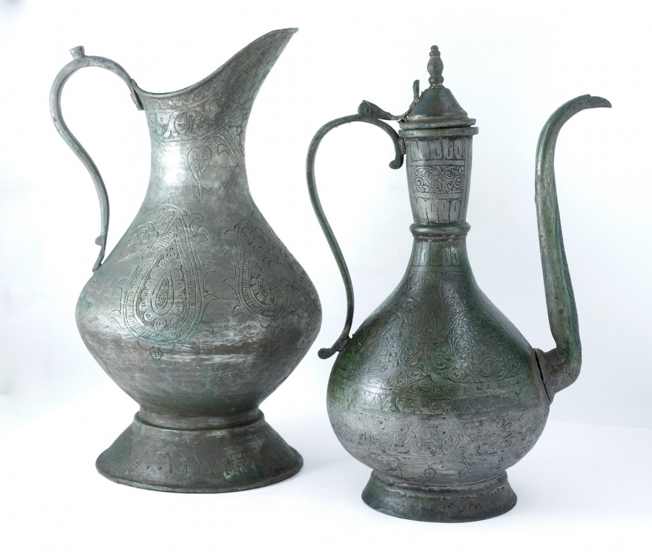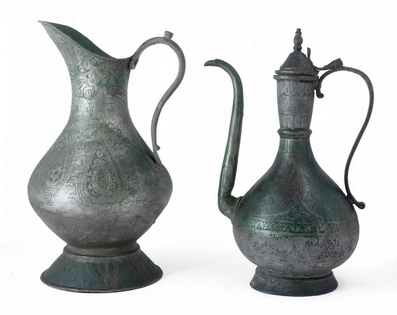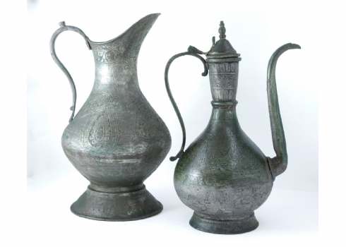 עשויים נחושת מעוטרת בעבודת יד וציפוי בדיל גובה בהתאמה: 39, 39.5 ס"מרוחב כולל בהתאמה: 25, 24 ס"מ