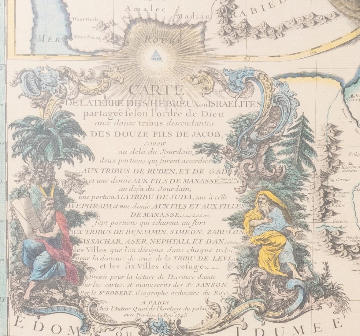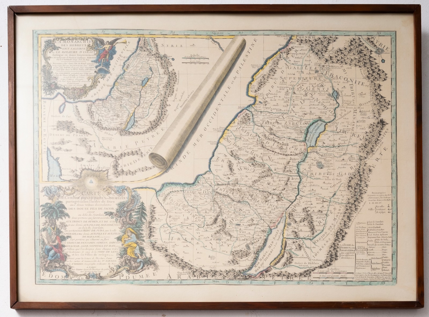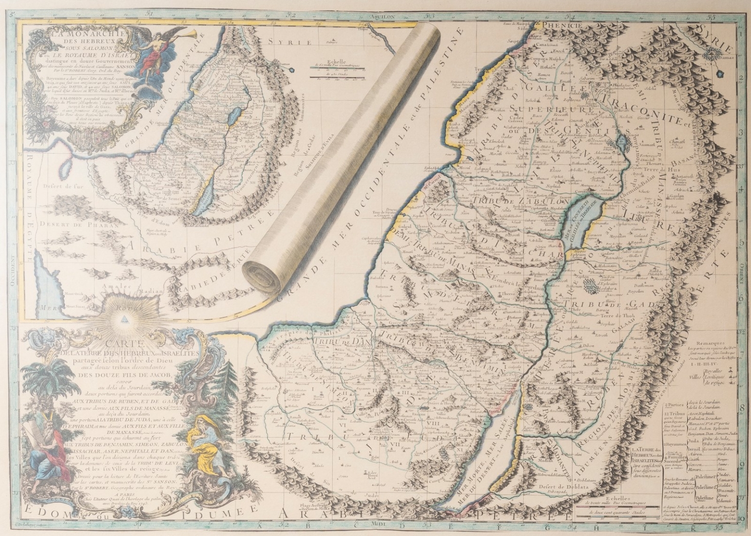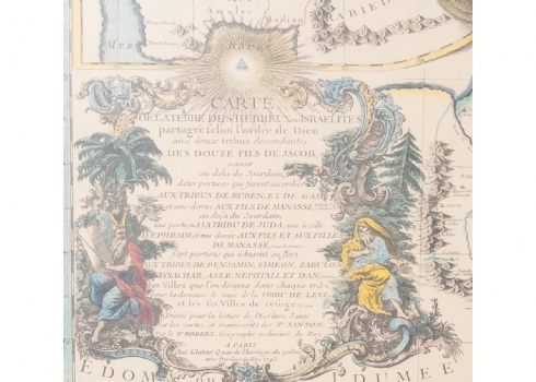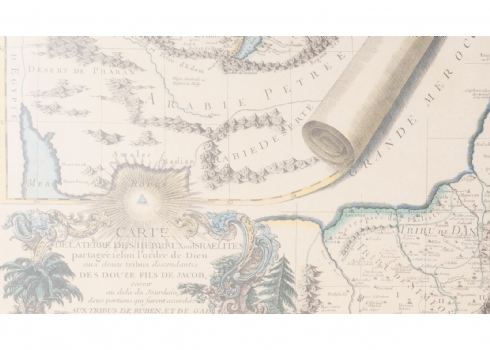 לאספני מפות עתיקות - מפה עתיקה משנת 1745 נושאת כיתוב: "Carte de la terre des Hebreux ou Israelites partagee selon l'ordre de Dieu aux douze tribus descendantes des douze fils de Jacob", של הגאוגרף והקרטוגרף הצרפתי שארל פרנסואה דלמרש (Charles Francois Delamarche 1740-1817), ושל הקרטוגרף הצרפתי רוברט דה וגונדי Robert de Vaugondy (1688-1766), צבועה ביד (צביעה מאוחרת)