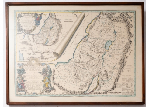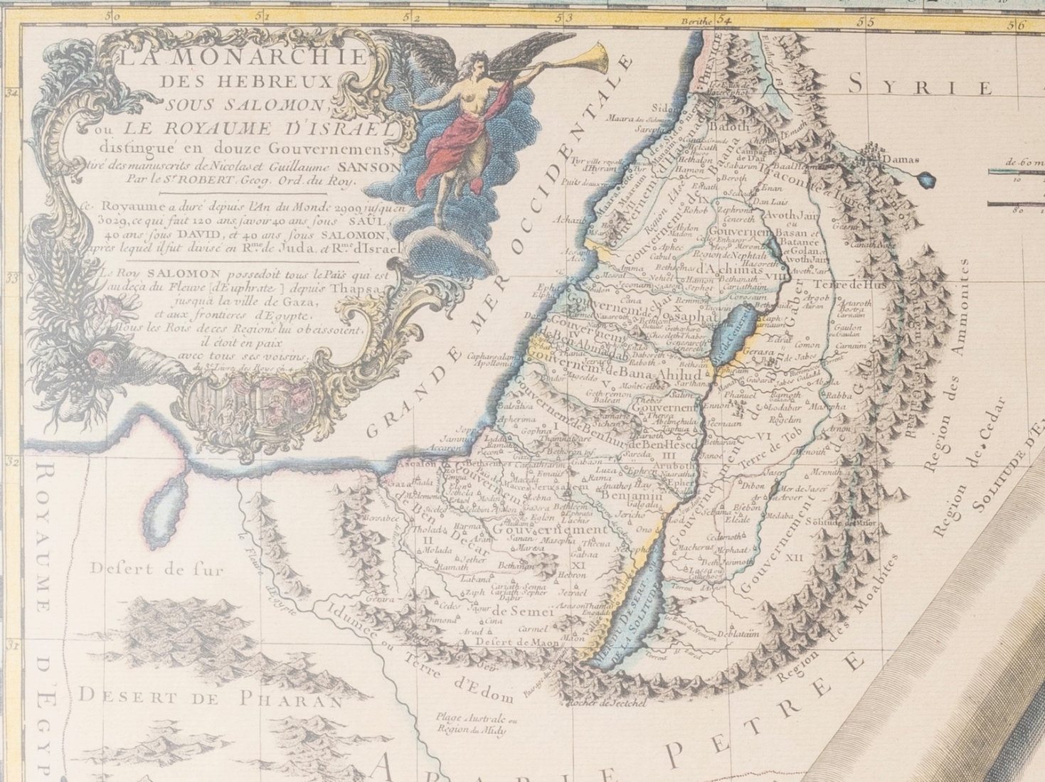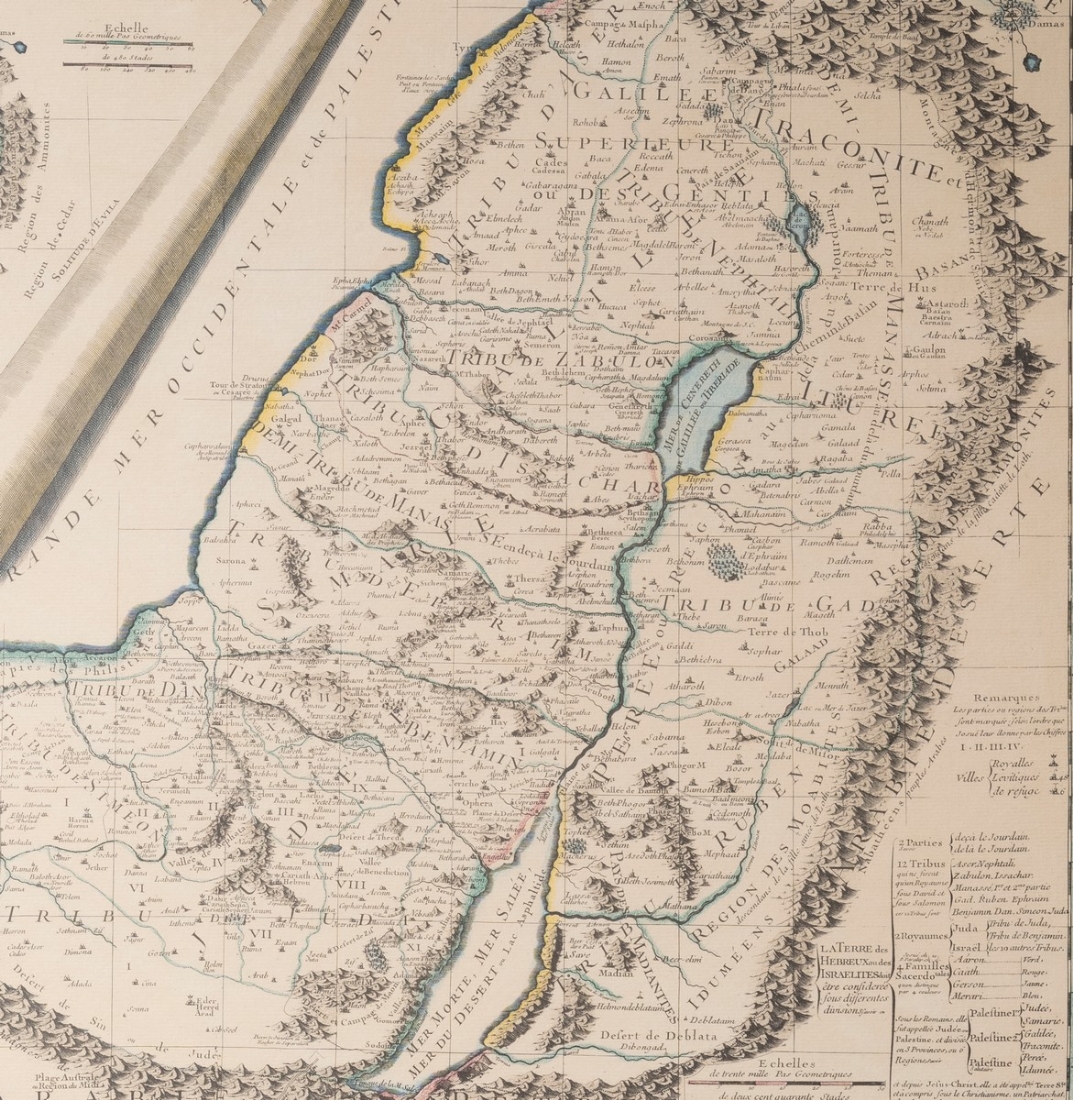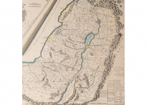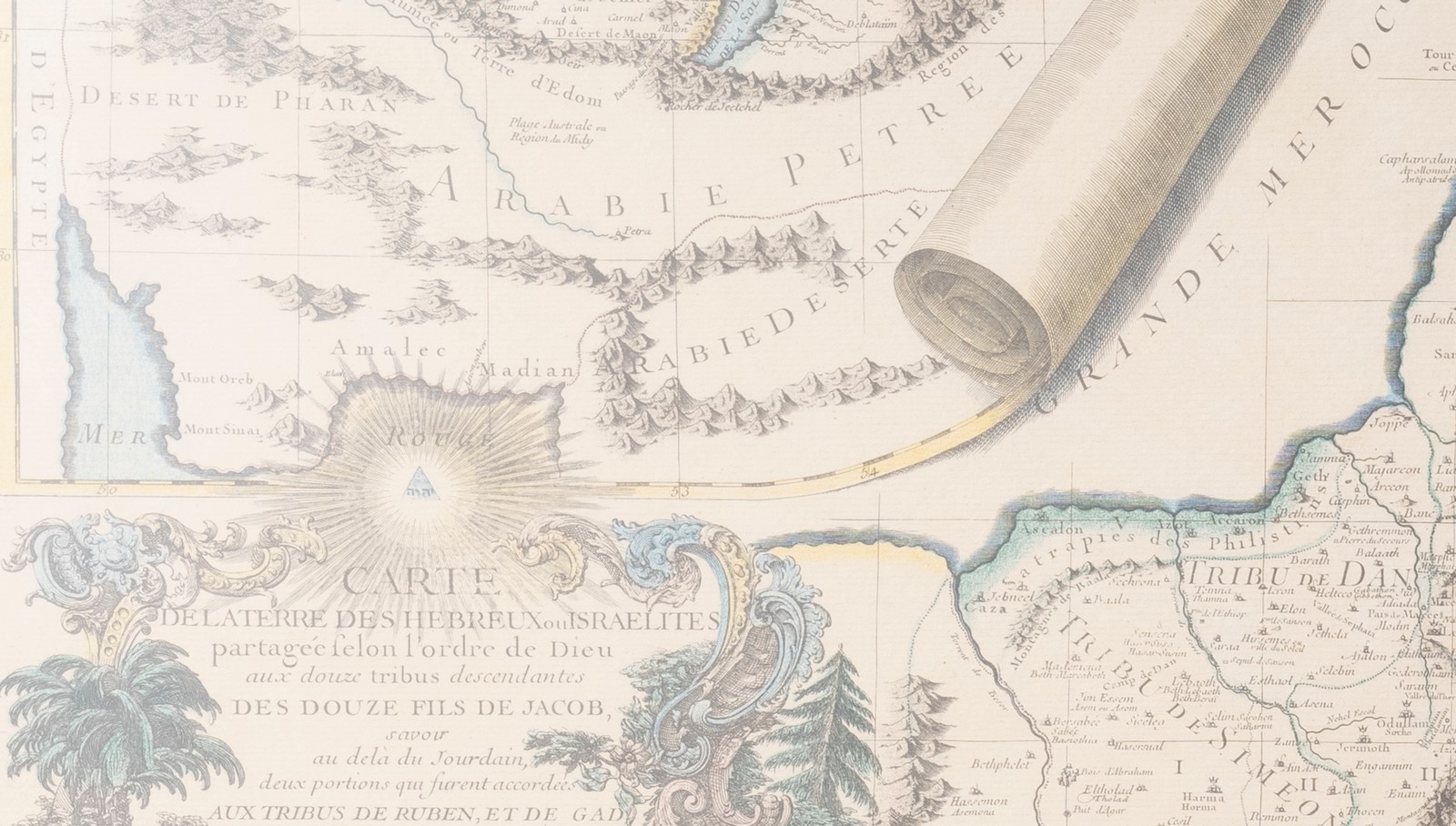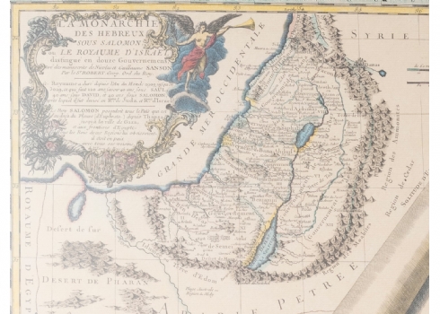 לאספני מפות עתיקות - מפה עתיקה משנת 1745 נושאת כיתוב: "Carte de la terre des Hebreux ou Israelites partagee selon l'ordre de Dieu aux douze tribus descendantes des douze fils de Jacob", של הגאוגרף והקרטוגרף הצרפתי שארל פרנסואה דלמרש (Charles Francois Delamarche 1740-1817), ושל הקרטוגרף הצרפתי רוברט דה וגונדי Robert de Vaugondy (1688-1766), צבועה ביד (צביעה מאוחרת)
