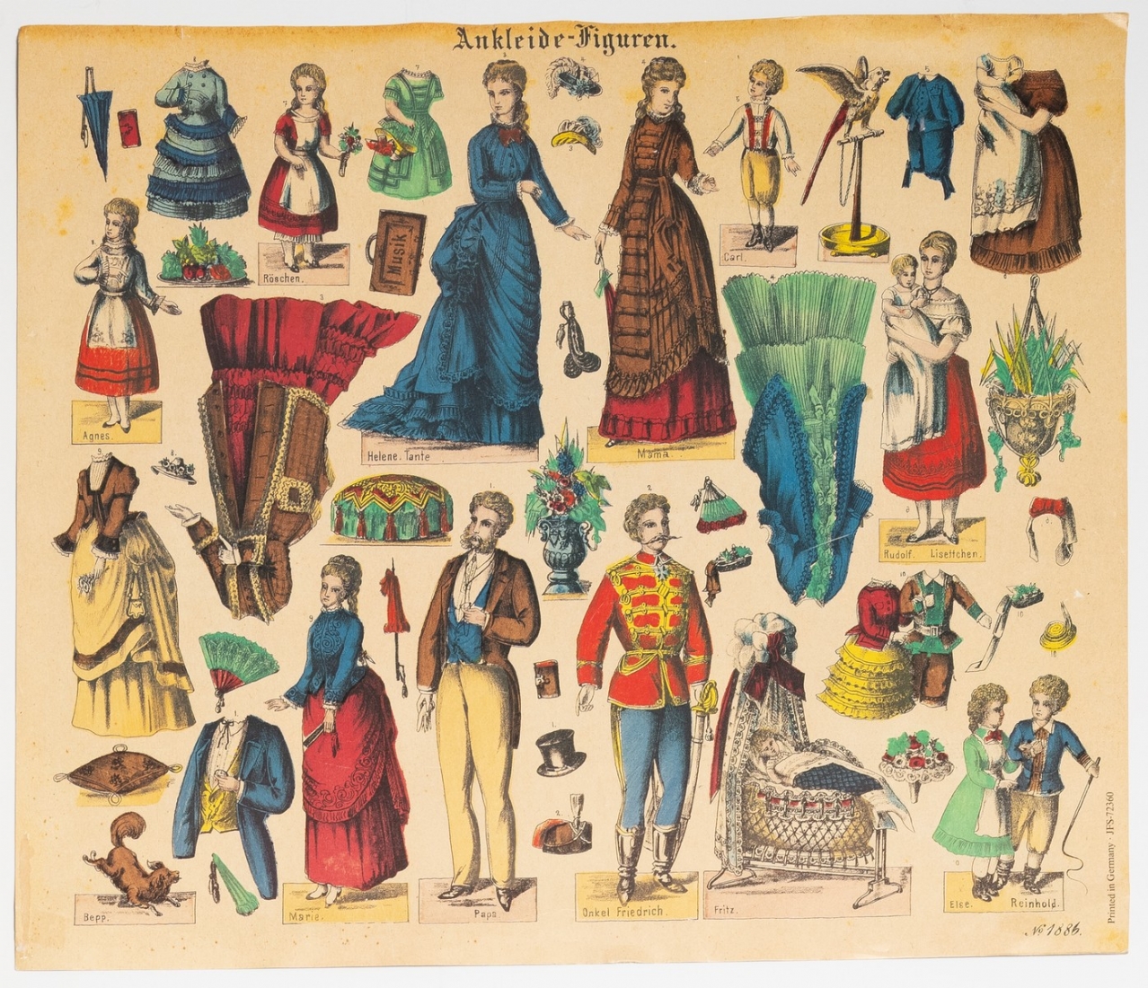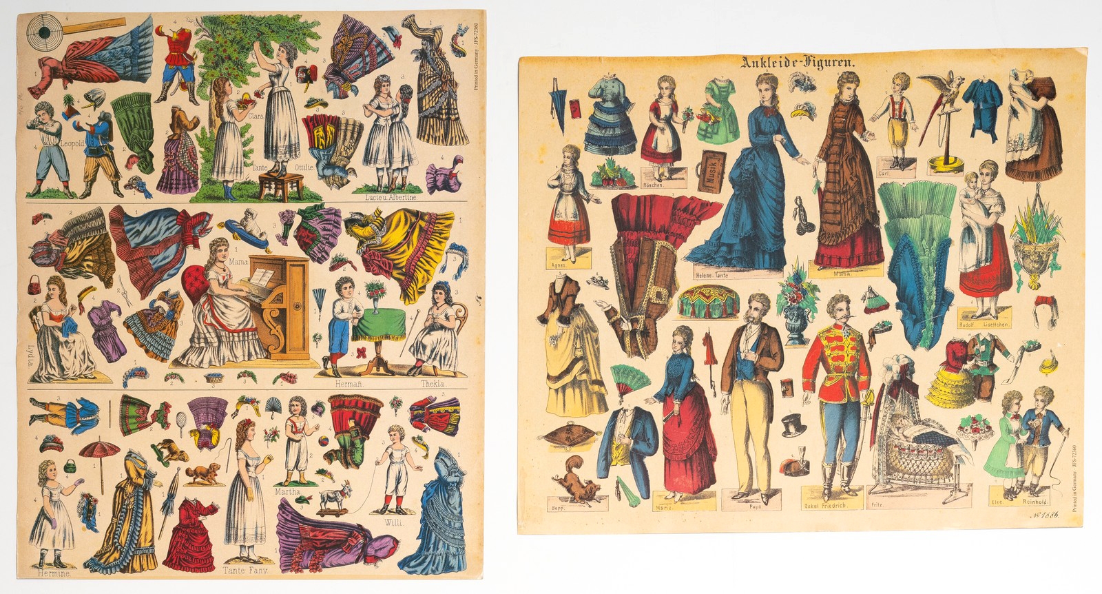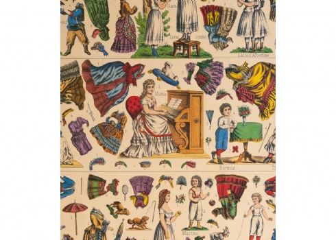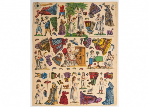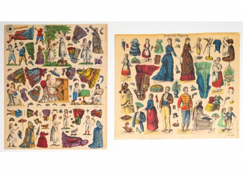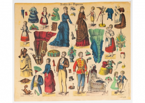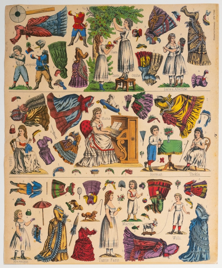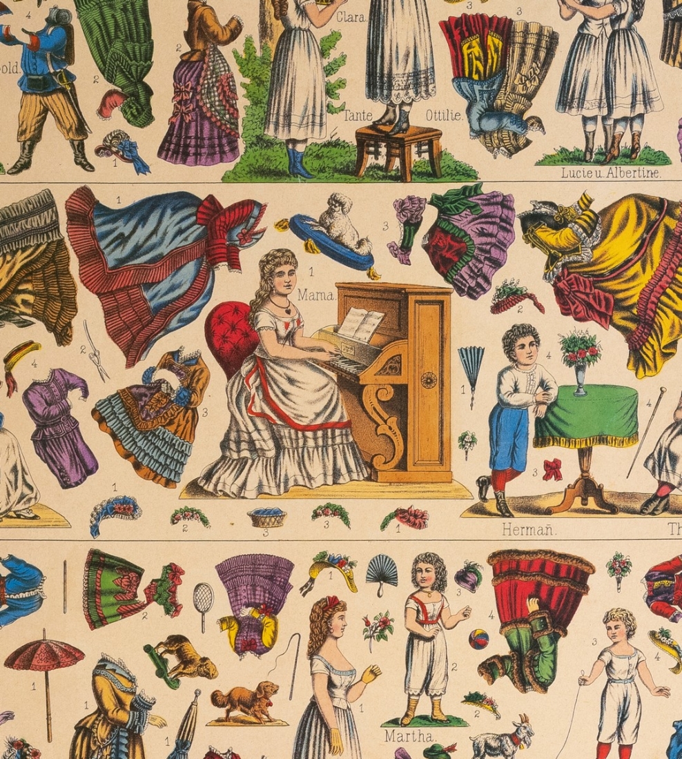 סט נדיר של בובות נייר גרמניות משלהי המאה ה־19, במצב מקורי וללא גזירהמודפסות באיכות צבעונית עשירה על גבי קרטון