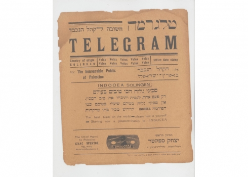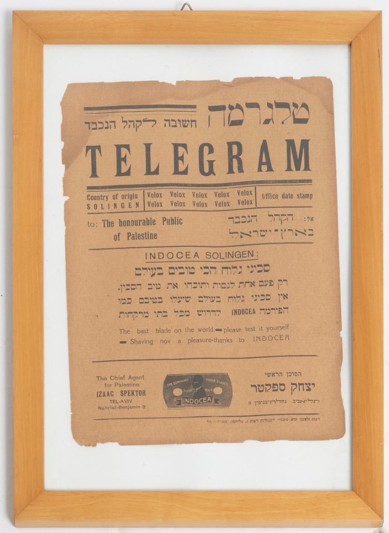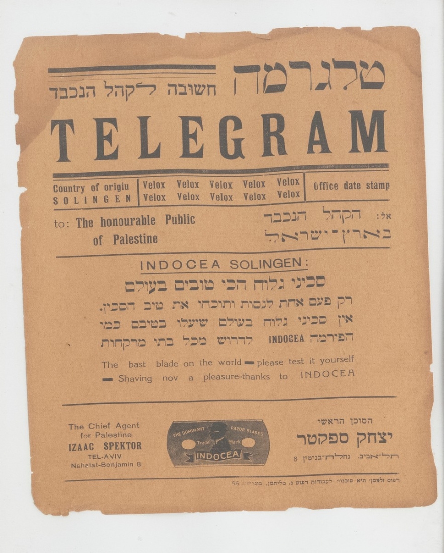 פרסומת ישנה לסכיני גילוח "טלגרמה חשובה לקהל הנכבד, הסוכן הראשי יצחק ספקטור נחלת בנימין 8 תל אביב - סכיני גילוח הכי טובים בעולם, רק פעם אחת לנסות ותוכחו את טיב הסכין, אין סכיני גלוח בעולם שיעלו בטיבם כמו הפירמה Indocea לדרוש מכל בתי מרקחות"
