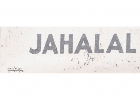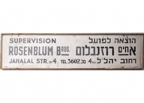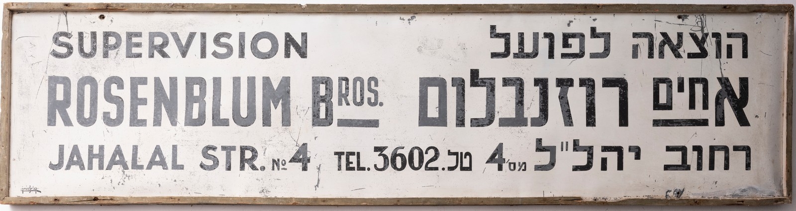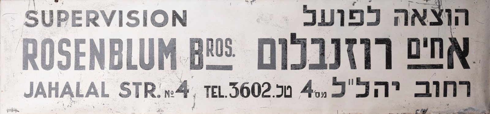 שלט פח גדול מימדים, נושא כיתוב: הוצאה לפועל אחים רוזנבלום רחוב יהל"ל מס' 4