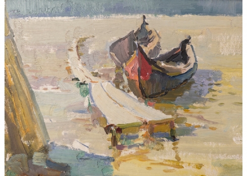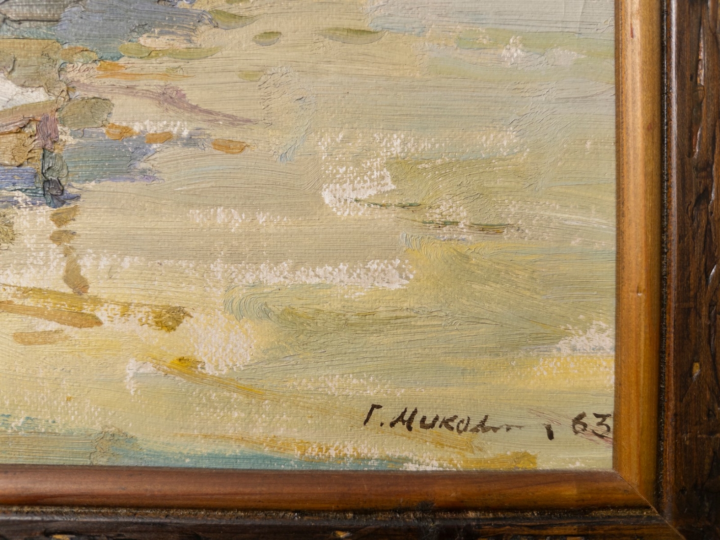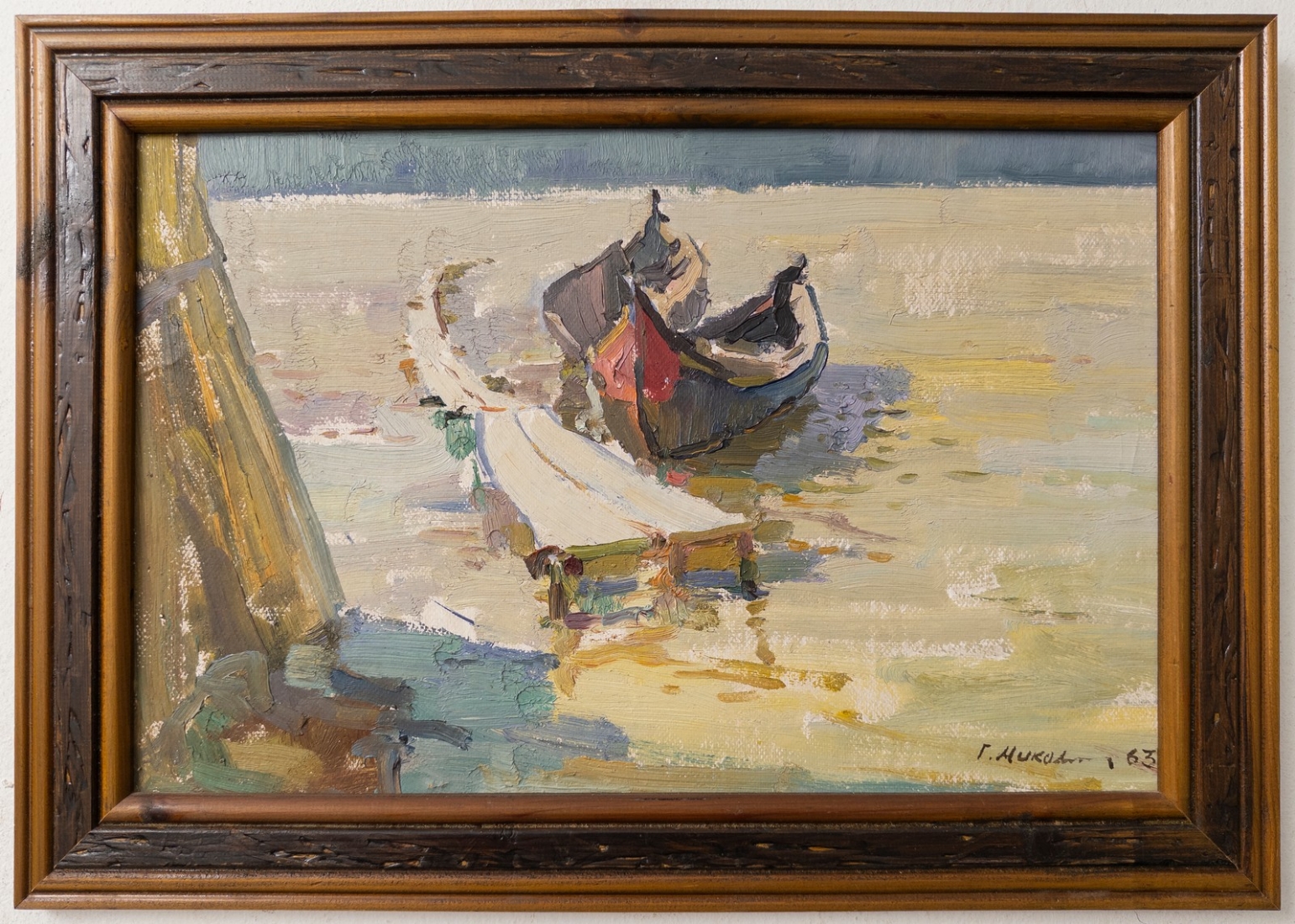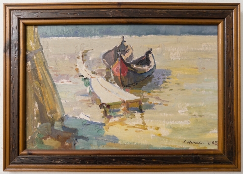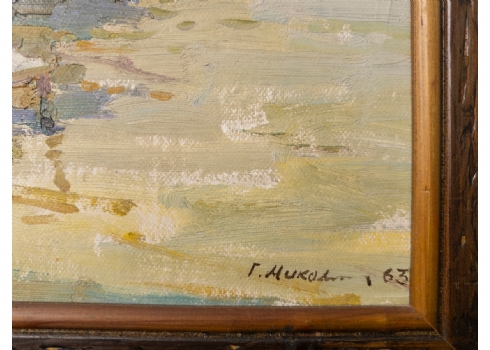 שמן על בד מוצמד ללוח, חתום ומתוארך: 1963 מידות התמונה: 26X40 ס"מ מידות המסגרת: 36X50 ס"מ