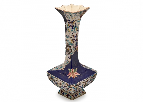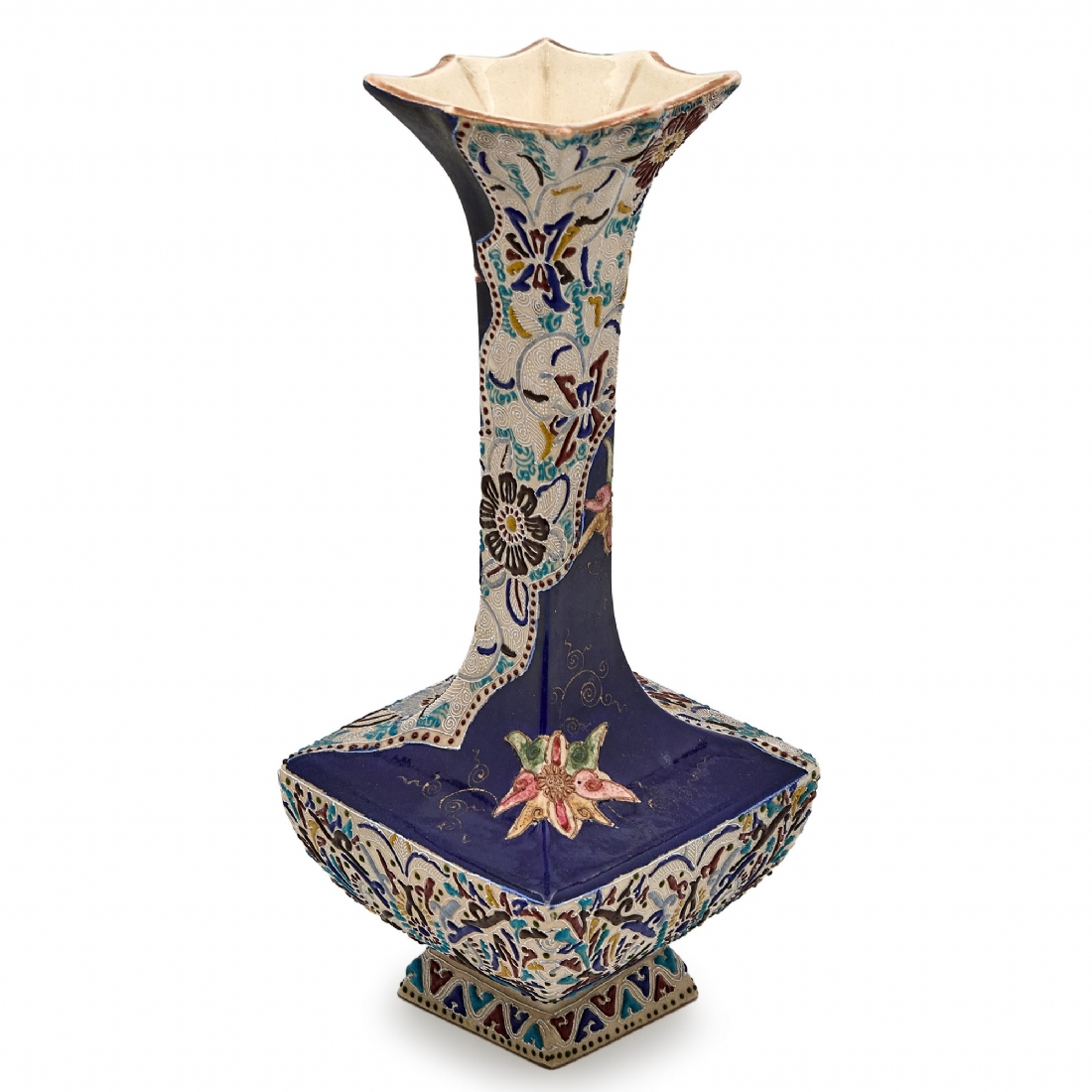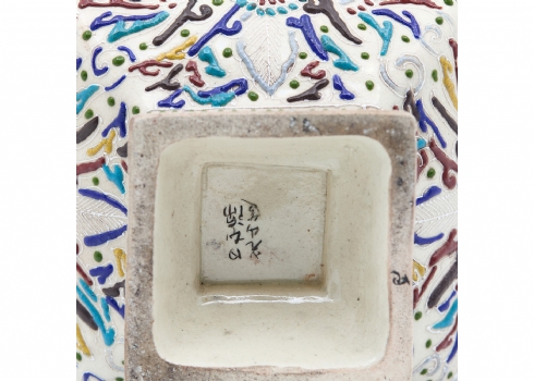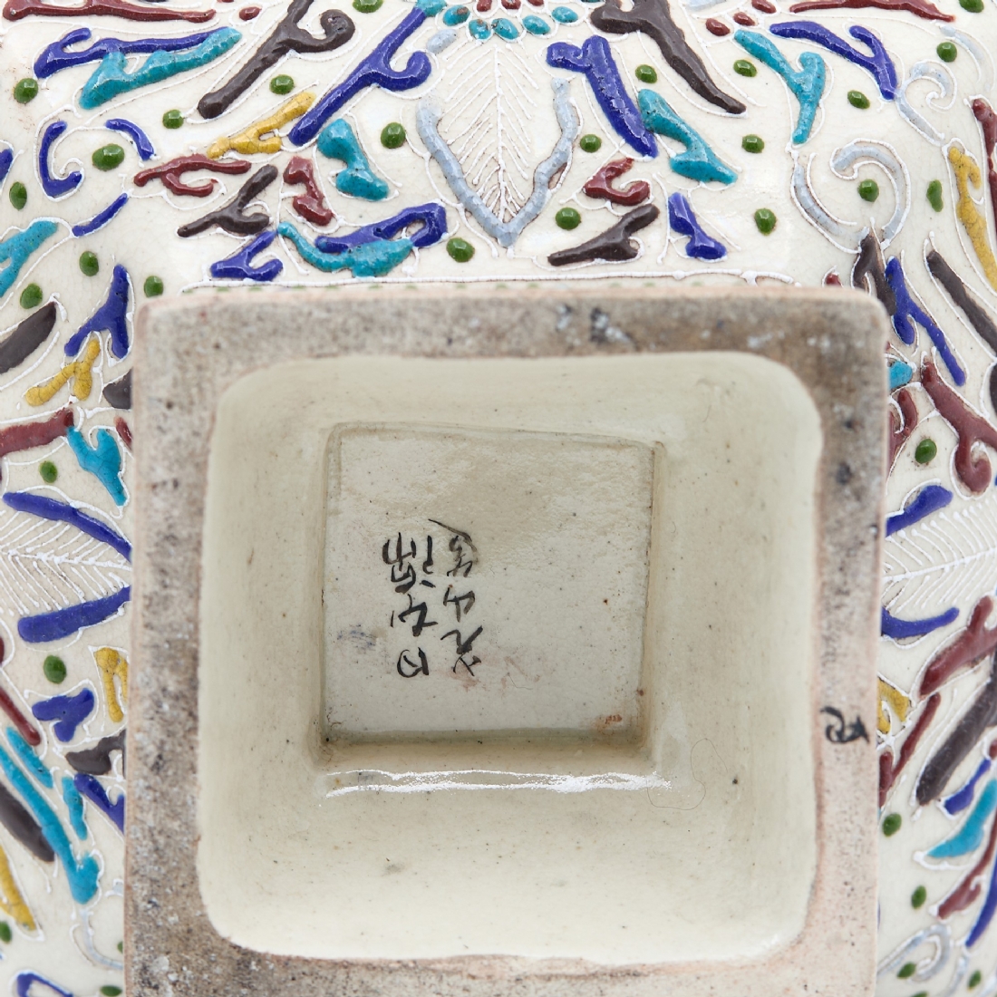 אגרטל קרמיקה יפני עתיק, מעוטר ציורי יד באמייל בטכניקת מוריאג' (Moriage), חתום