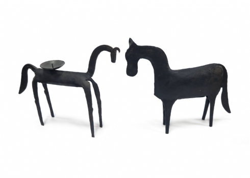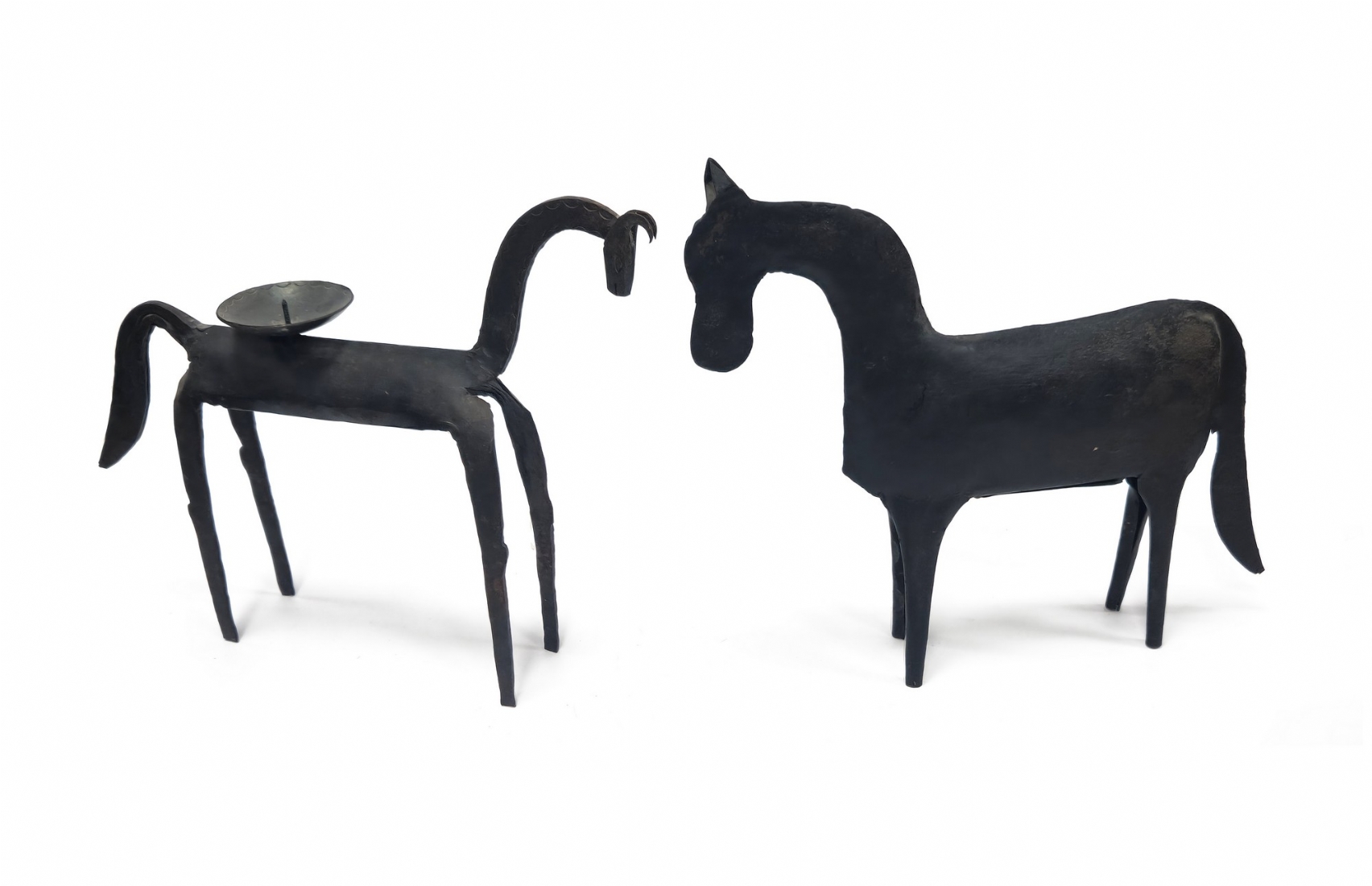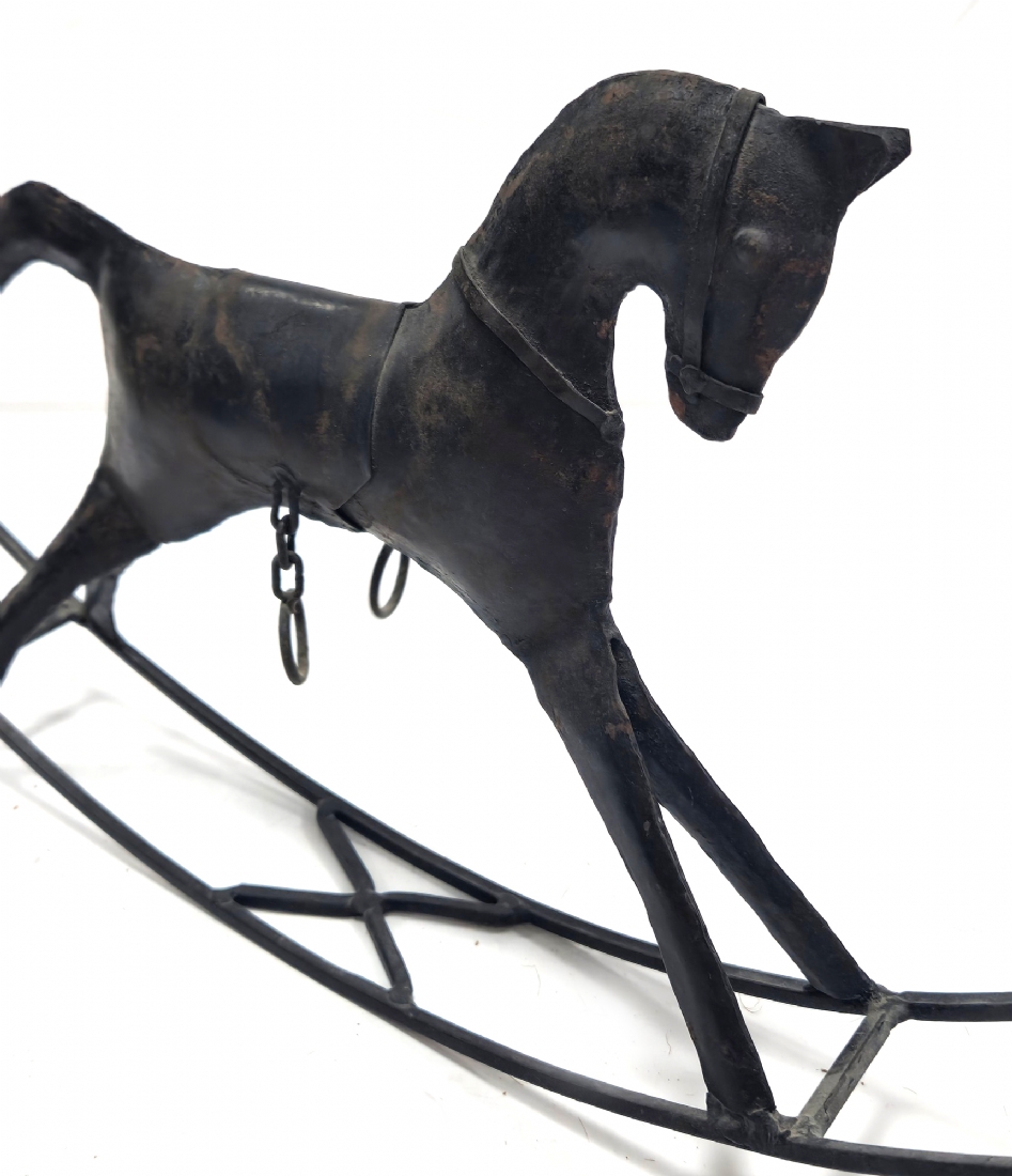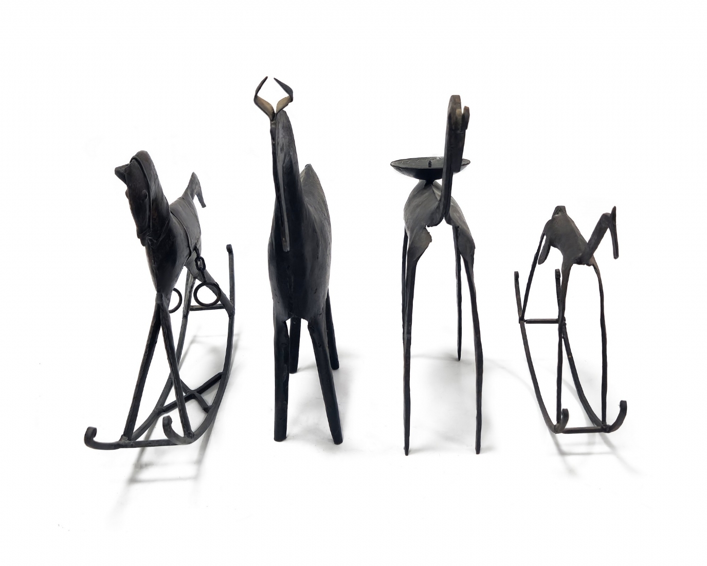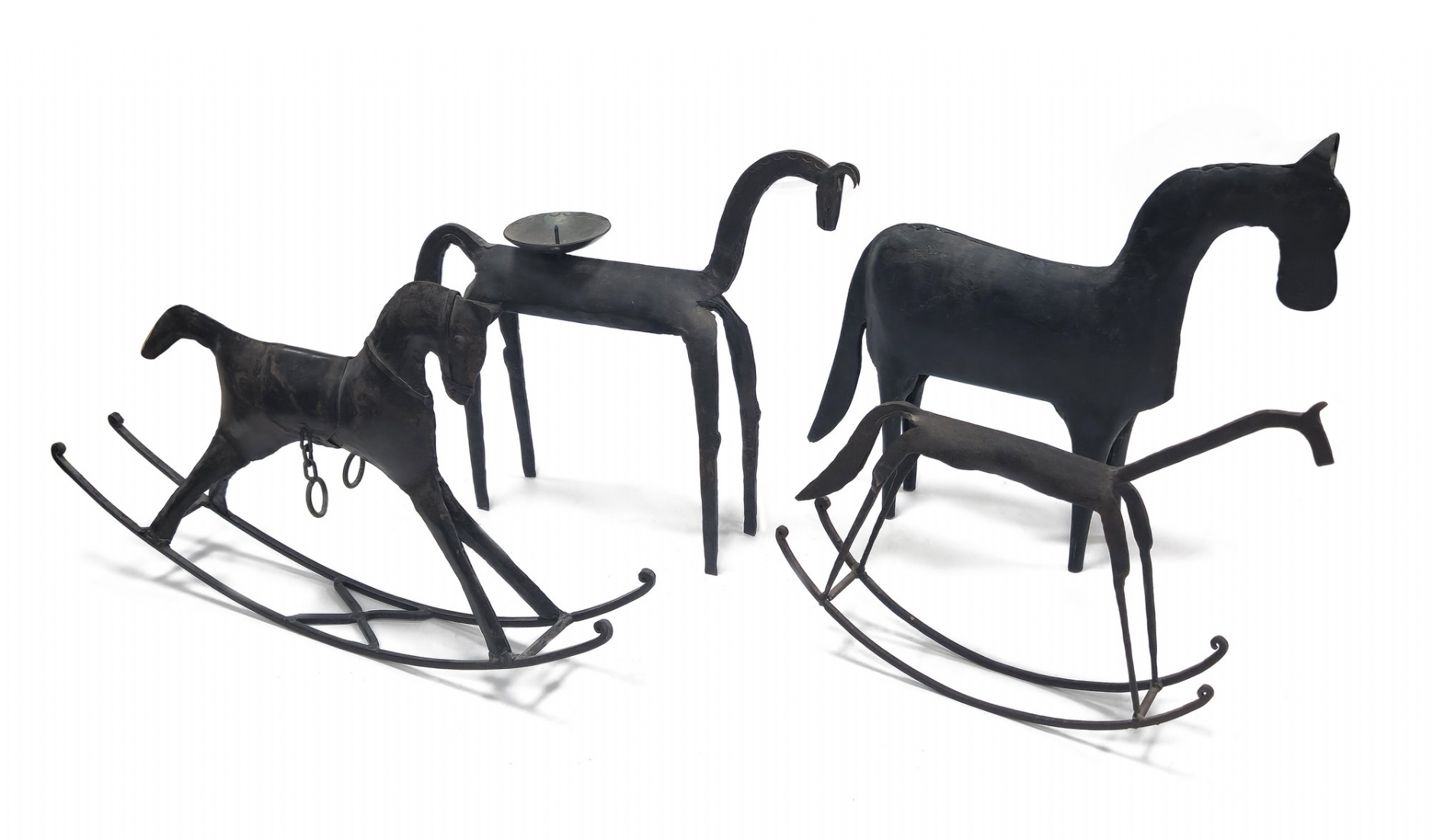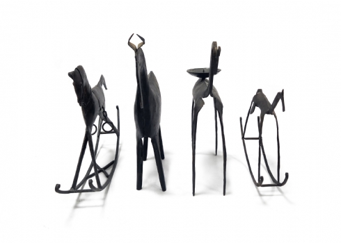 ארבעה פסלי סוסים עשויים ברזל בגבהים משתנים בין 20 ס"מ ל-34 ס"מחלק מתנדנדים ובנוסף בובת ליצן