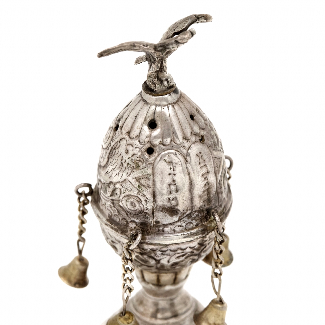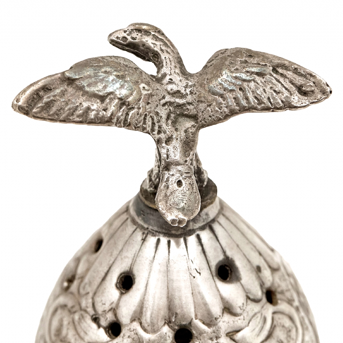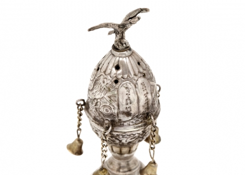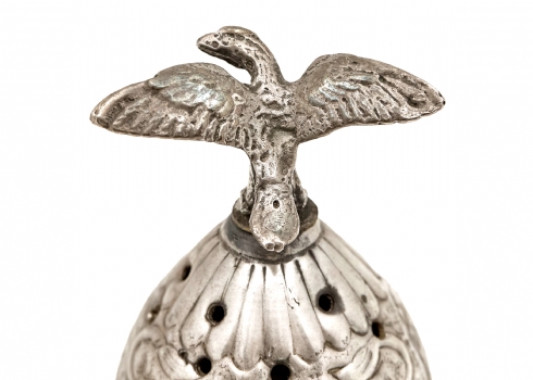 מגדל בשמים עשוי כסף '800', חתום, מעוטר בראשו בדמות ציפור