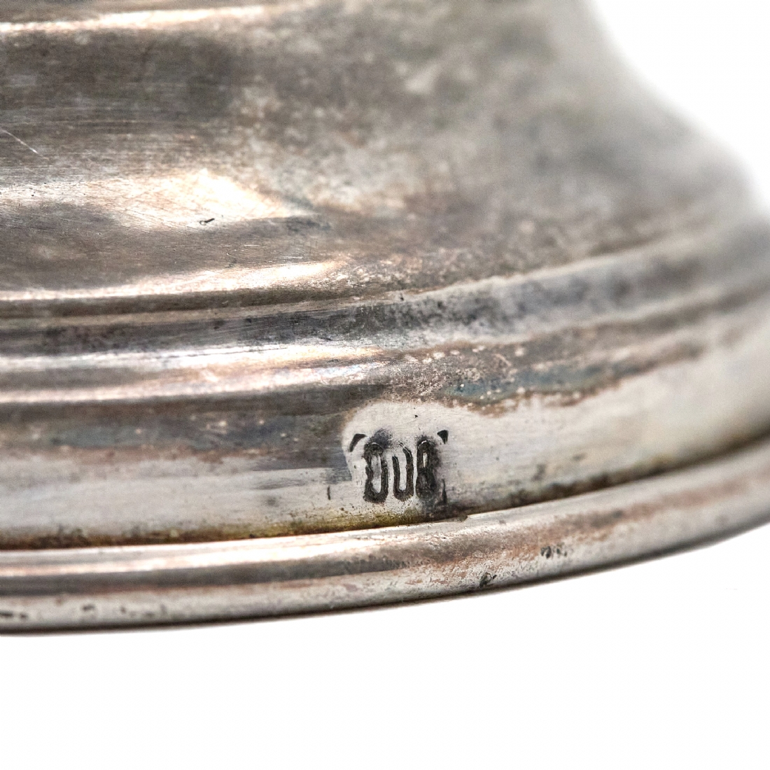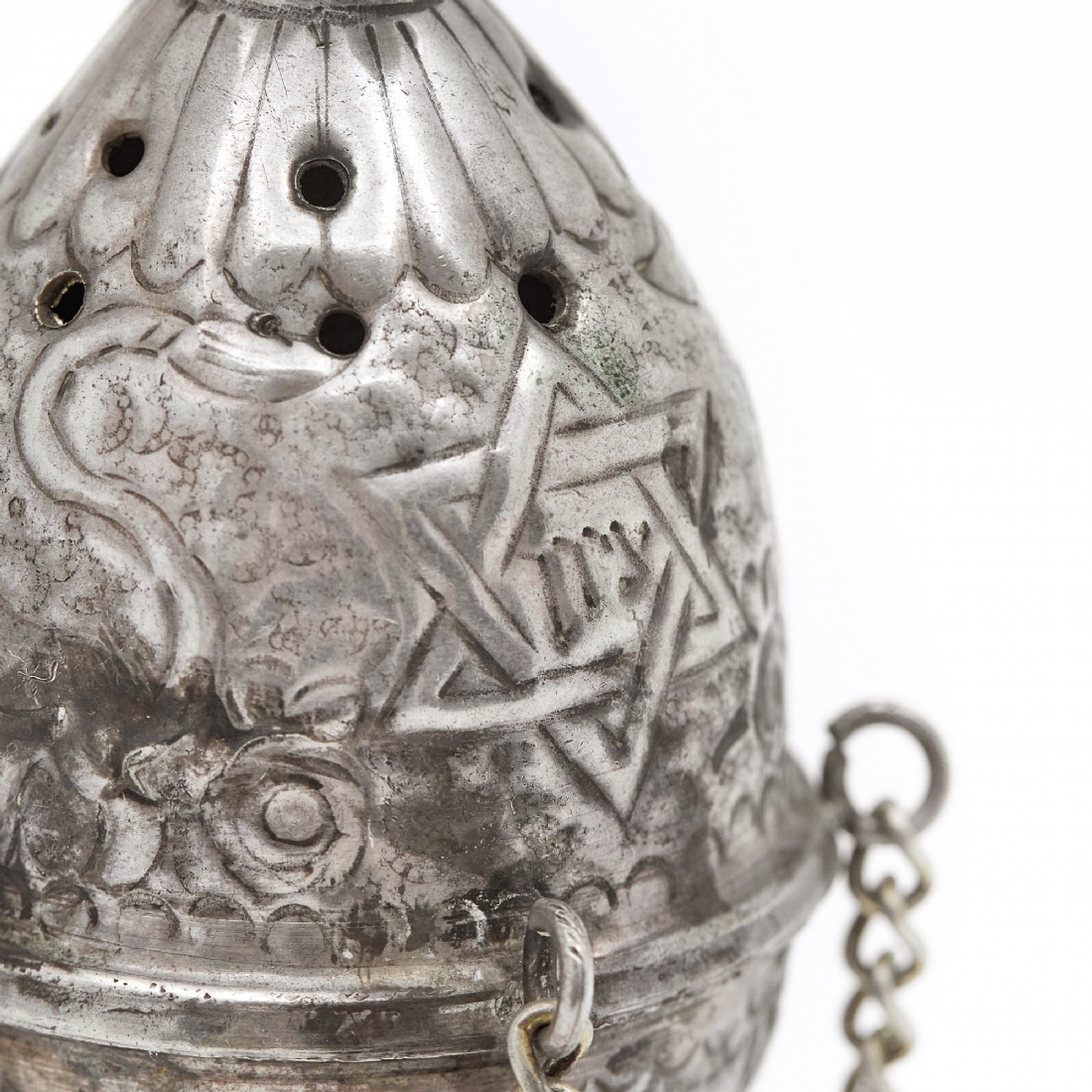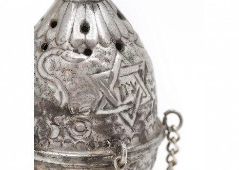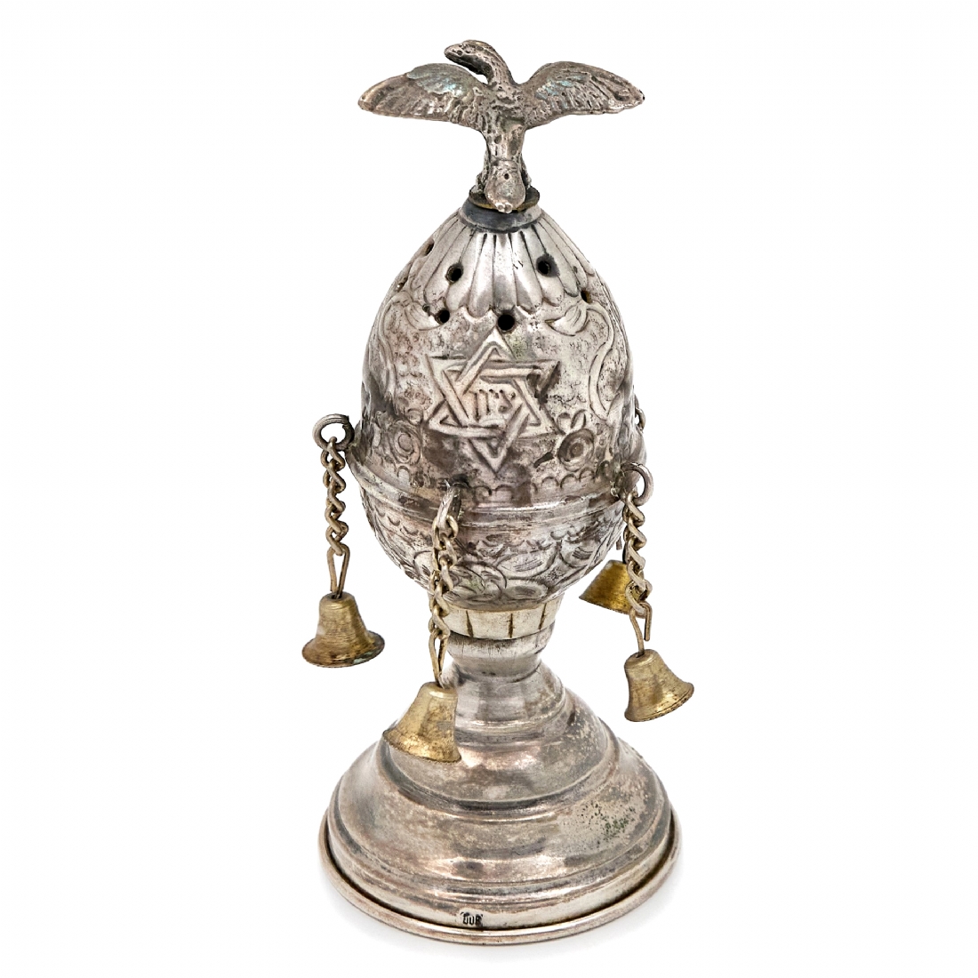 מגדל בשמים עשוי כסף '800', חתום, מעוטר בראשו בדמות ציפור
