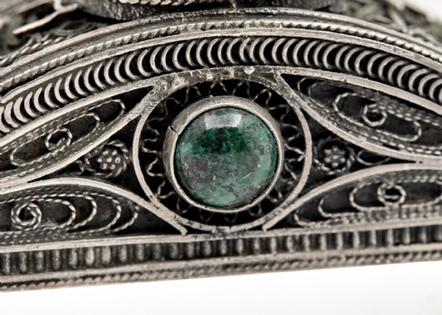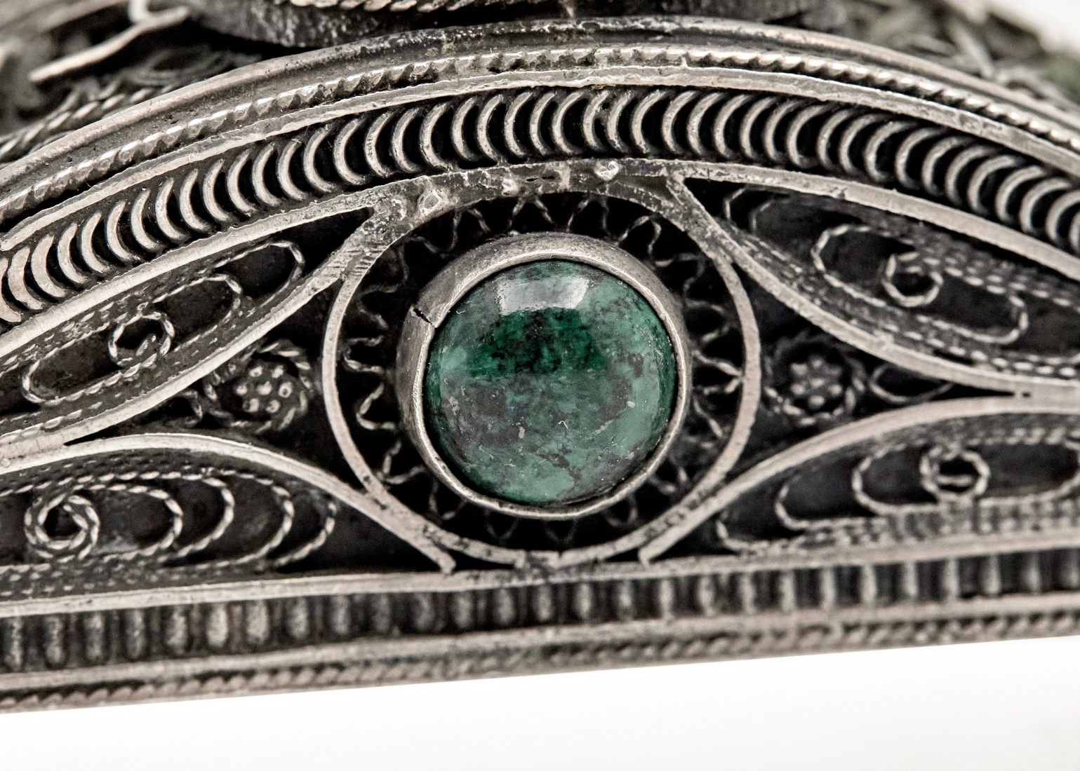 מעוטרת בעבודת פיליגראן עדינה ואיכותית, משובצת אבני אילת עגולה בליטוש קאבושון
