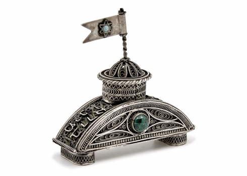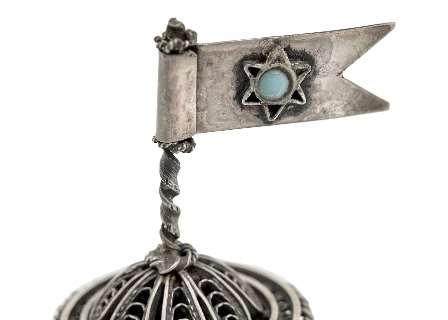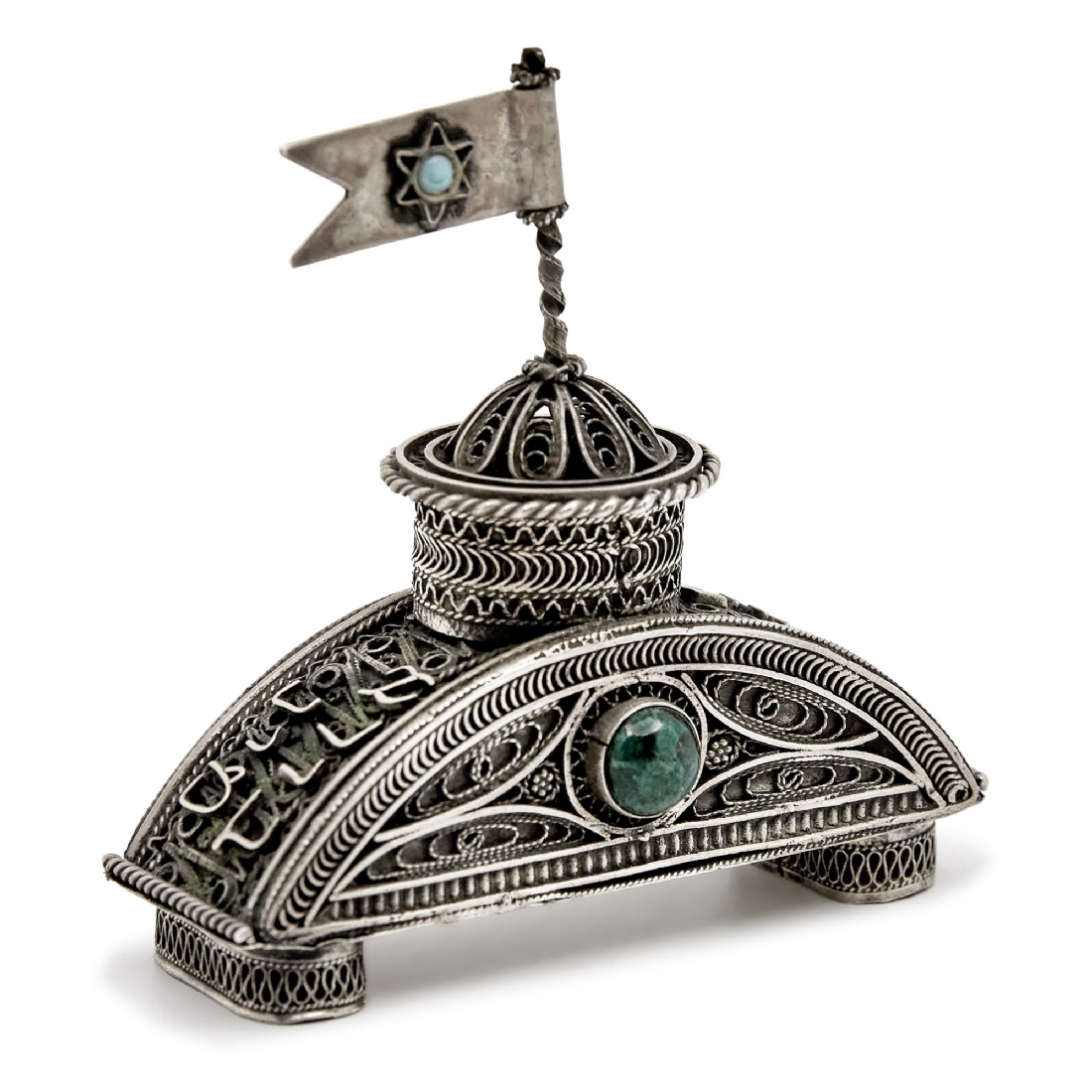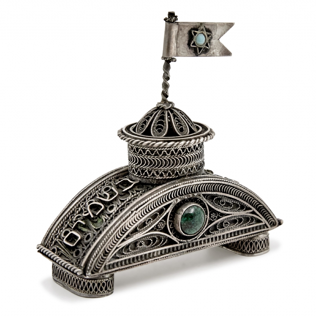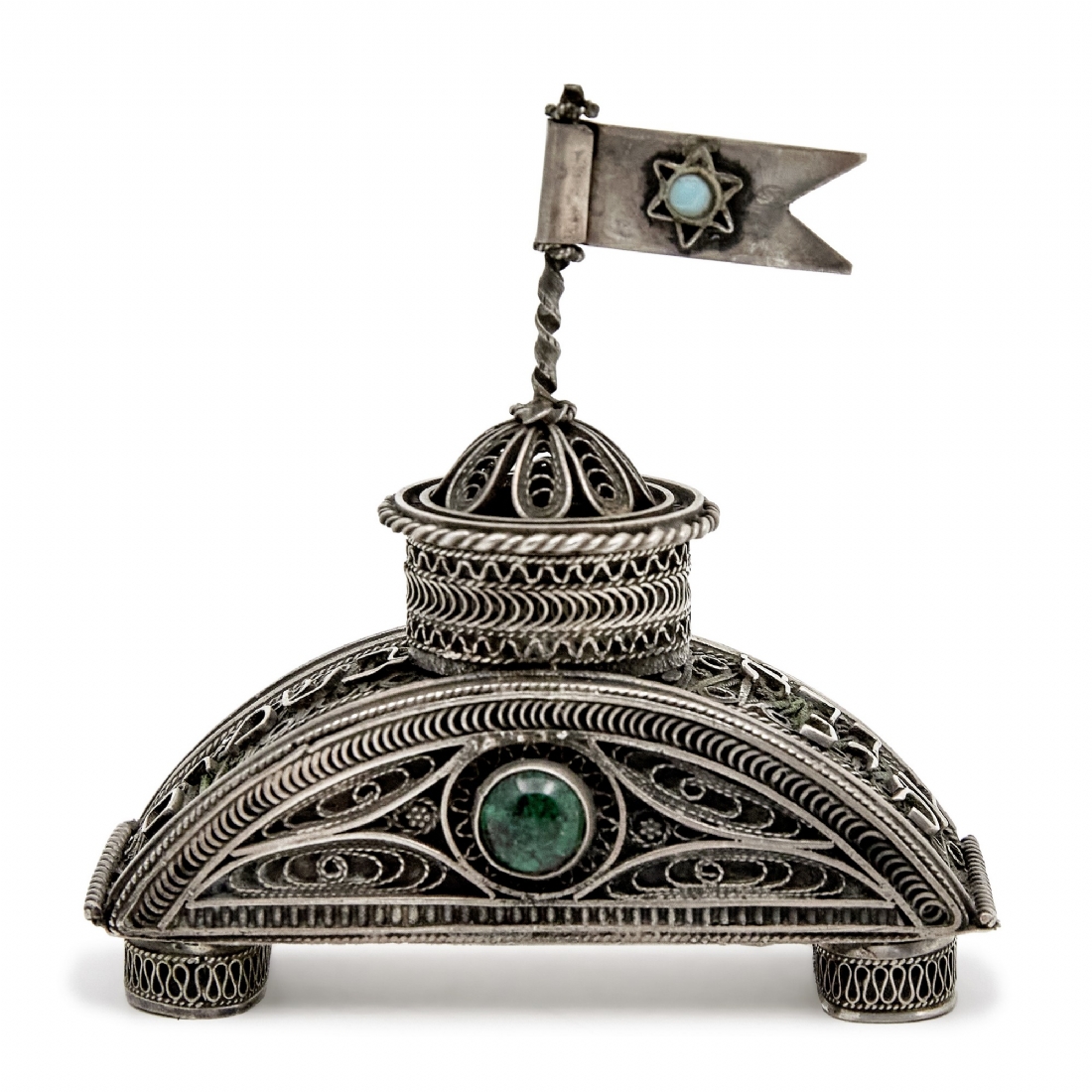קופסת בשמים מתוצרת בצלאל, עשויה כסף 935 וחתומה
