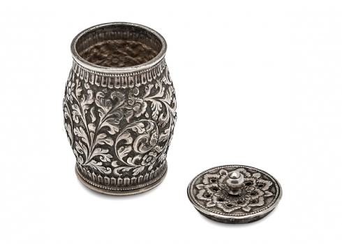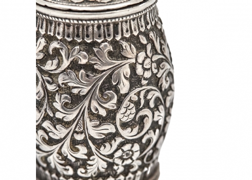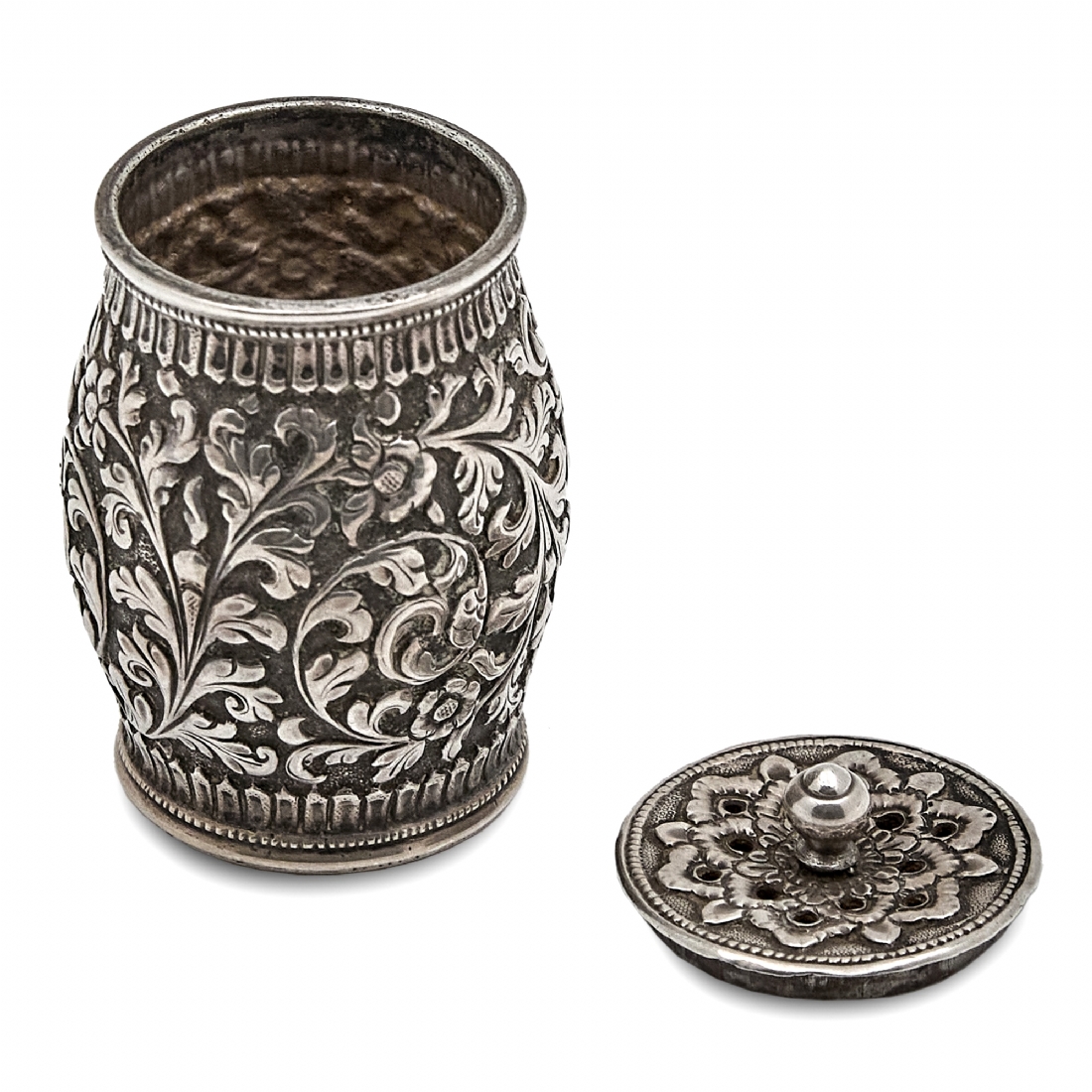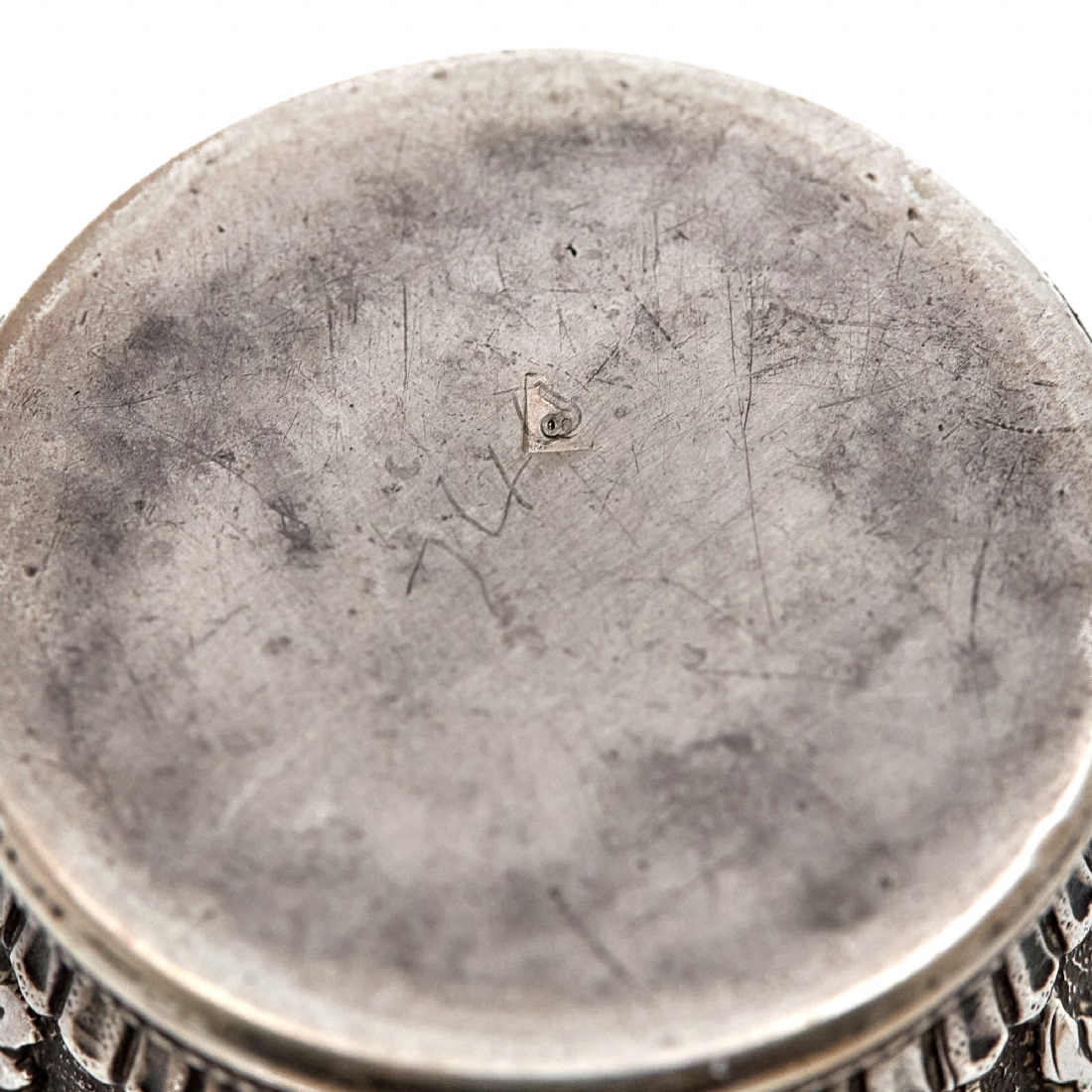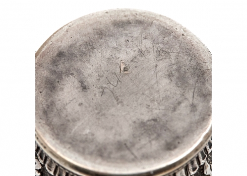 (כפי הנראה חותמת מאוחרת), מעוטר בעבודת ריקוע ידנית משקל: 74 גרם קוטר: 4 ס"מ גובה: 6.5 ס"מ
