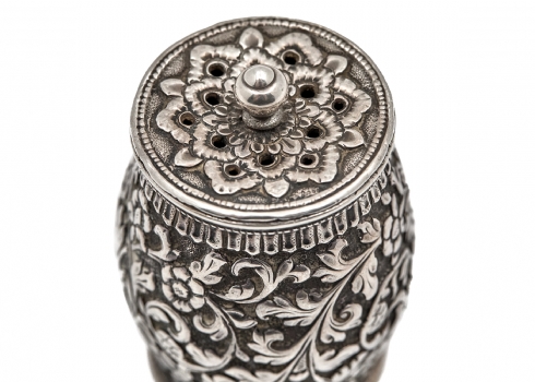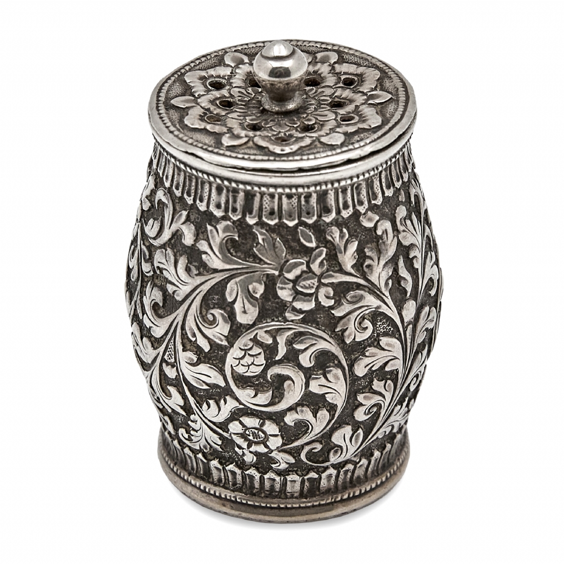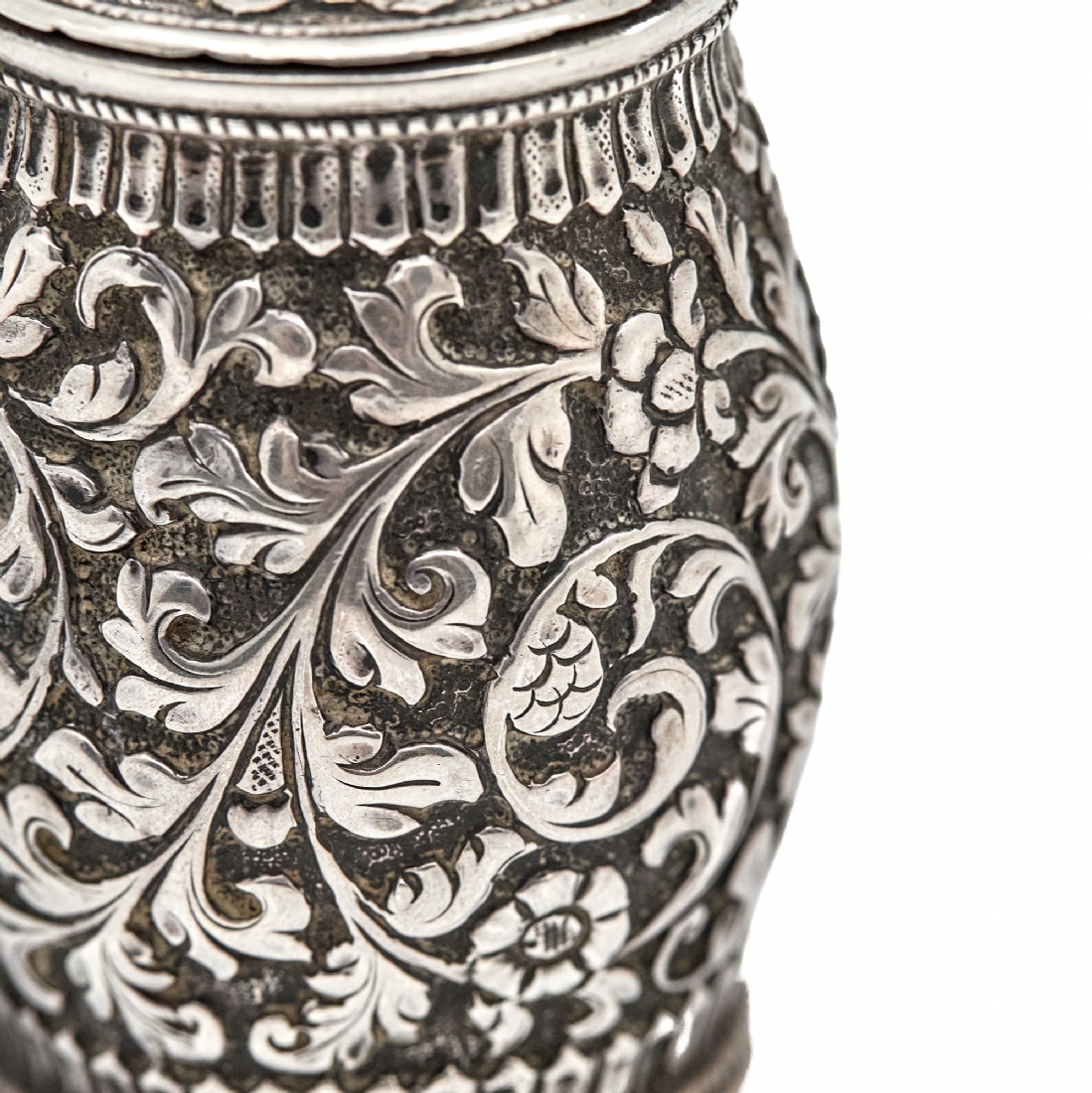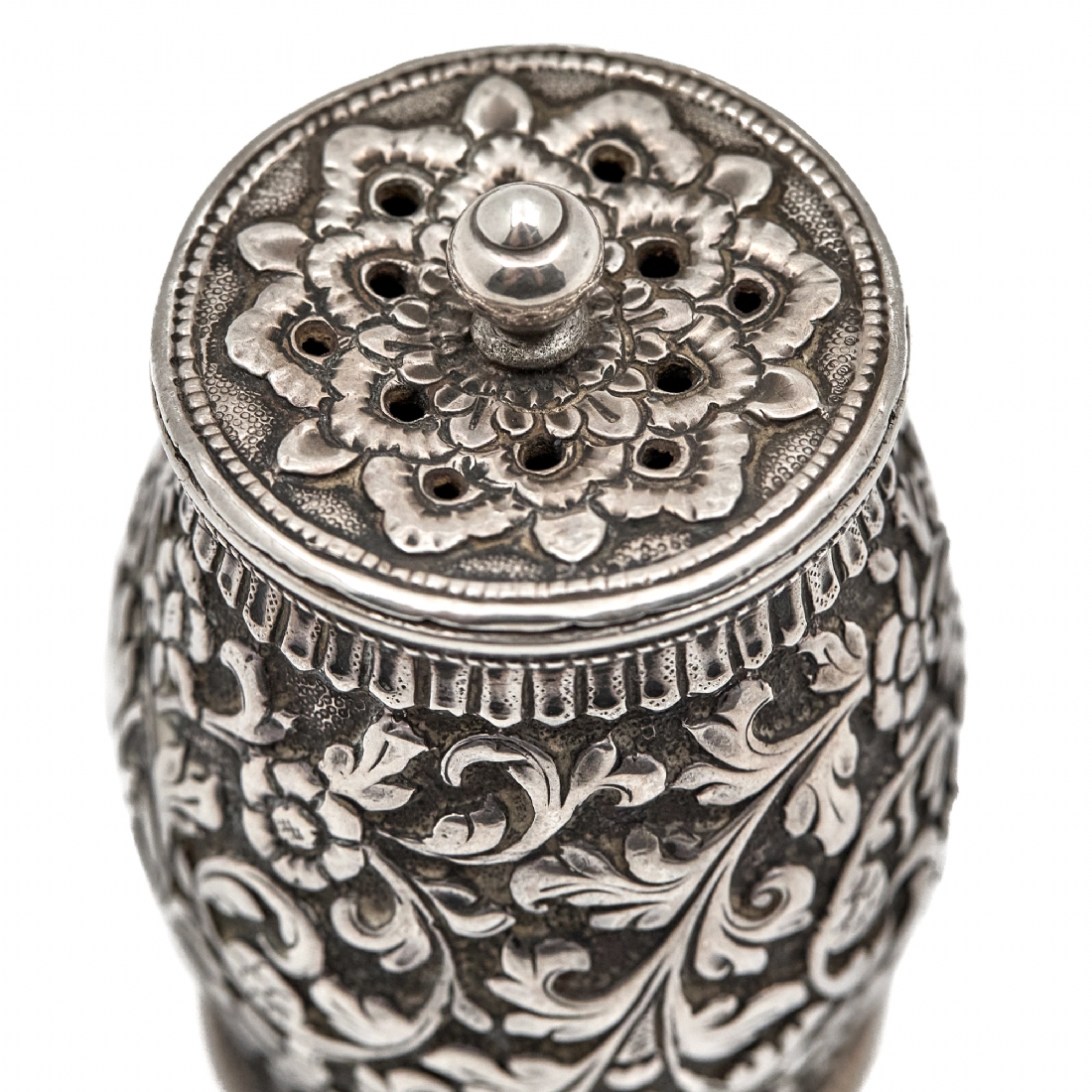 (כפי הנראה חותמת מאוחרת), מעוטר בעבודת ריקוע ידנית משקל: 74 גרם קוטר: 4 ס"מ גובה: 6.5 ס"מ