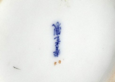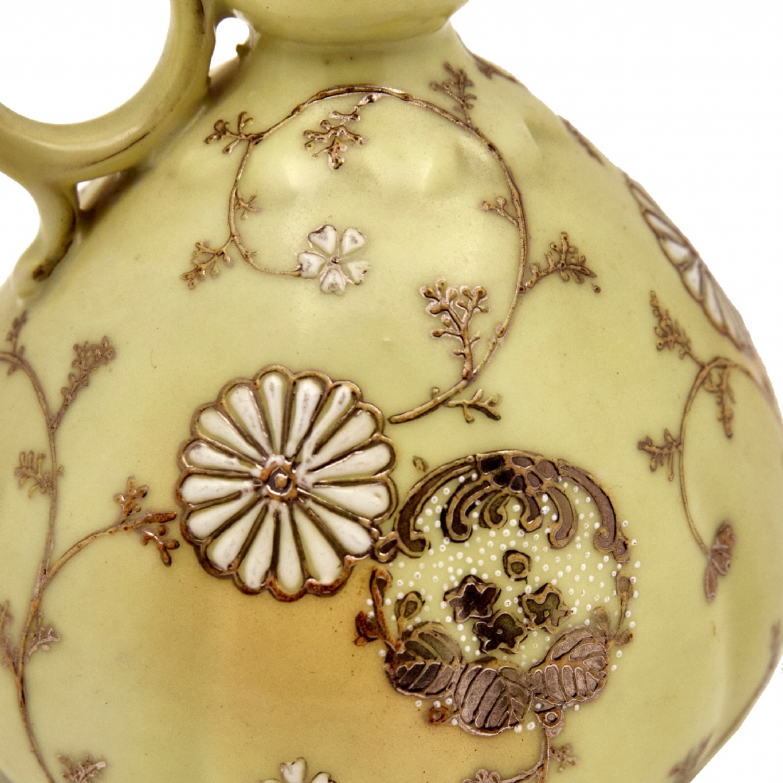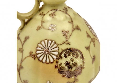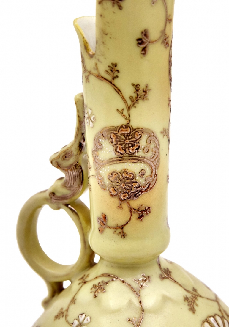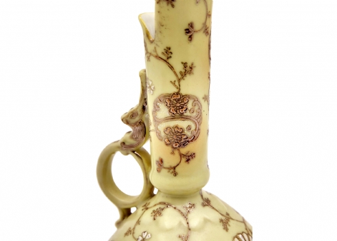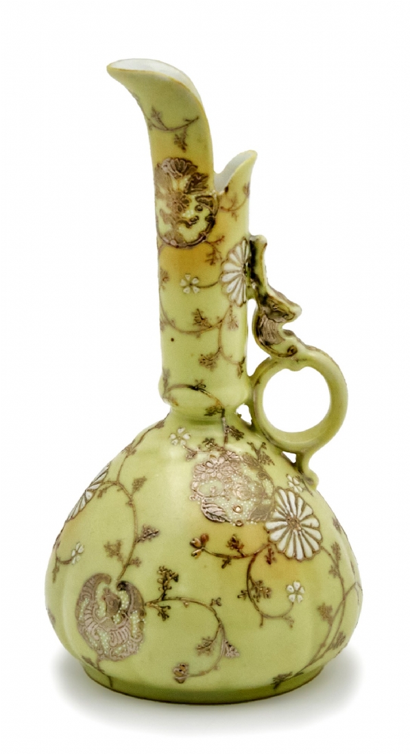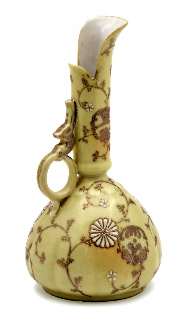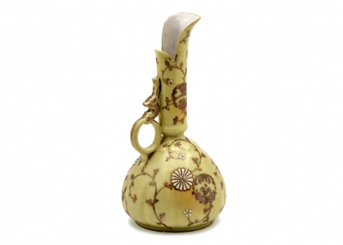 קנקן פורצלן יפני מעוטר בזהב על רקע צהוב חלמון חתום