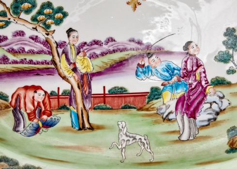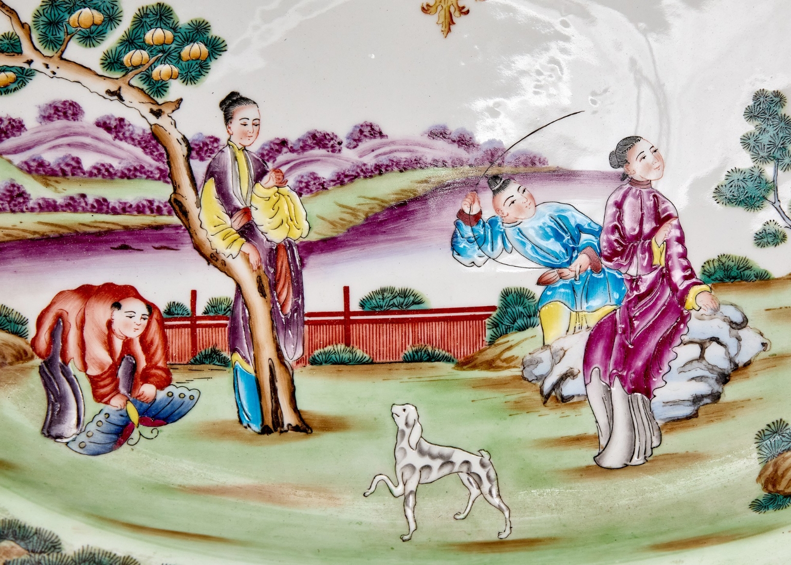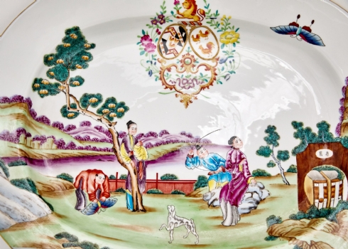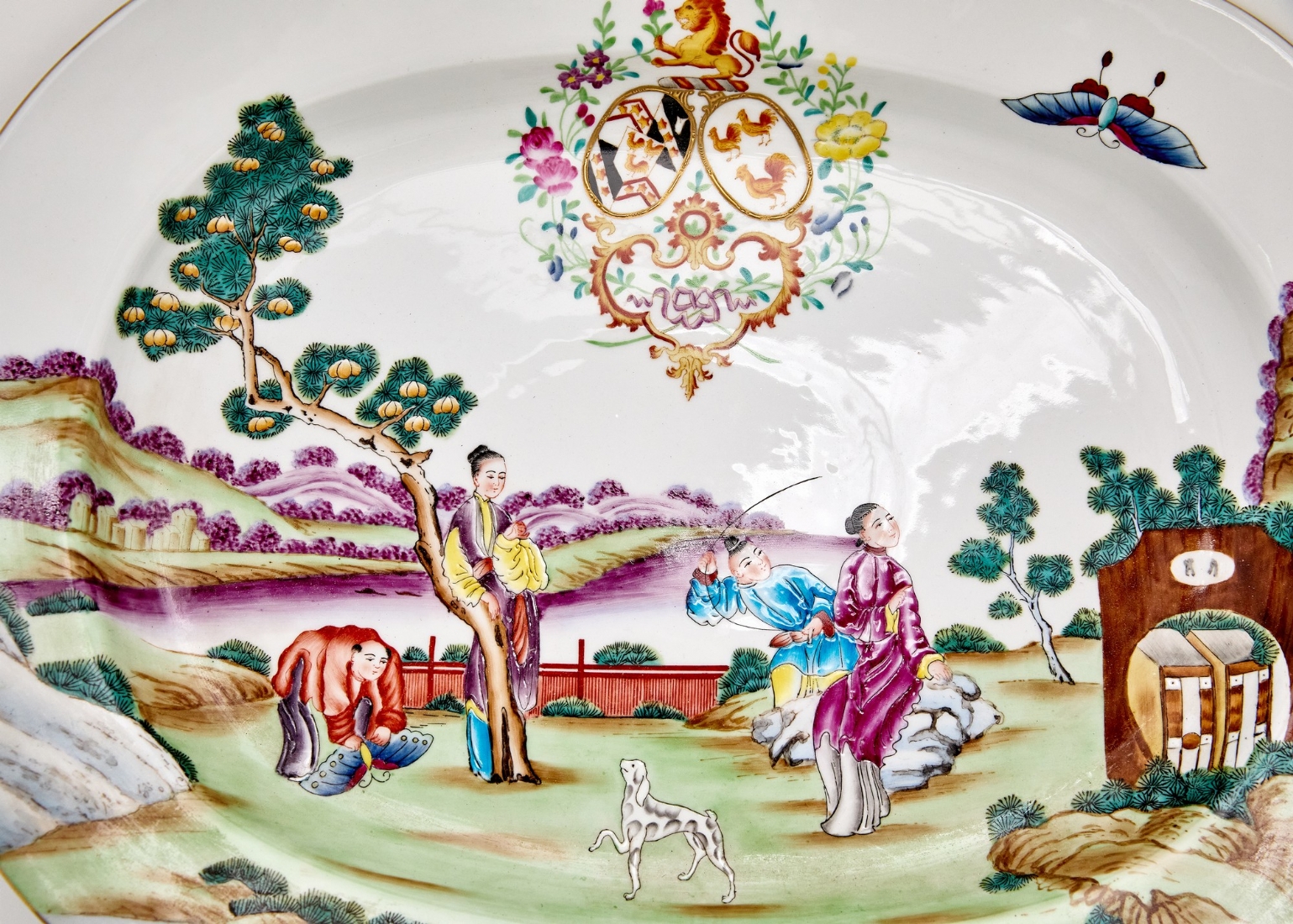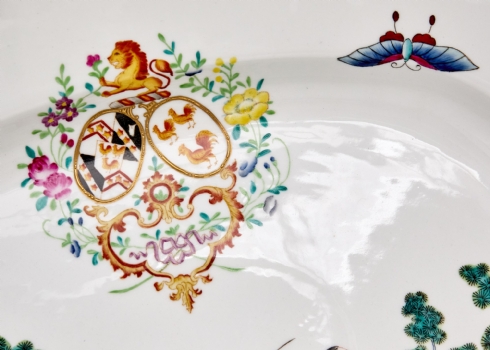 מגש פורצלן סיני גדול, מעוטר בסמלים הרלדיים בציורי יד, פוליכרום וזהב, חתום