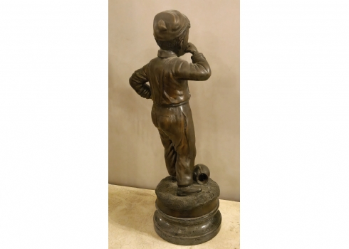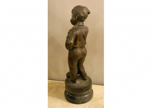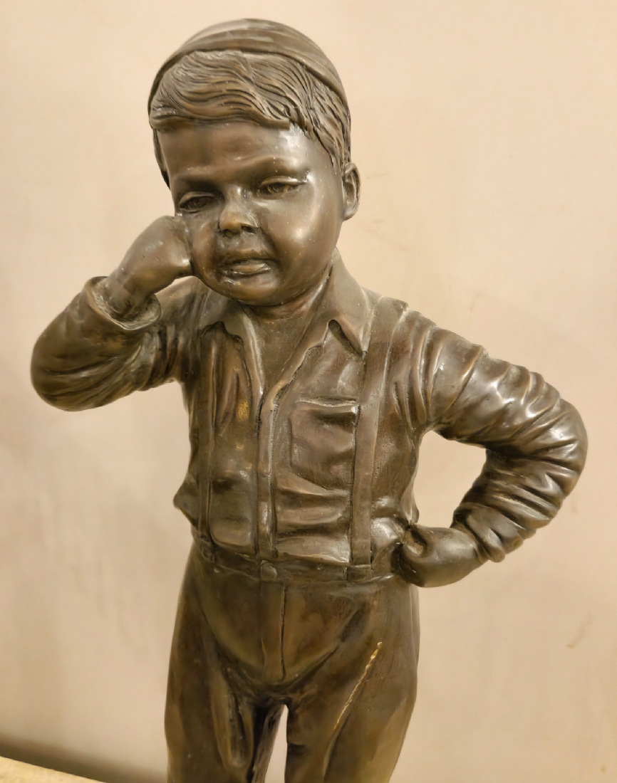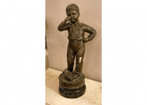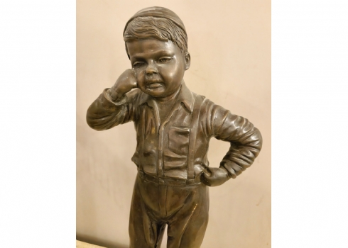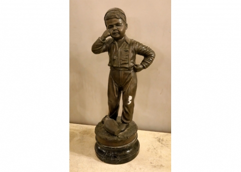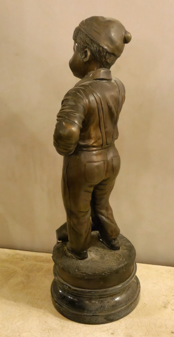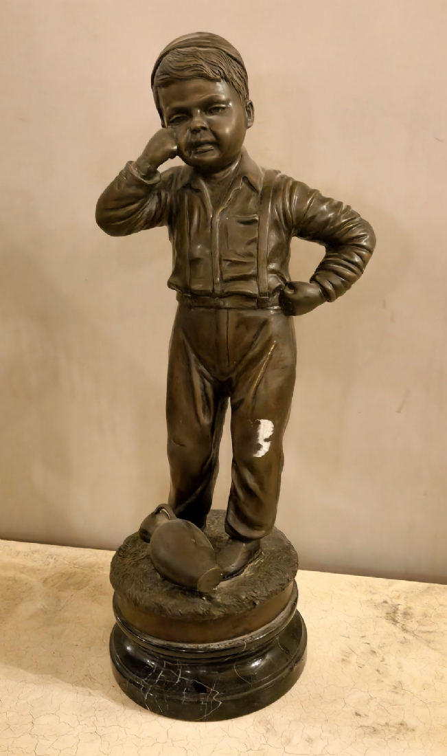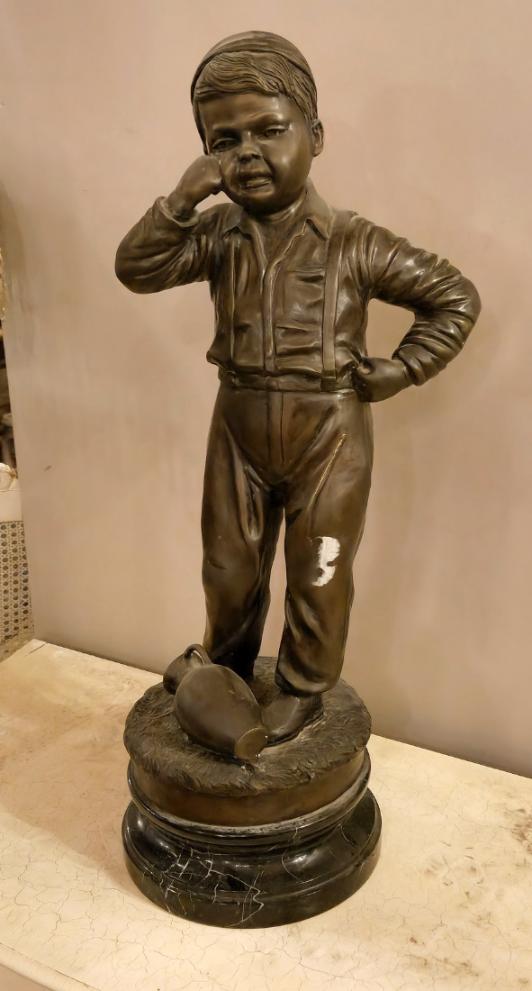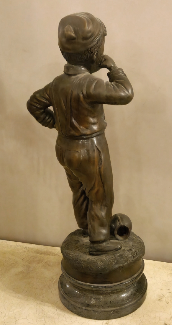 פסל ברונזה בדמות ילד ולצידו כד, עשוי פטינה חומה ובסיס שיש שחור מנומר