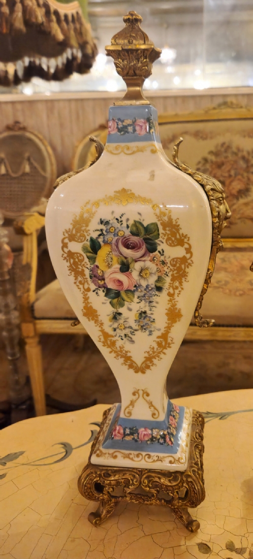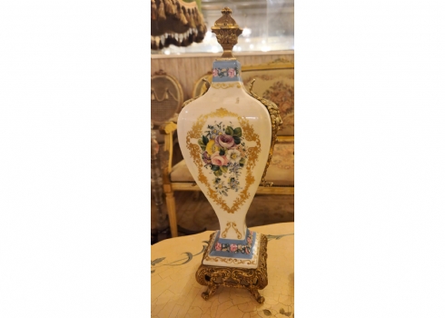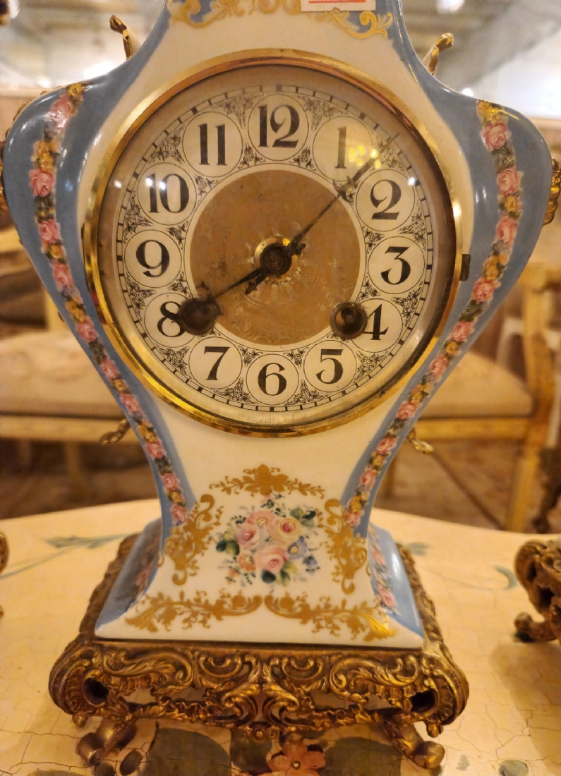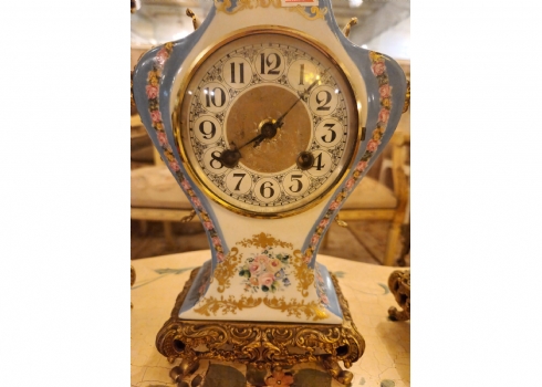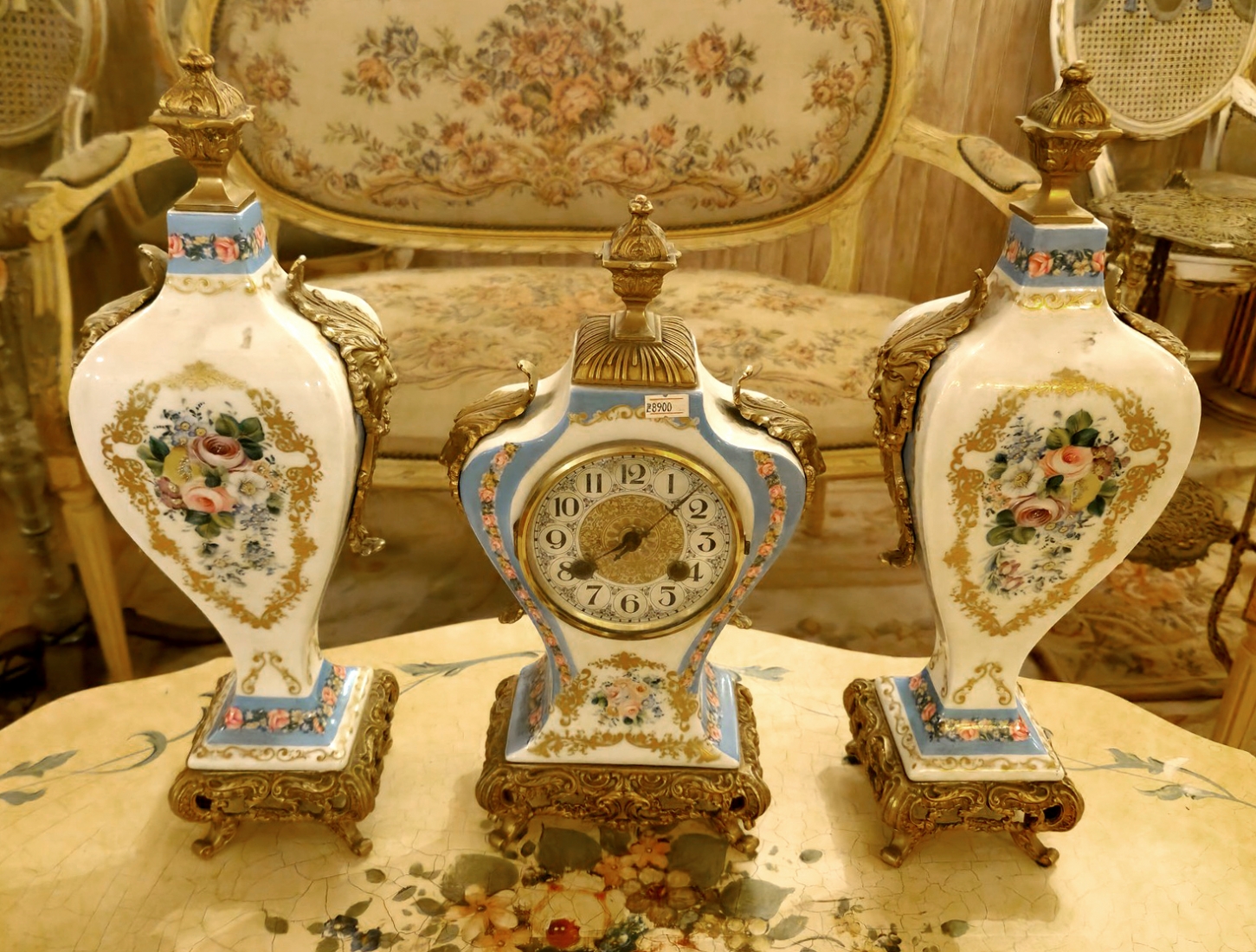 גרניטורה הכוללת שעון וזוג אגרטלים תואמים עשויים חרסינה והתקני מתכת