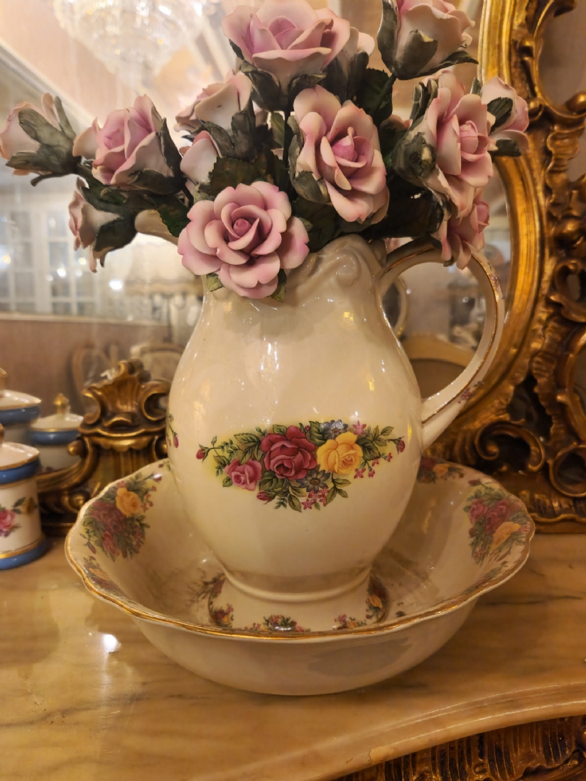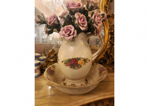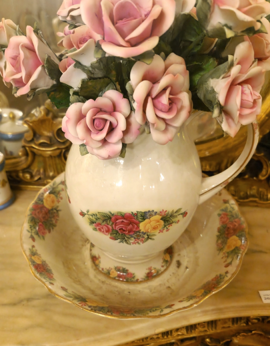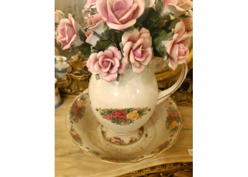 כד וקערה עשויים חרסינה בתוכם זר פרחים, חתומים