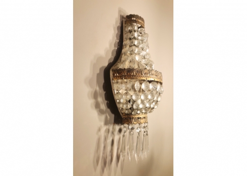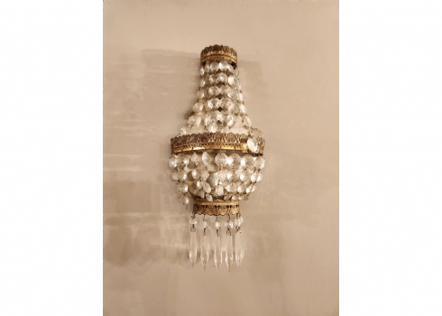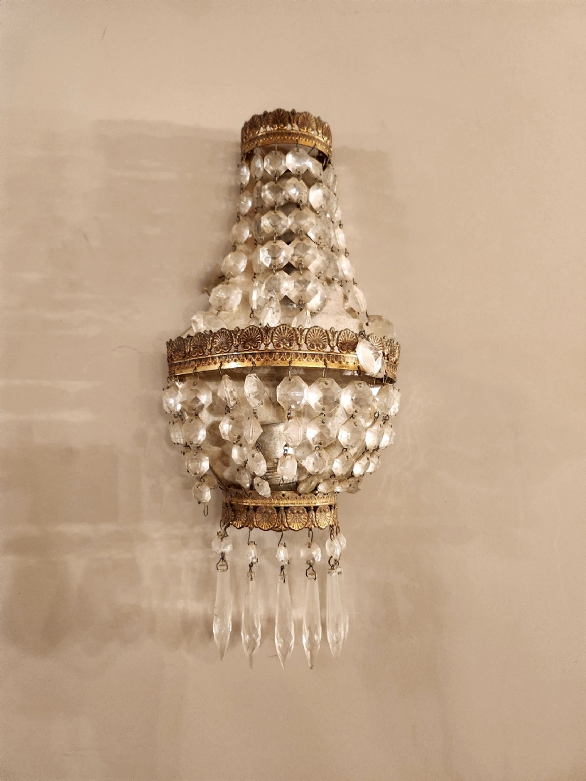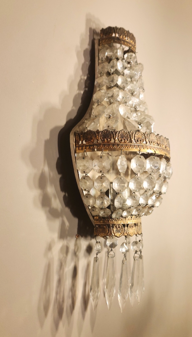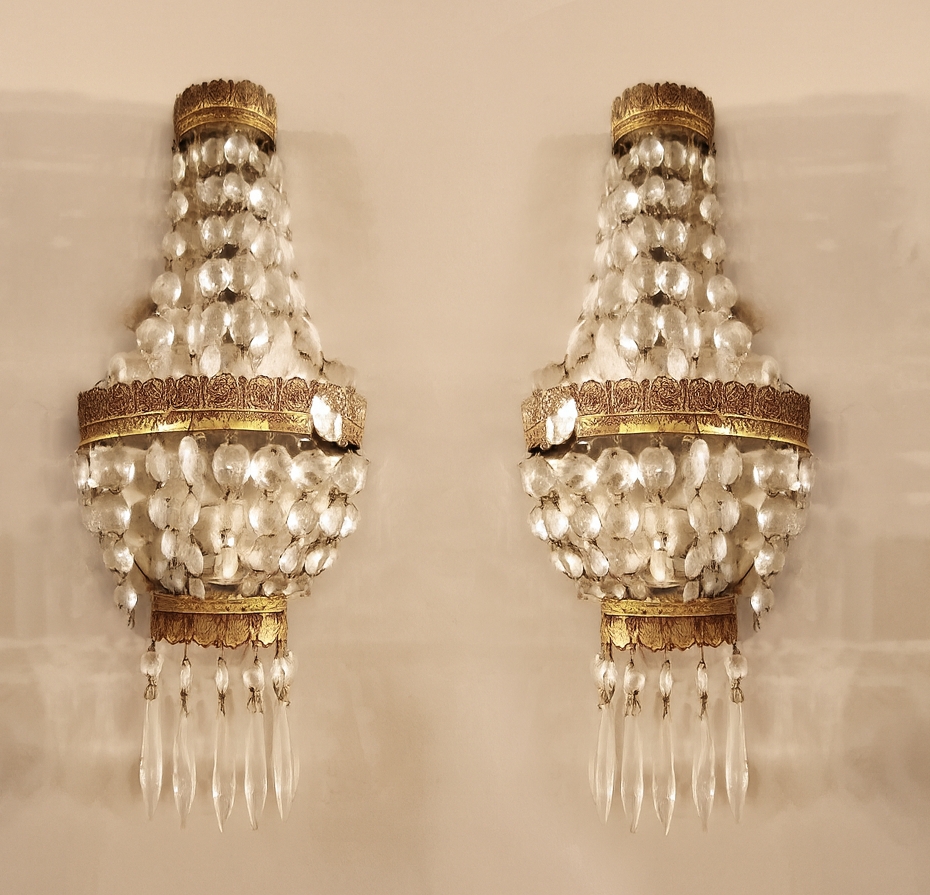 זוג מנורות קיר בסגנון צרפתי עתיק עשויות נחושת מוזהבת וגדילי קריסטל