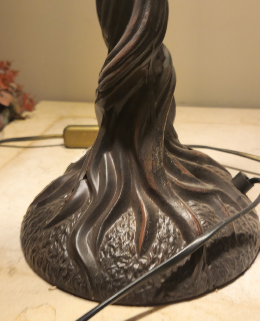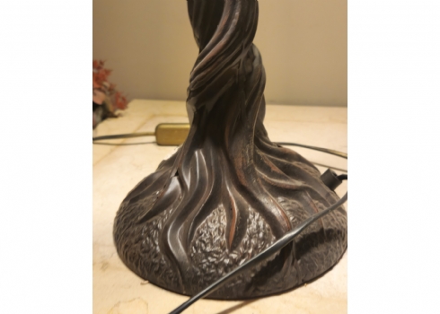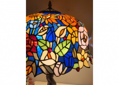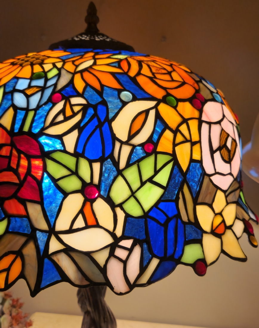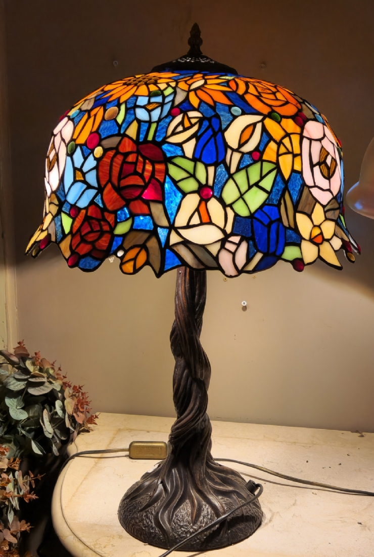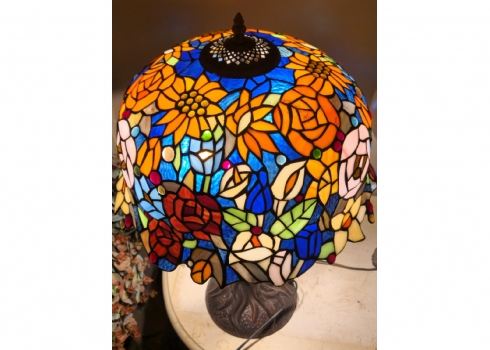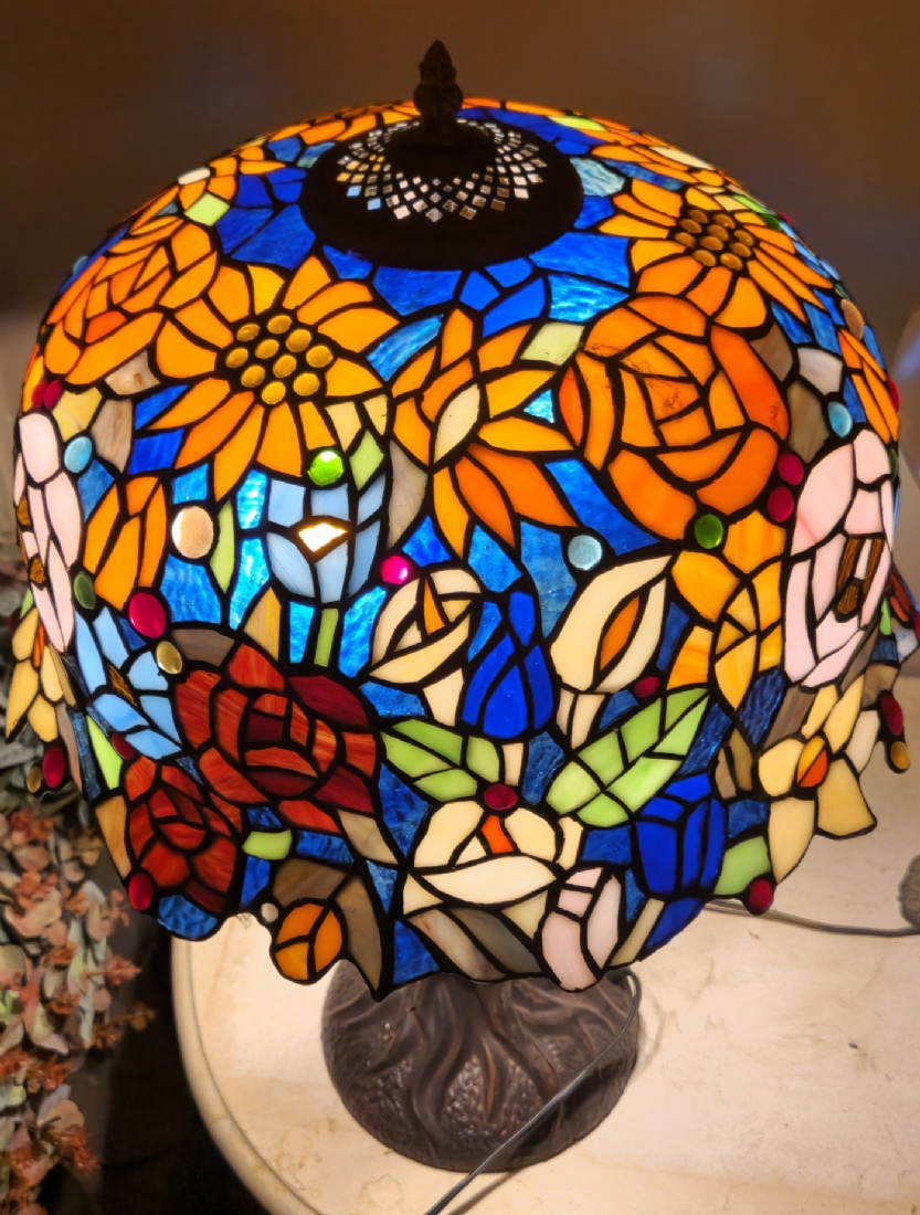 מנורה שולחנית בסגנון טיפני, בסיס מתכת ואהיל ויטראז'