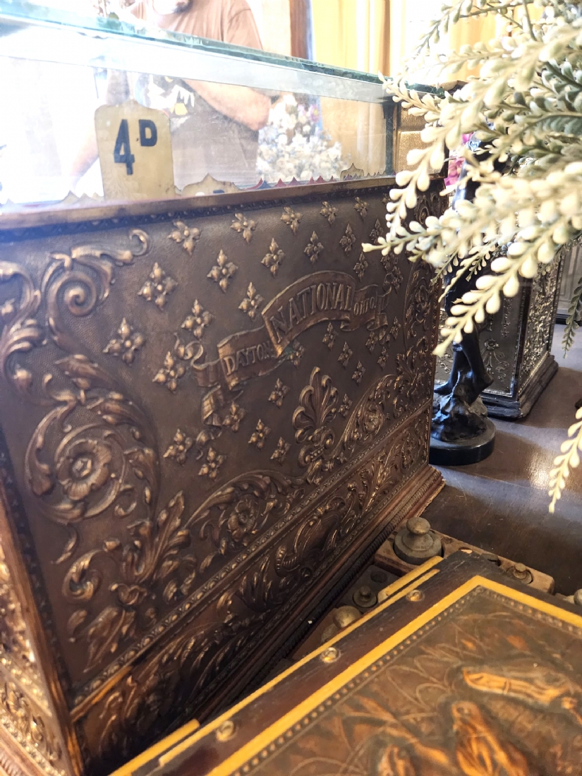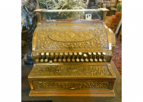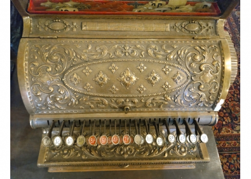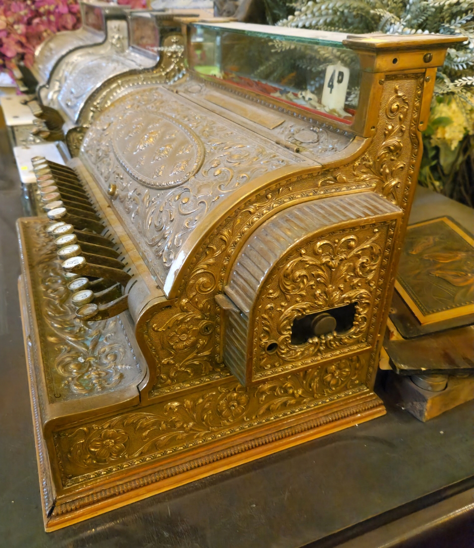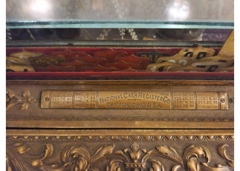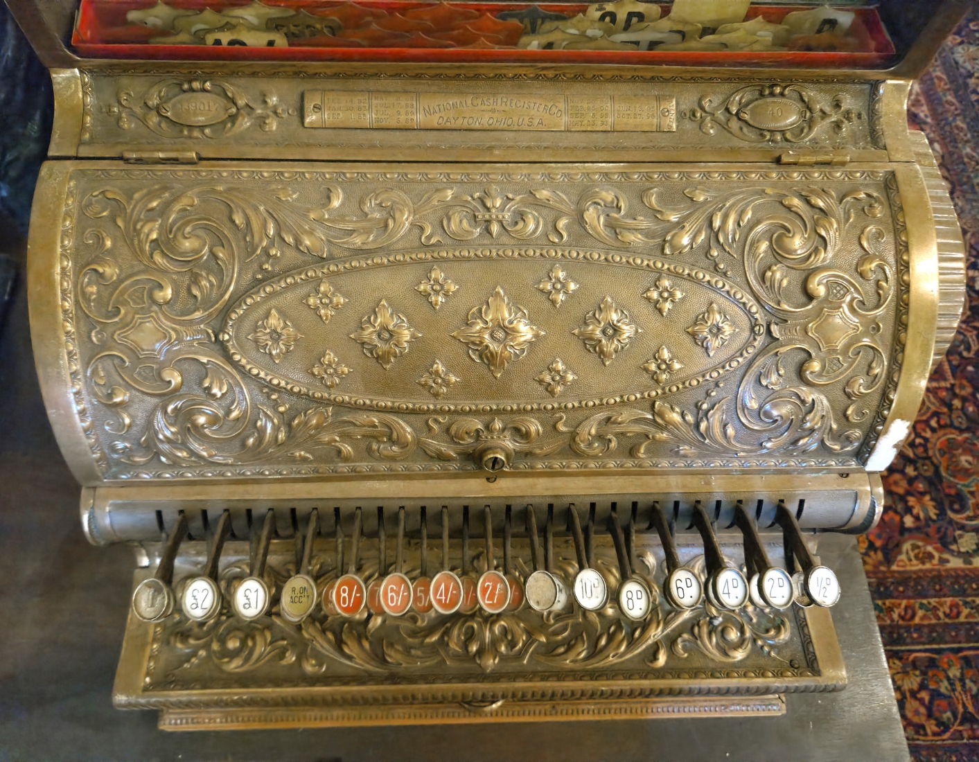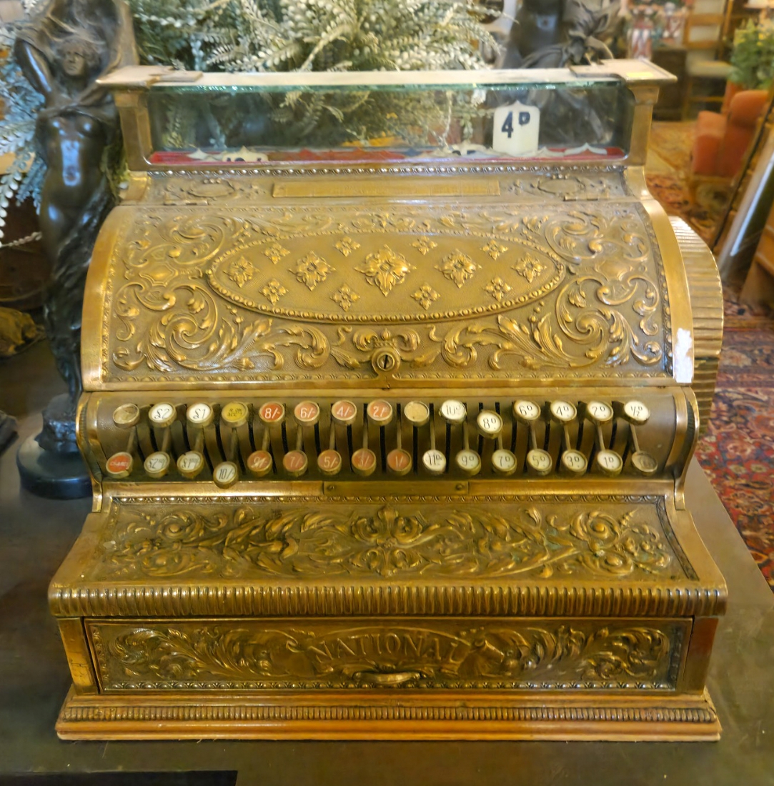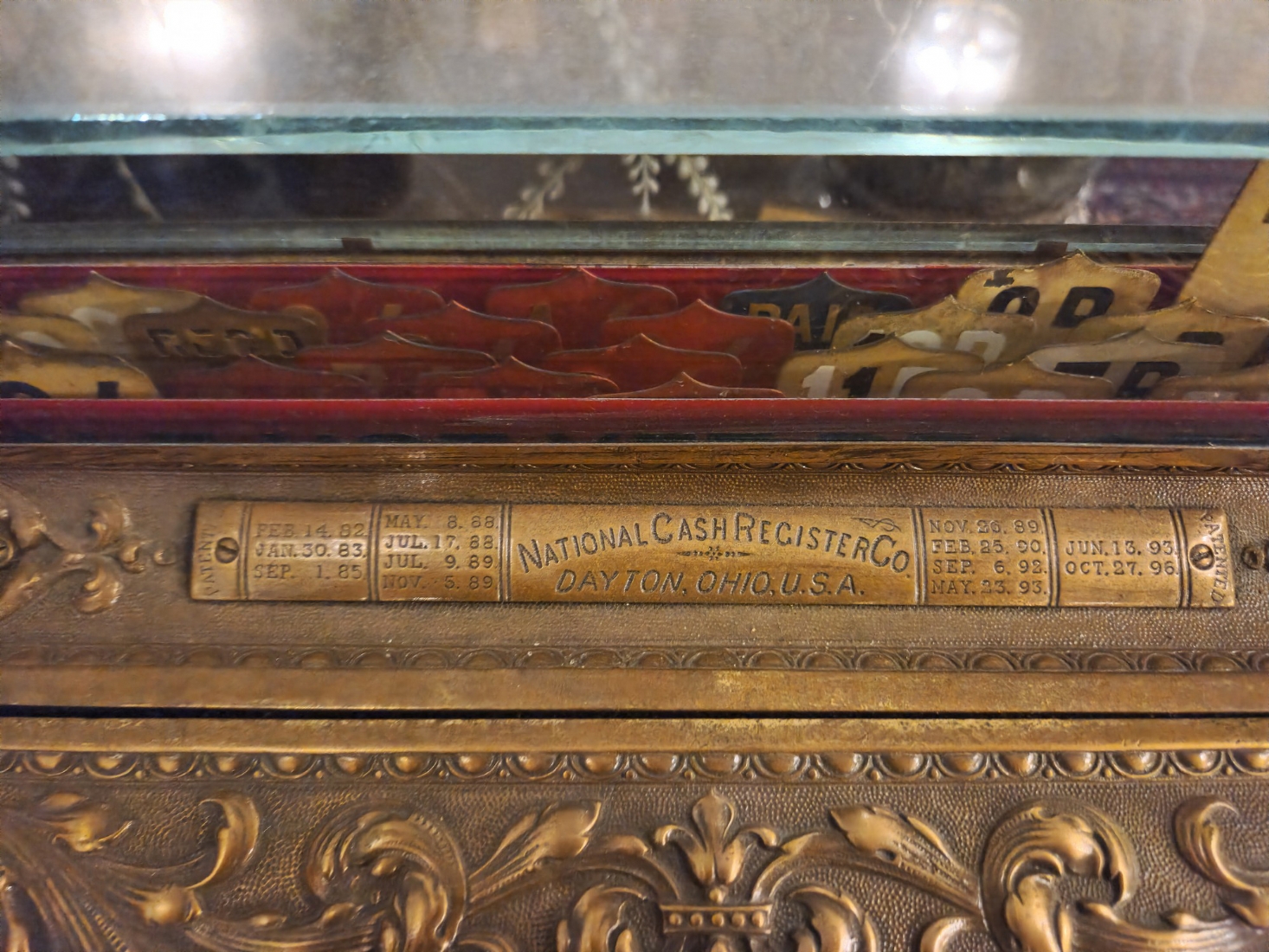 קופה רושמת אמריקאית עתיקה מהמאה ה19 תוצרת national, עשויה ברונזה וזכוכית