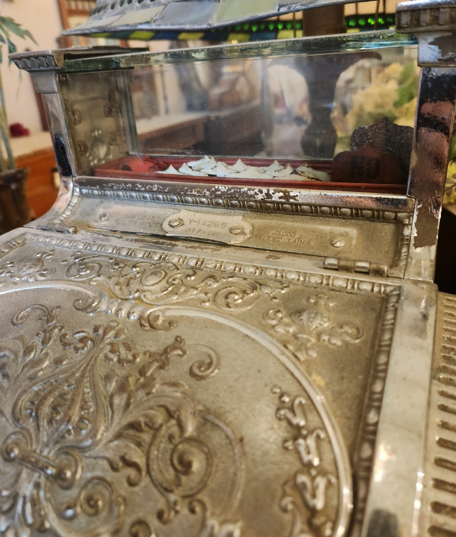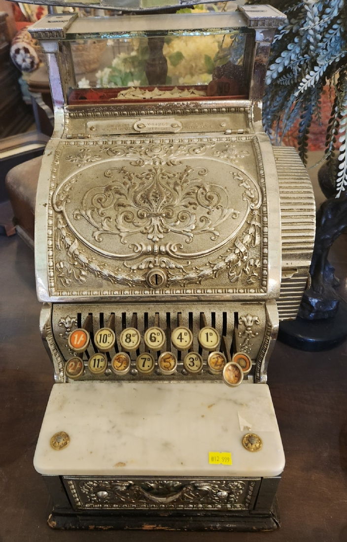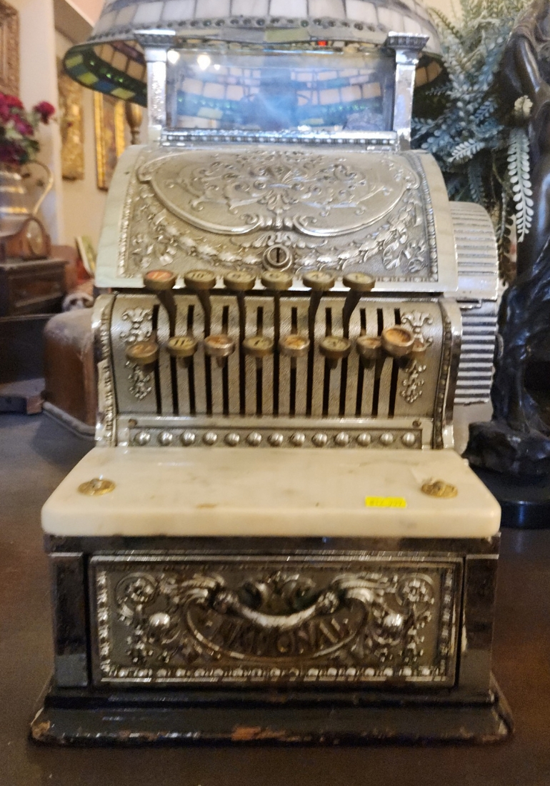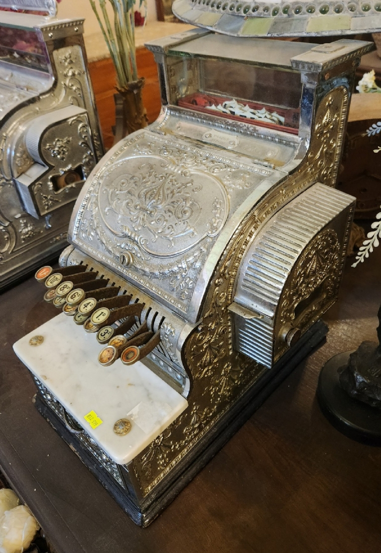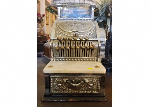 קופה רושמת אמריקאית עתיקה מהמאה ה19 עשויה ברונזה, זכוכית ומשטח שיש