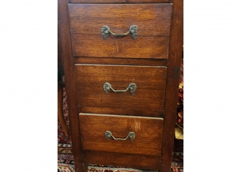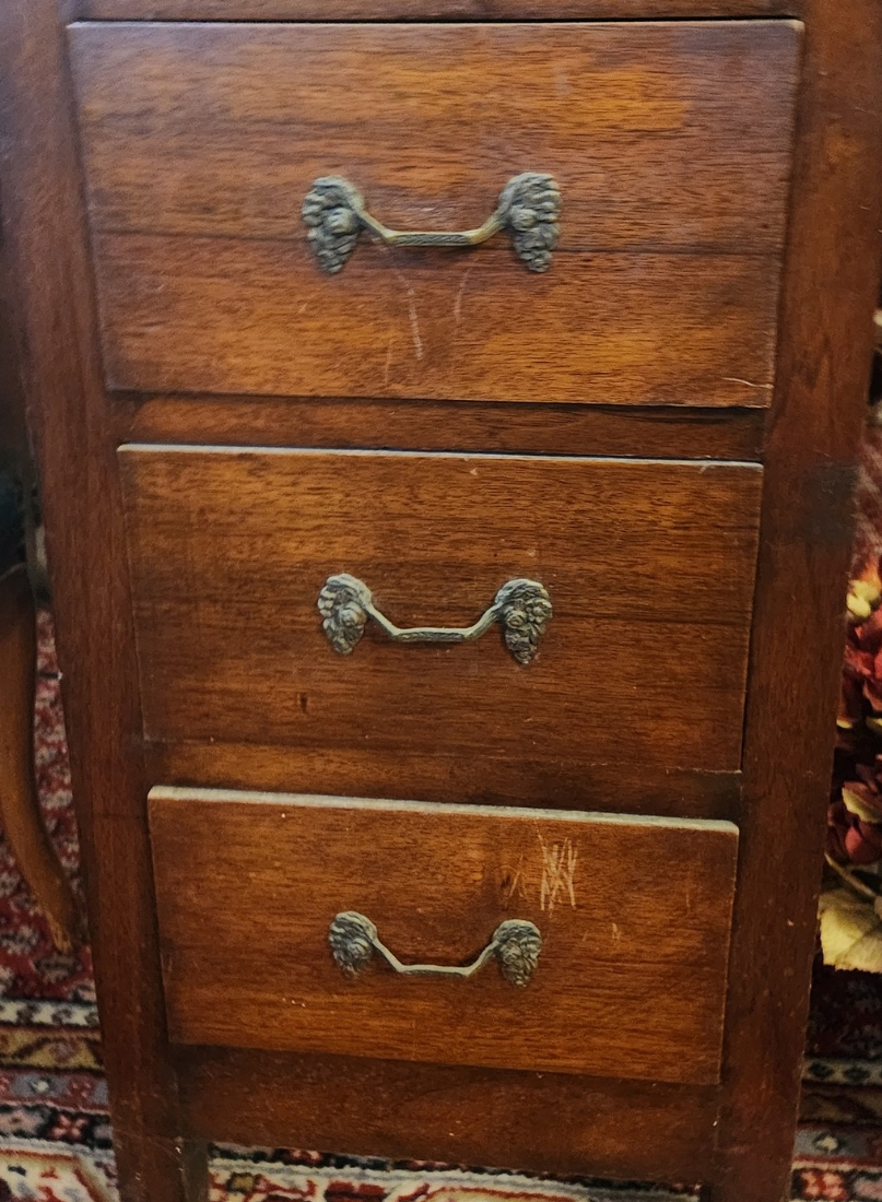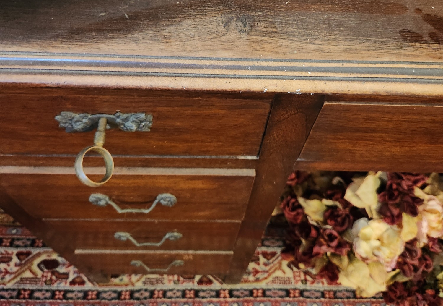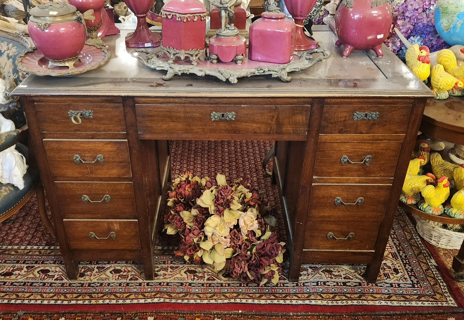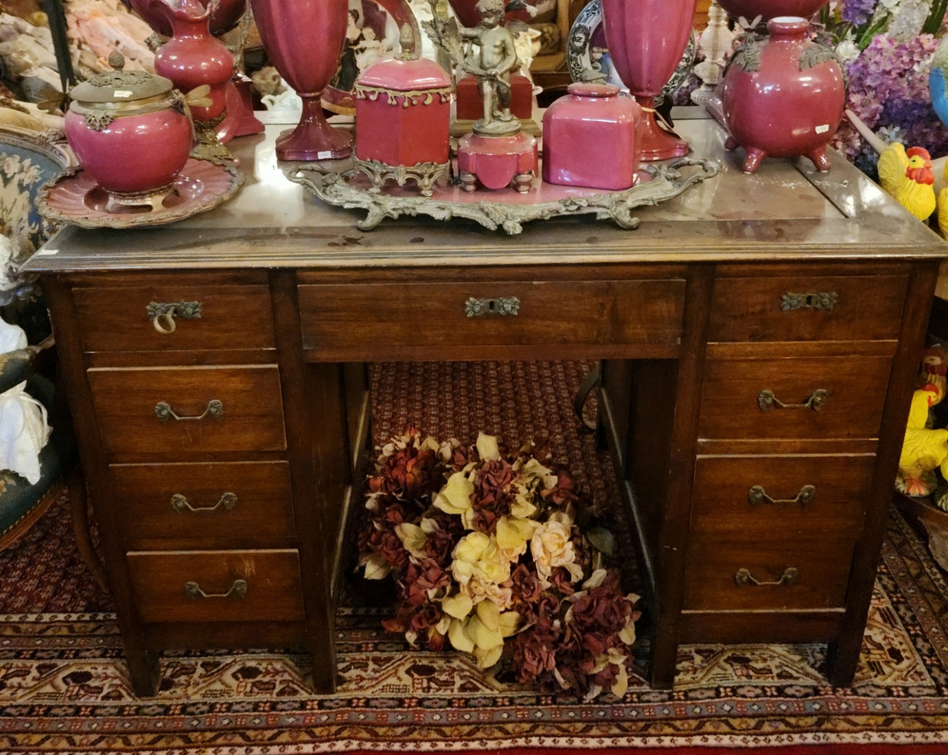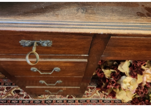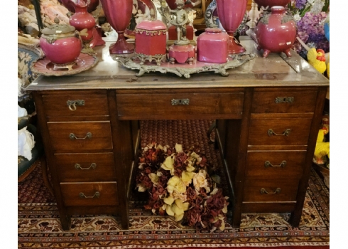 שולחן כתיבה עתיק עשוי עץ ומשטח עליון מחופה זכוכית