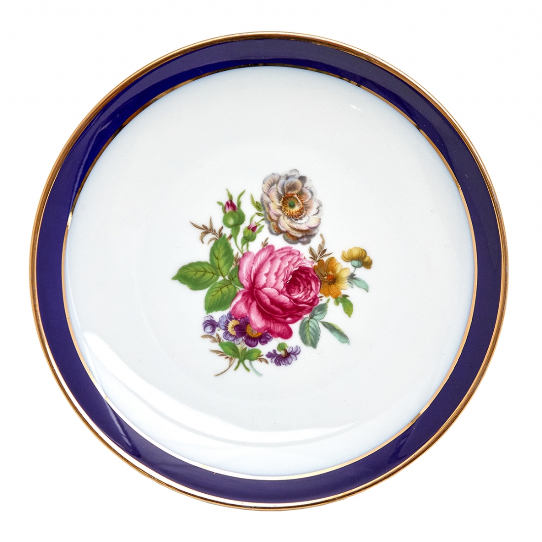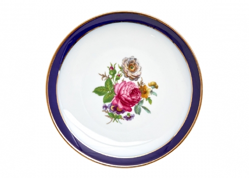 מעוטר בהדפסים פרחוניים ובזהב על רקע אימרת קובלט כחול כהה, חתום