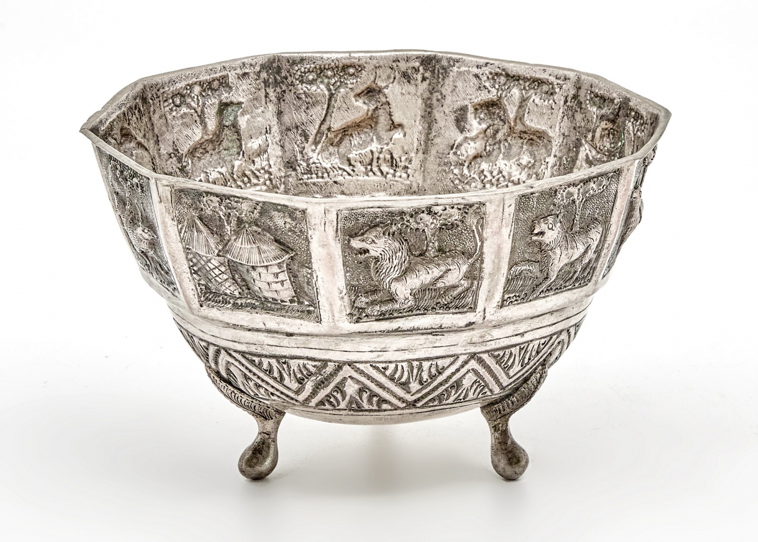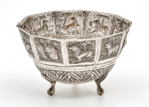 קערה הודית עתיקה עשויה נחושת מרוקעת בעבודת יד ומצופה כסף