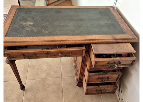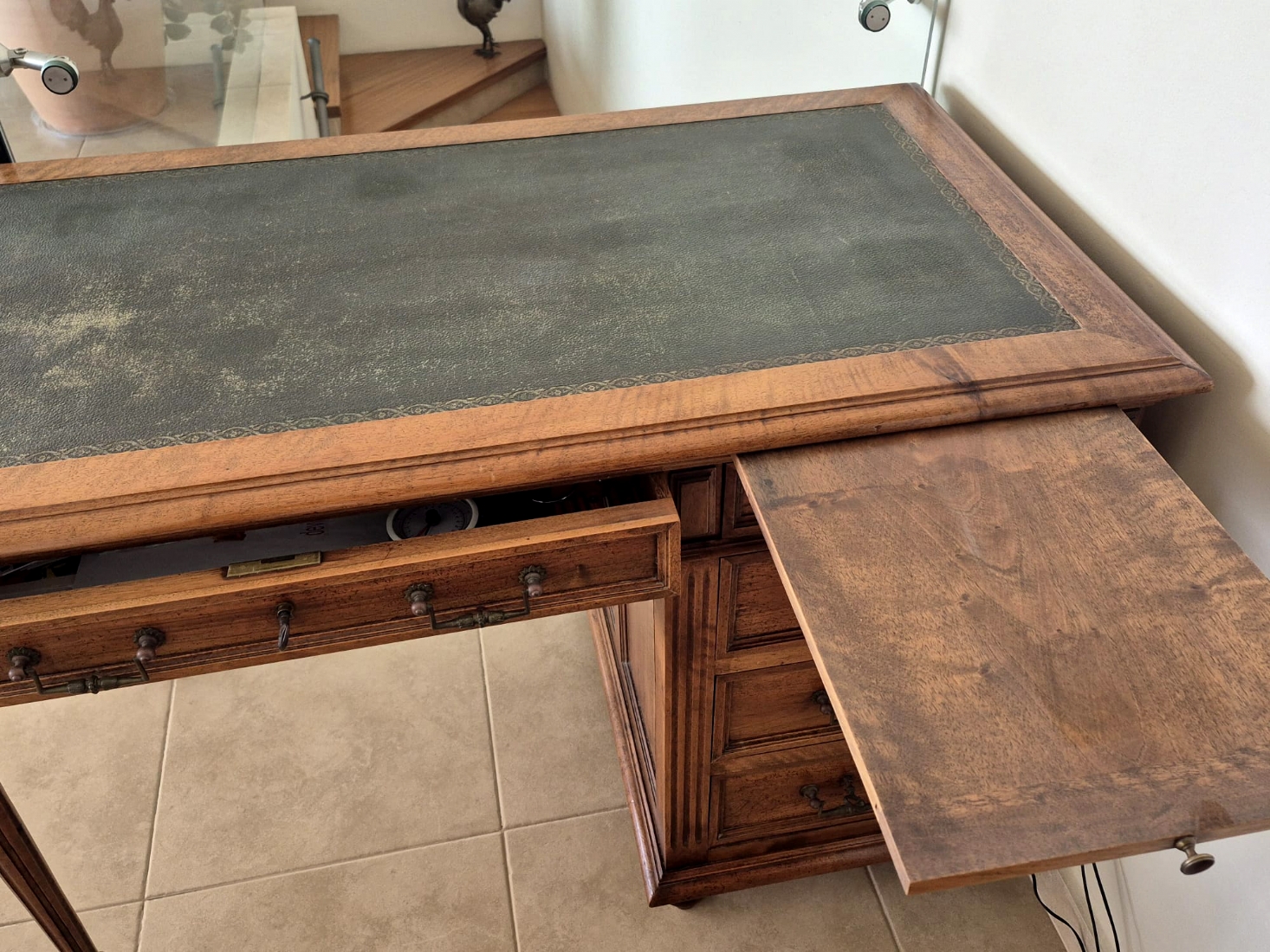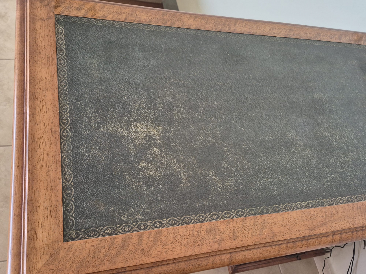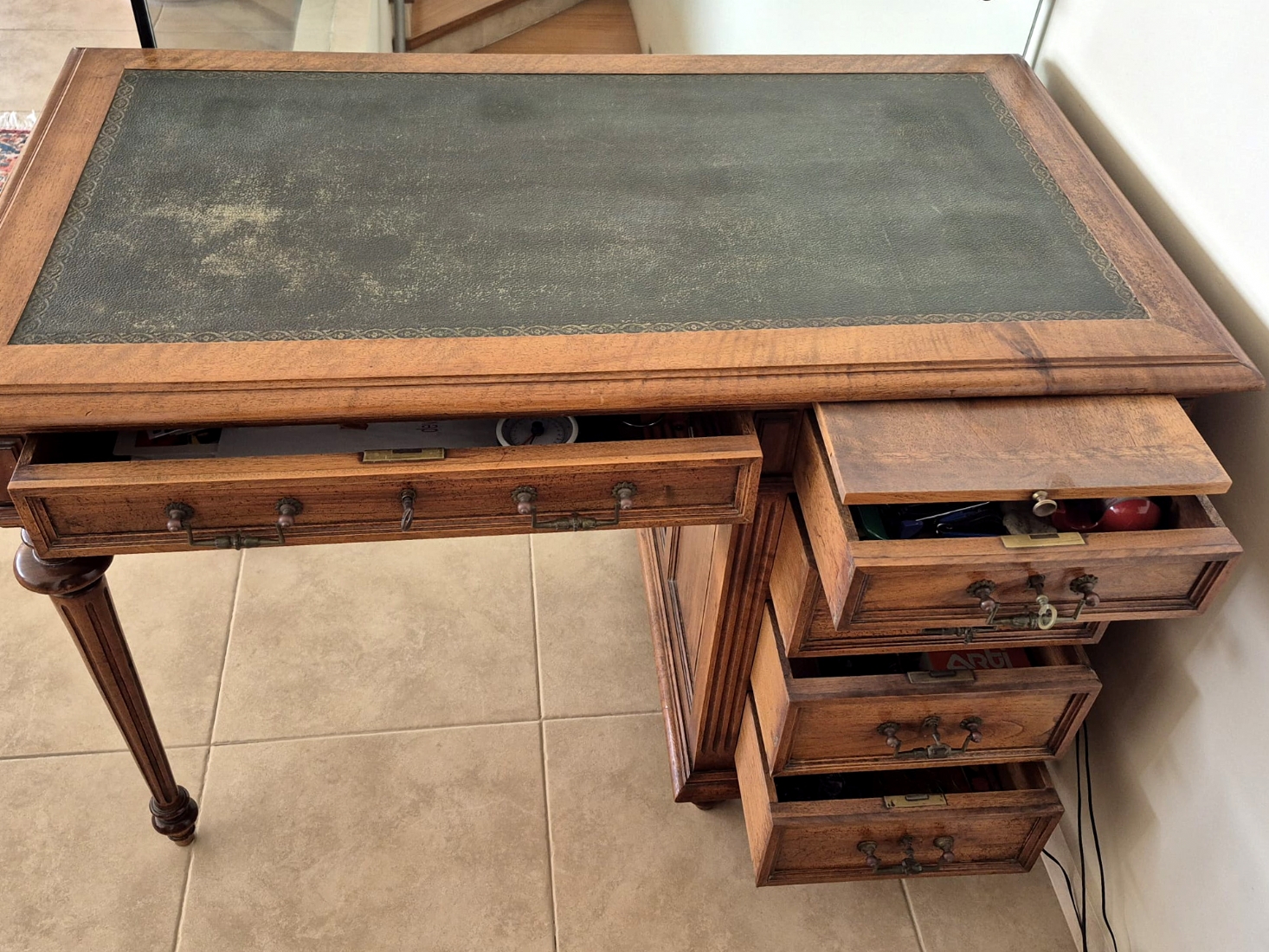 שולחן כתיבה עץ קלאסי עם משטח עליון מצופה עור ירוק מעוטר