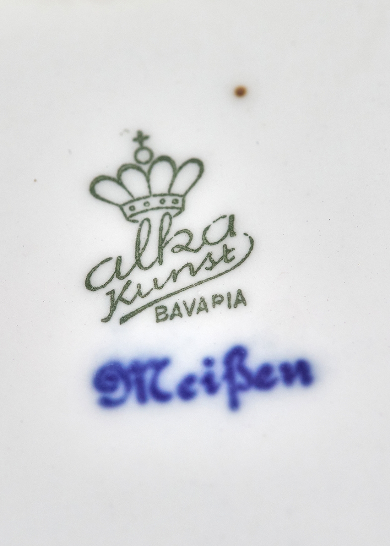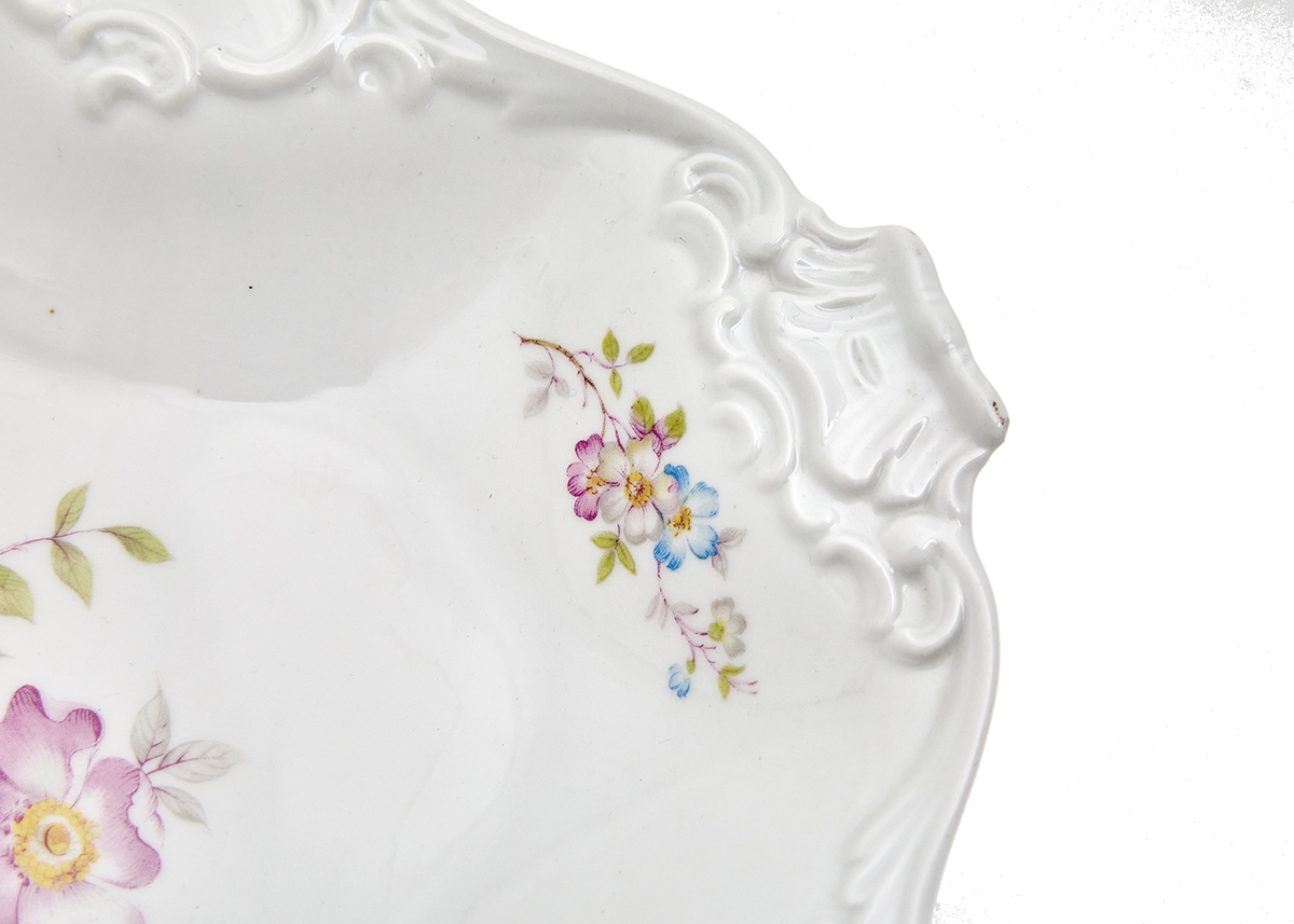 הצלחת המרובעת גרמנית, מתוצרת: 'Alka', מעוטרת בהדפס פרחוני וחתומה, רוחב כולל ידיות: 30.5 ס"מ