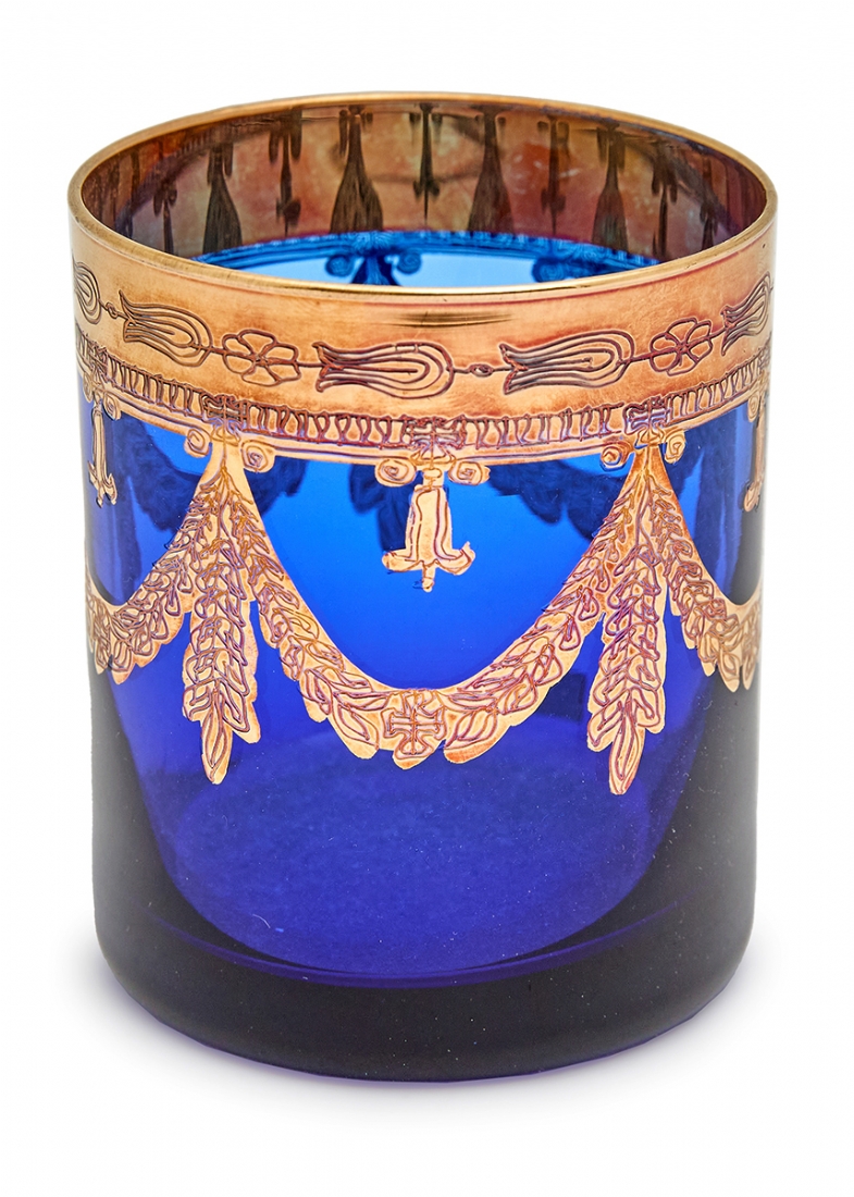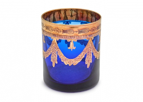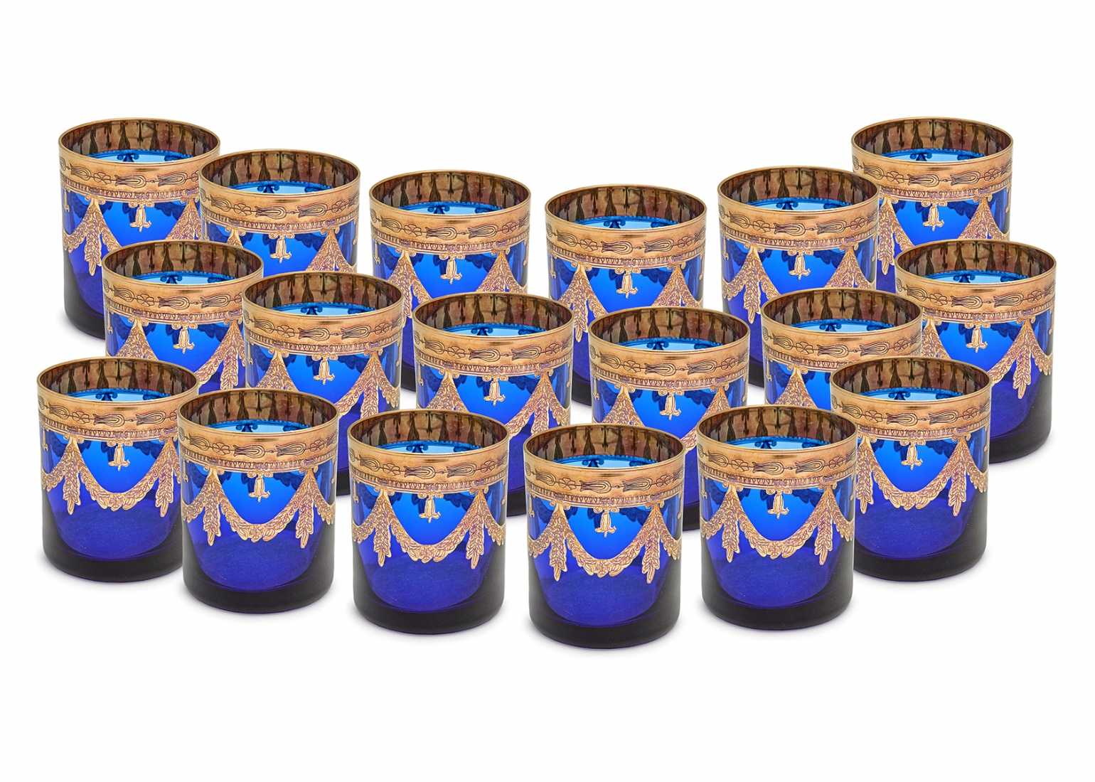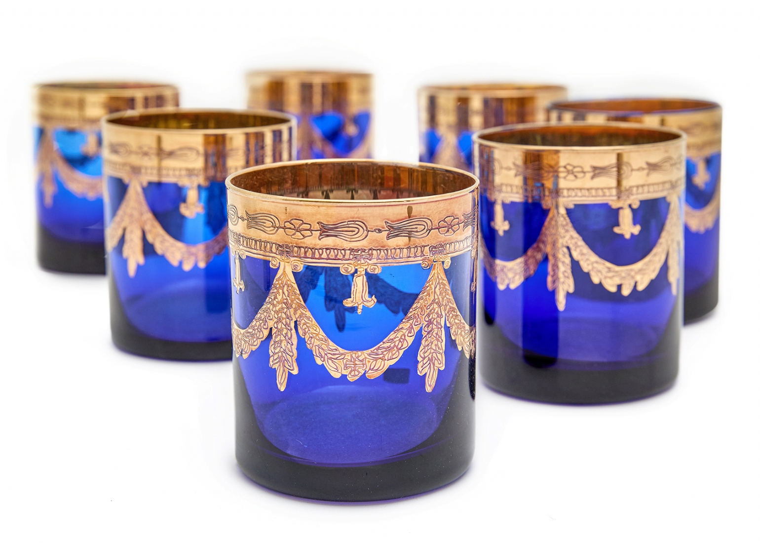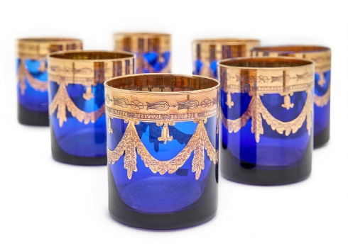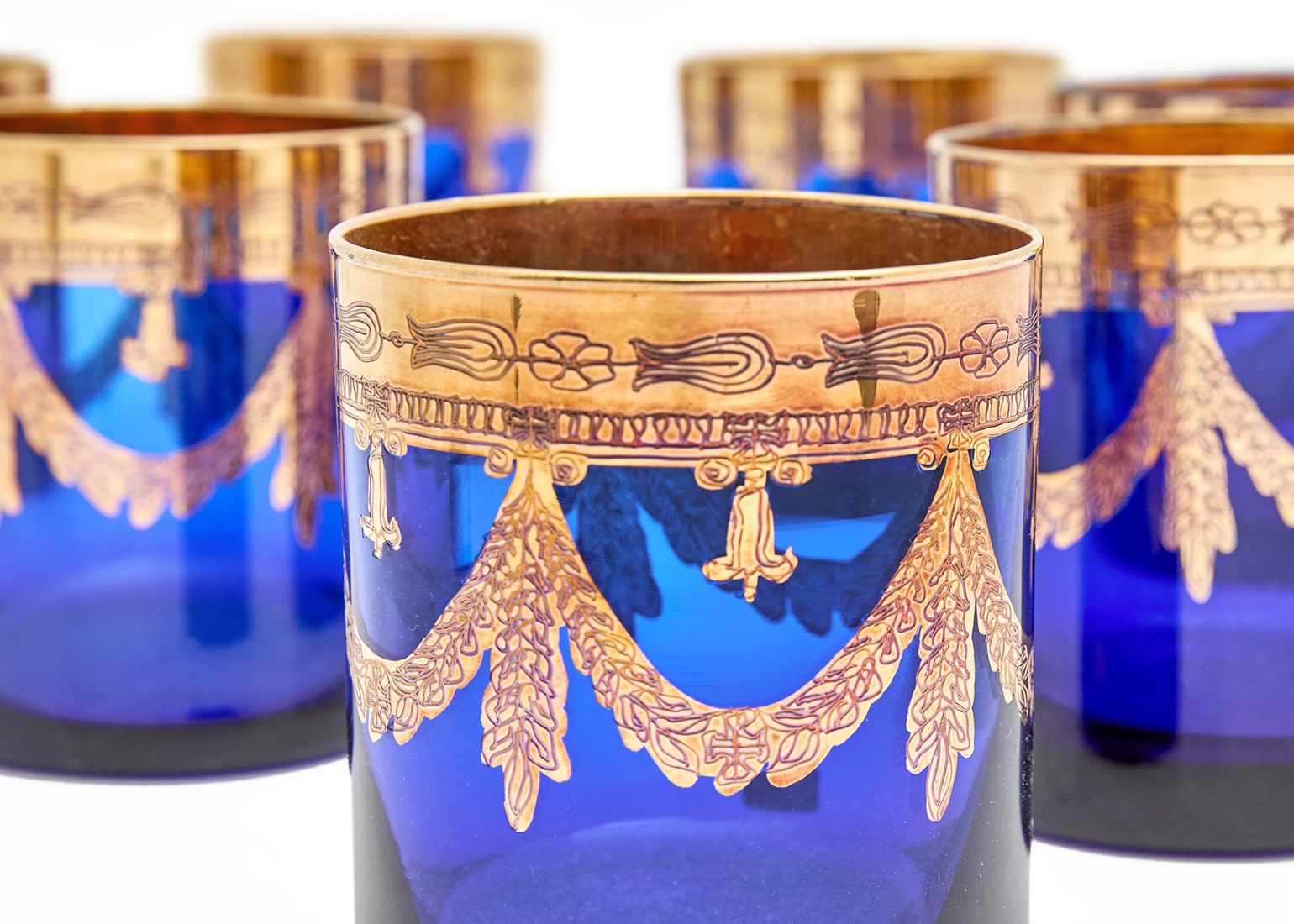 18 כוסות לשתייה קרה עשויות זכוכית קובלט כחולה, ומעוטרות זהב